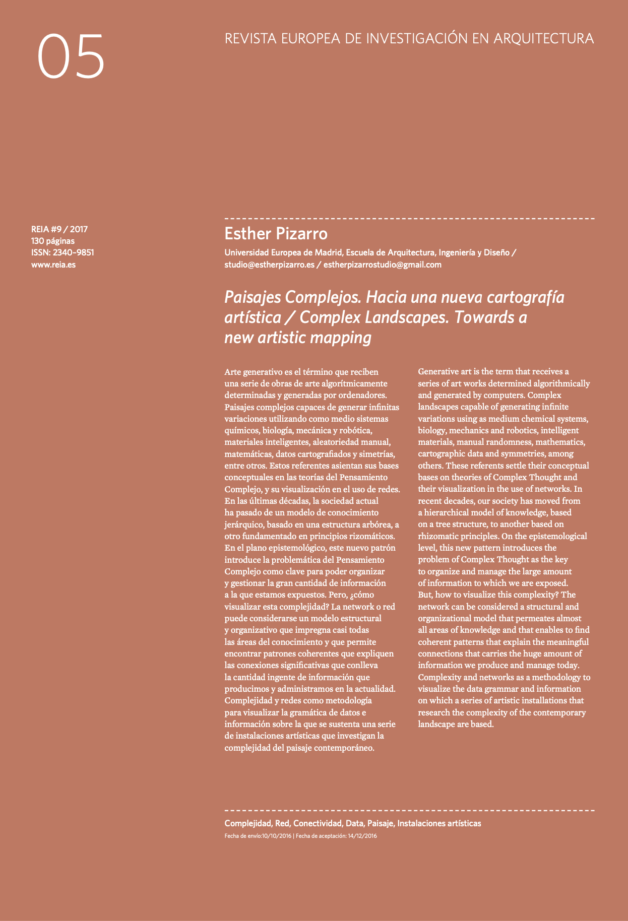 Pizarro Juanas, E. (2017). Paisajes Complejos. Hacia una nueva cartografía artística. Revista Europea de Investigación en Arquitectura REIA, (9), 82-96. Universidad Europea de Madrid. |