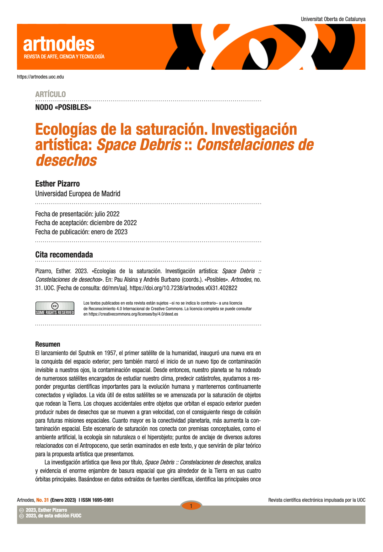 Pizarro Juanas, E. (2023). Ecologías de la saturación. Investigación artística: Space Debris :: Constelaciones de desechos. En P. Alsina & A. Burbano (Coords.), Posibles. Artnodes, (31), 1-10. Universitat Oberta de Catalunya. |