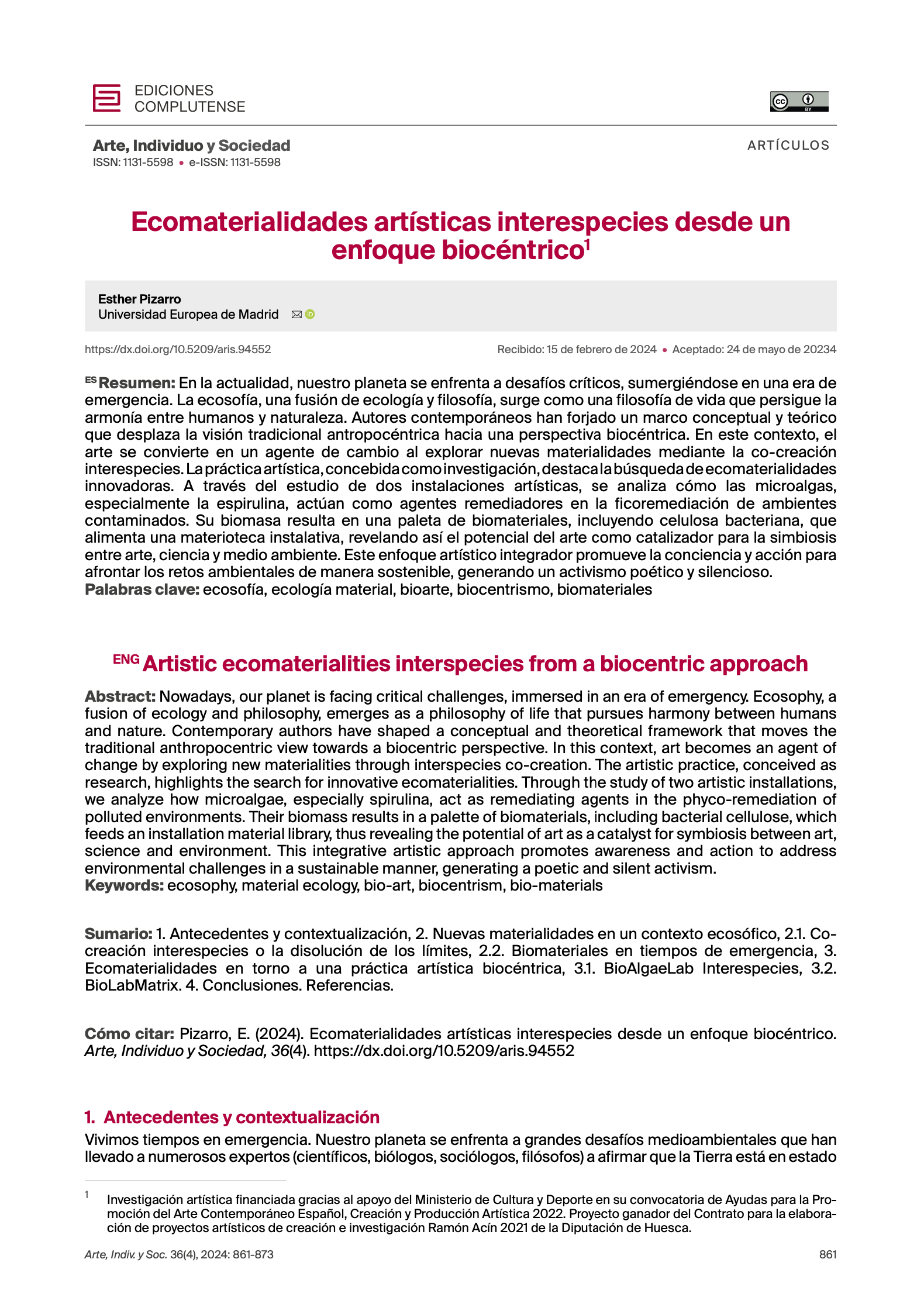 Pizarro Juanas, E. (2024). Ecomaterialidades artísticas interespecies desde un enfoque biocéntrico. Arte, Individuo y Sociedad, 36(4), 861-873. Servicio de Publicaciones de la Universidad Complutense de Madrid. |