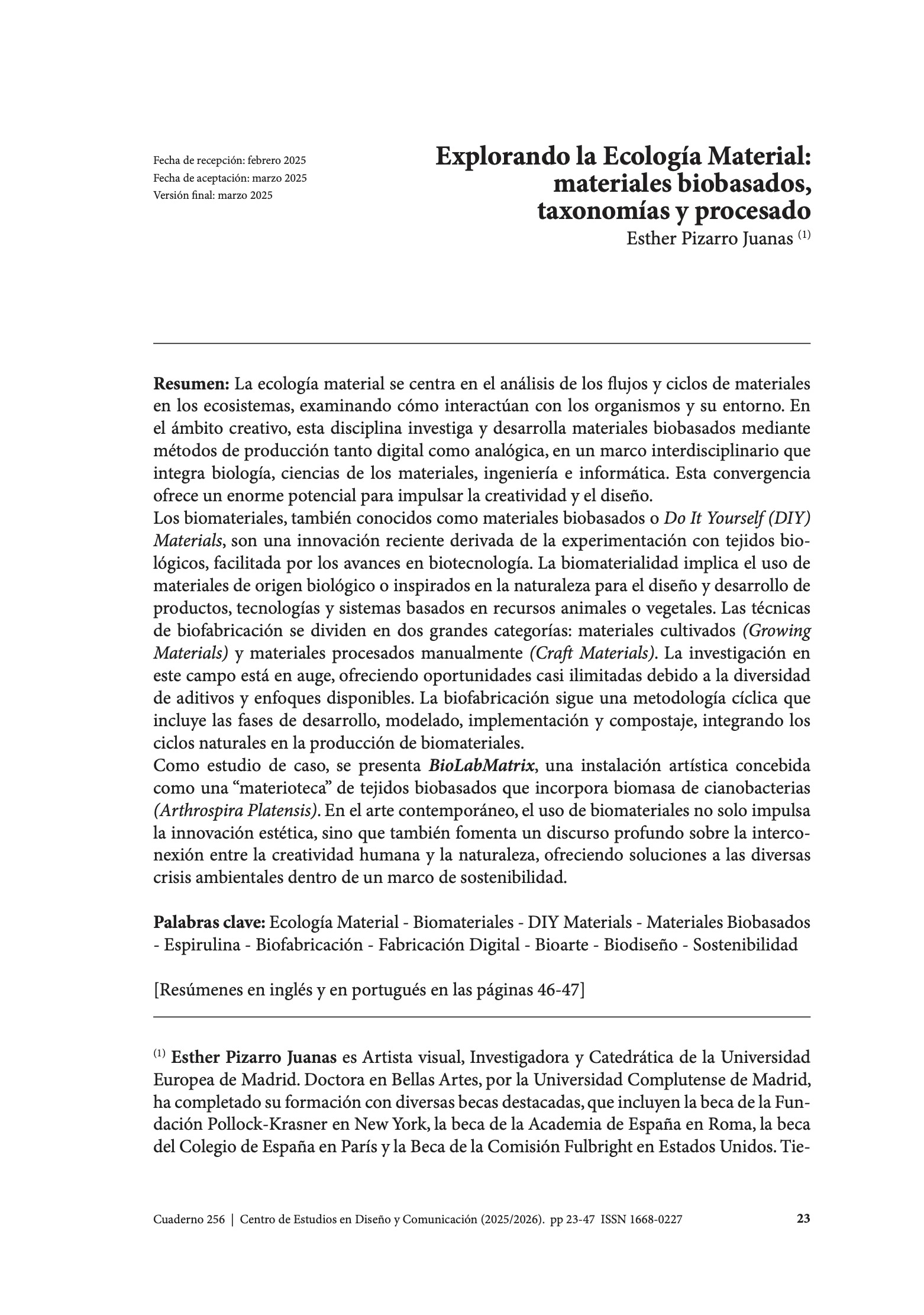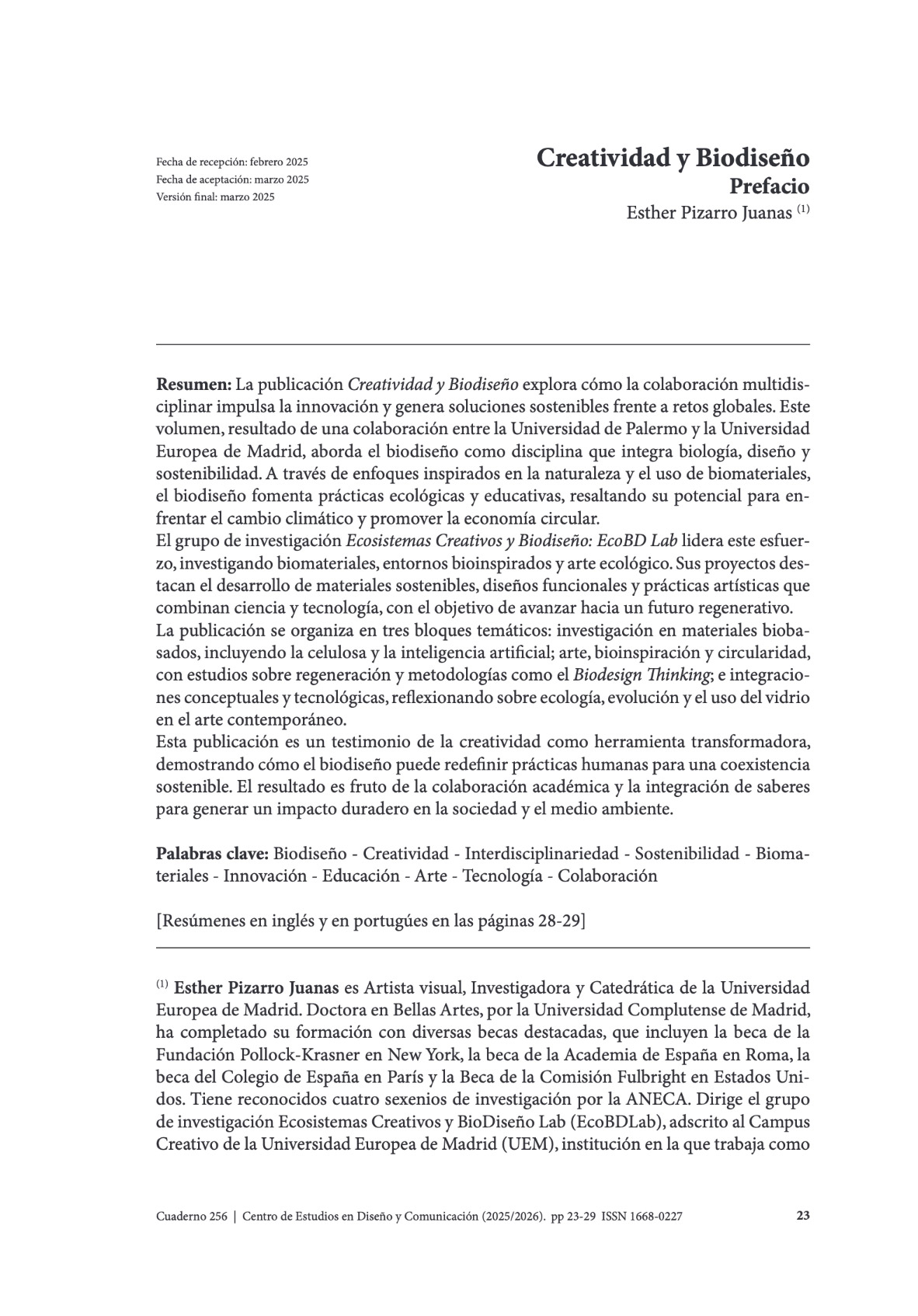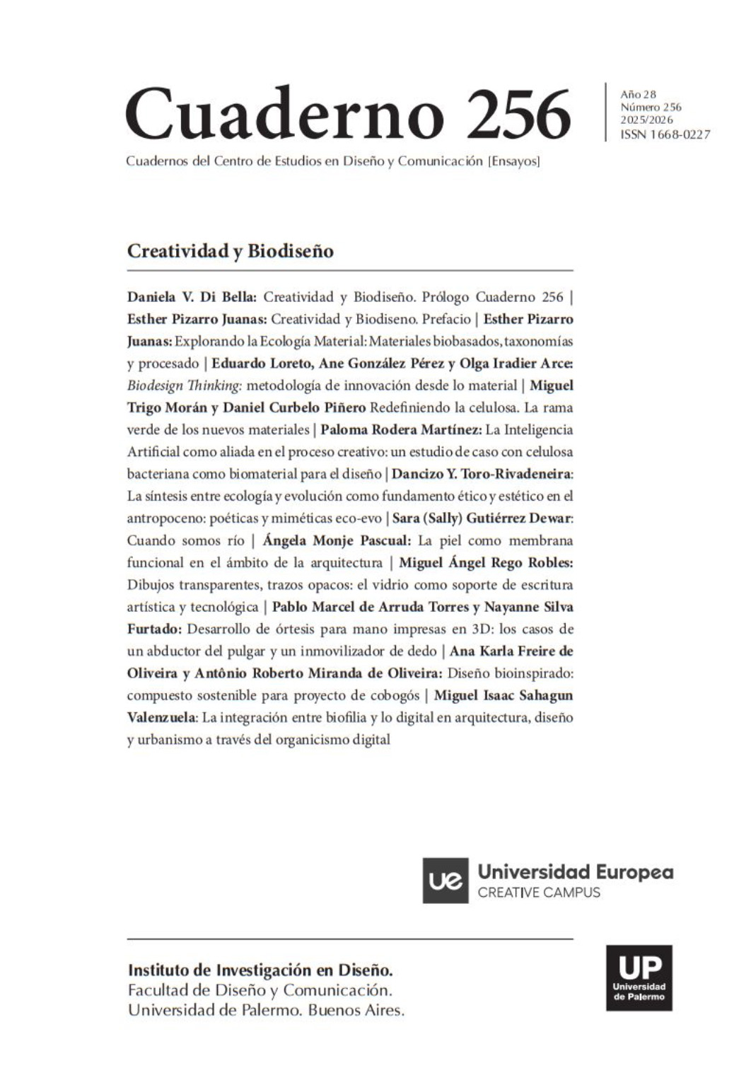Pizarro Juanas, E.; Di Bella, D. (2025). Coordinación de Cuaderno Nº 256. Creatividad y Biodiseño Prefacio. Cuadernos Del Centro De Estudios De Diseño Y Comunicación, (256). https://doi.org/10.18682/cdc.vi256 |