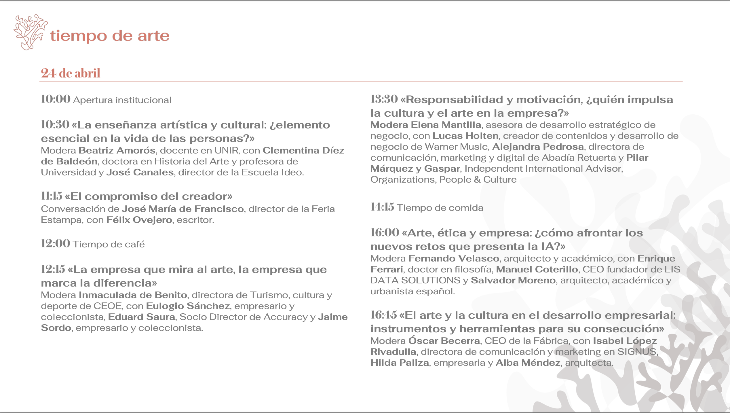 En este III Congreso Tiempo de Arte se reflexionará sobre el papel de los artistas y la gestión cultural en el ecosistema empresarial. Contaremos con artistas, empresarios, académicos, científicos, arquitectos, gestores culturales, consultores financieros, periodistas, humanistas, coleccionistas, docentes y médicos de carácter internacional que nos mostrarán las herramientas tangibles para asumir el reto de la integración del arte y la cultura en todos los ámbitos de la sociedad con el objetivo de fomentar el desarrollo de las capacidades del ser humano.