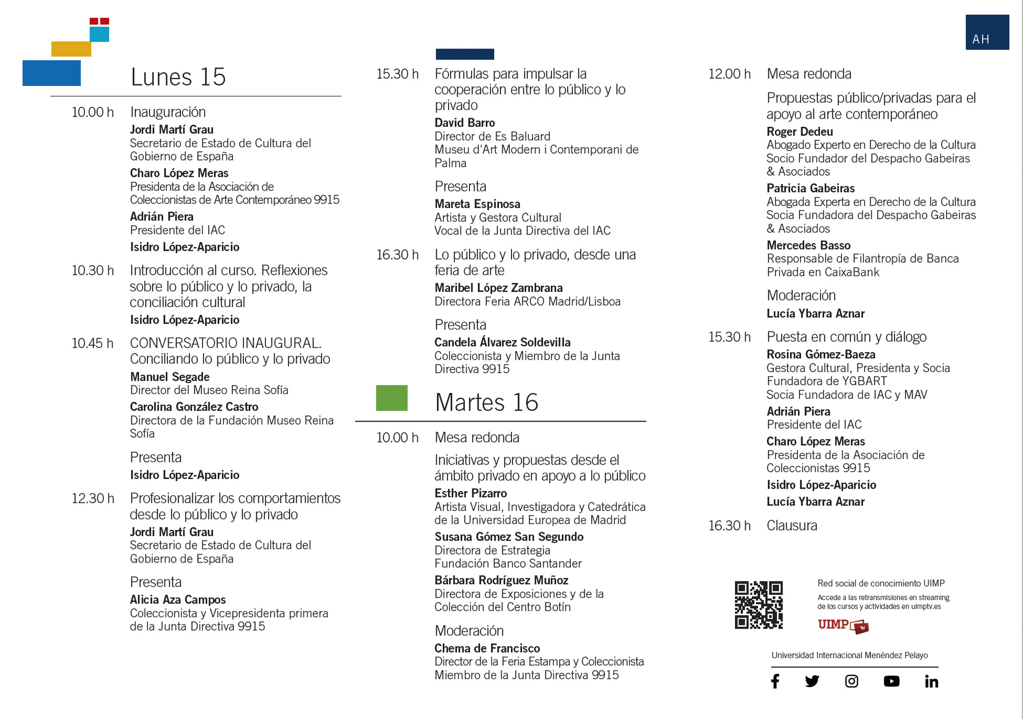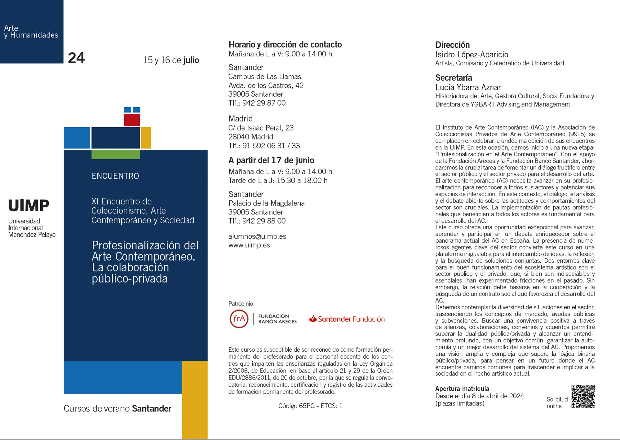 Es un honor participar en el XI Encuentro de Coleccionismo, Arte Contemporáneo y Sociedad. Profesionalización del Arte Contemporáneo. La colaboración público-privada, organizado por la Asociación Coleccionistas Arte Contemporáneo 9915 / Instituto de Arte Contemporáneo, con la colaboración de Fundación Areces y Fundación Banco Santander. El encuentro tendrá lugar los días 15 y 16 de julio, 2024 en la Universidad Internacional Menéndez y Pelayo (Santander).