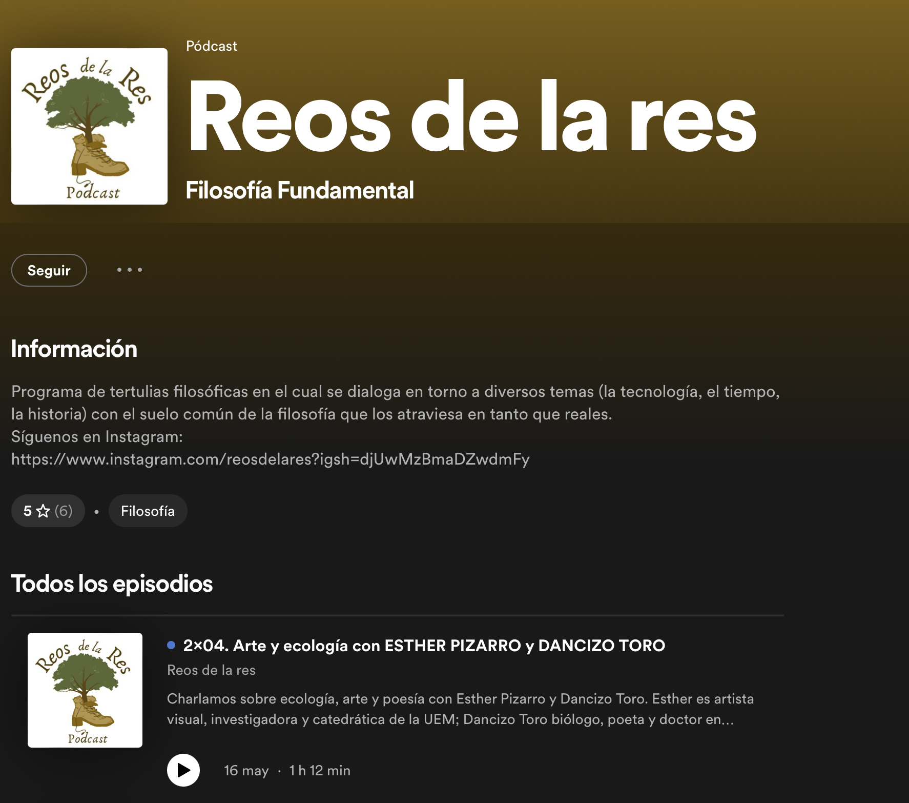 Ya está disponible la grabación del capítulo “2x04 Arte y ecología con ESTHER PIZARRO y DANCIZO TORO” del Programa “Reos de la res. Filosofía Fundamental”. En el Pódcast charlamos sobre ecología, arte y poesía con Esther Pizarro y Dancizo Toro. Esther es artista visual, investigadora y catedrática de la UEM; Dancizo Toro biólogo, poeta y doctor en filosofía. Dialogamos sobre procesos creativos, el cuerpo de la tierra, biocentrismo y antropocentrismo, naturaleza y técnica.