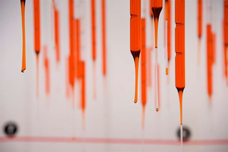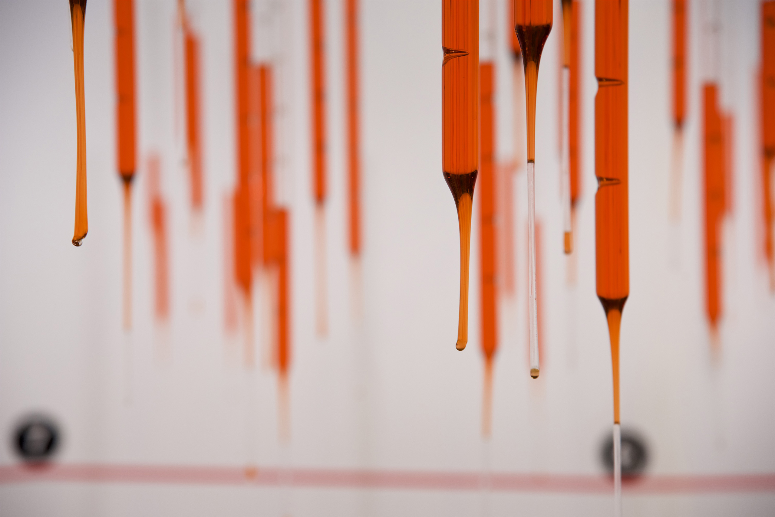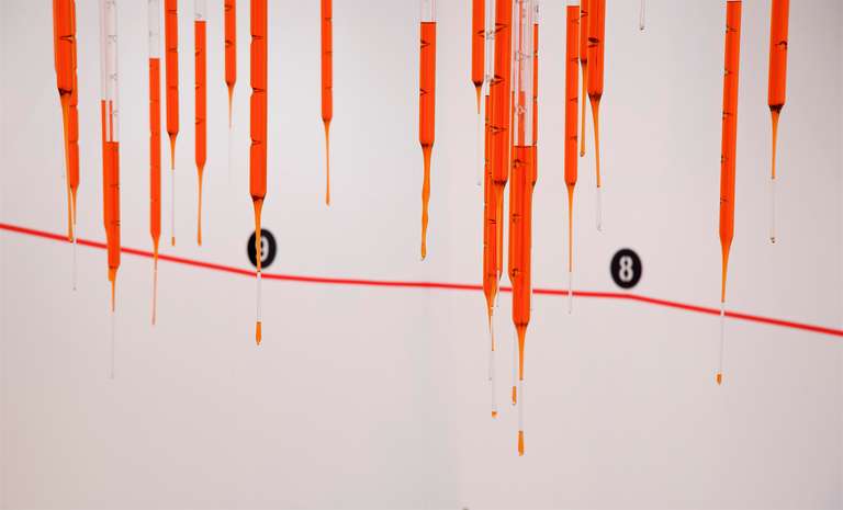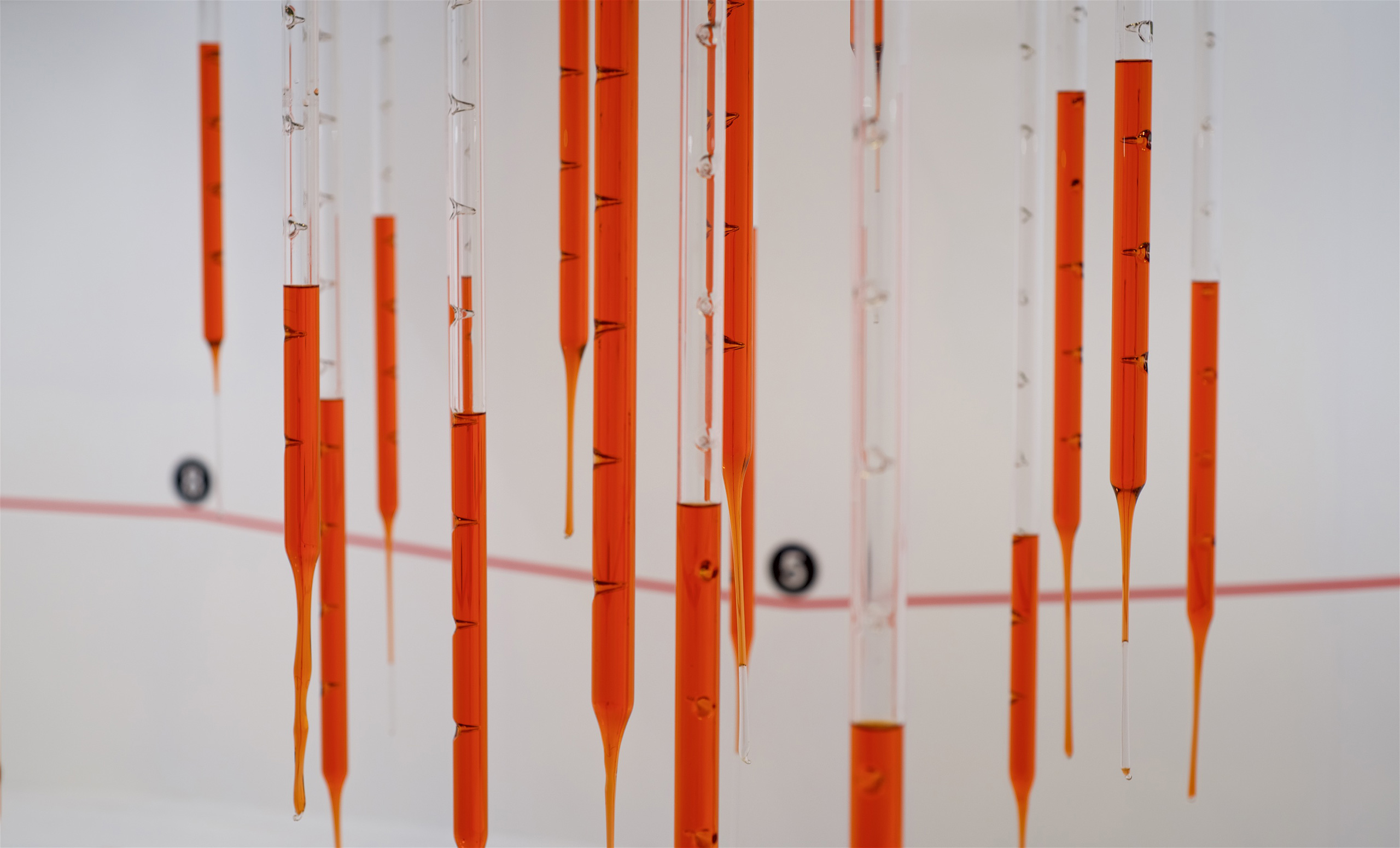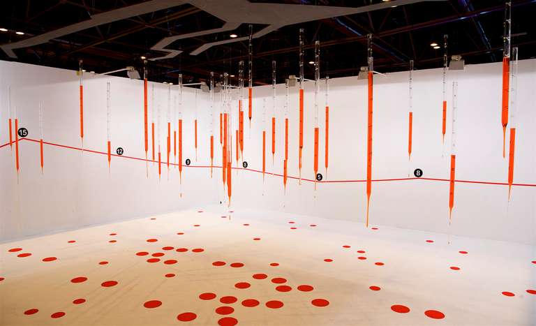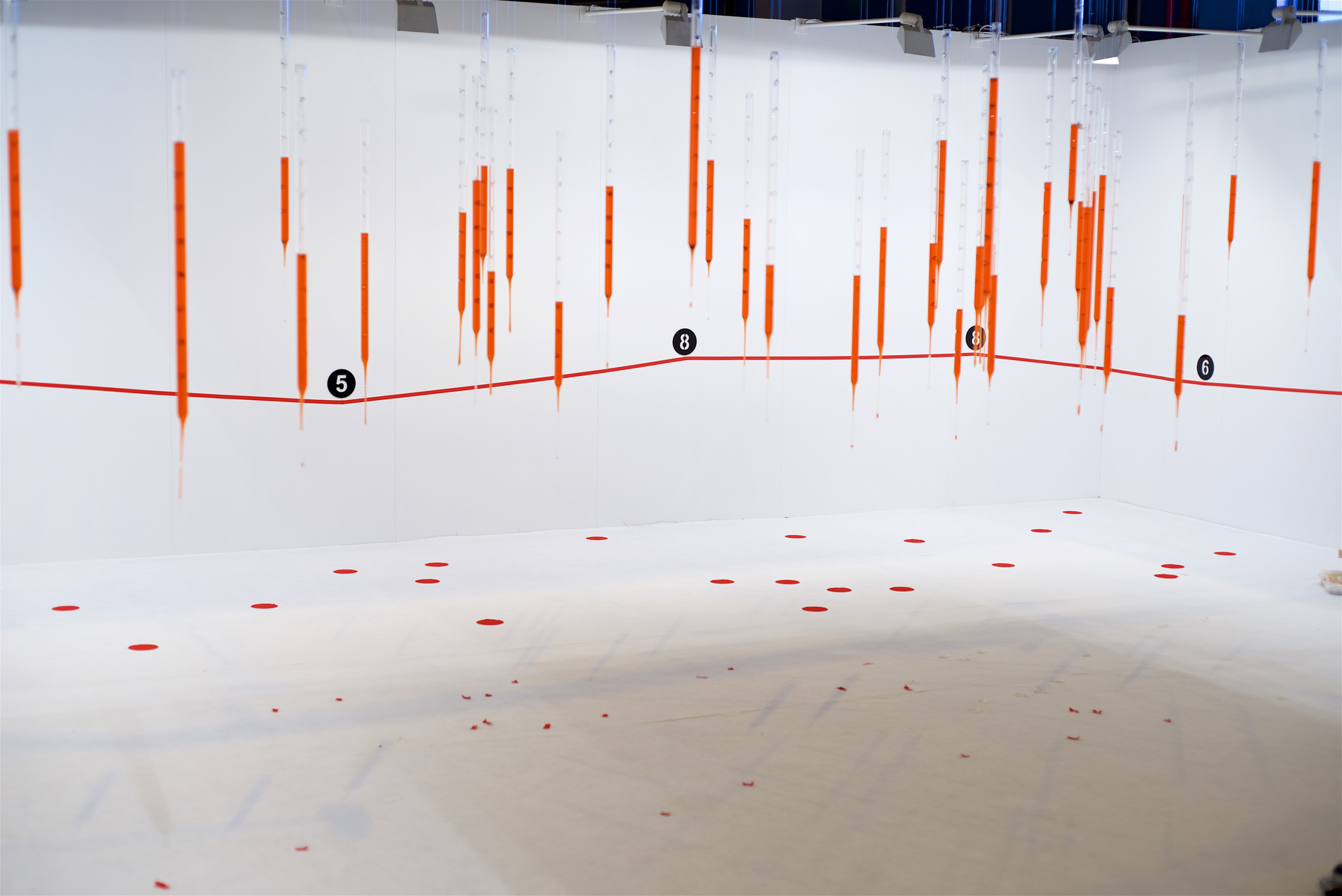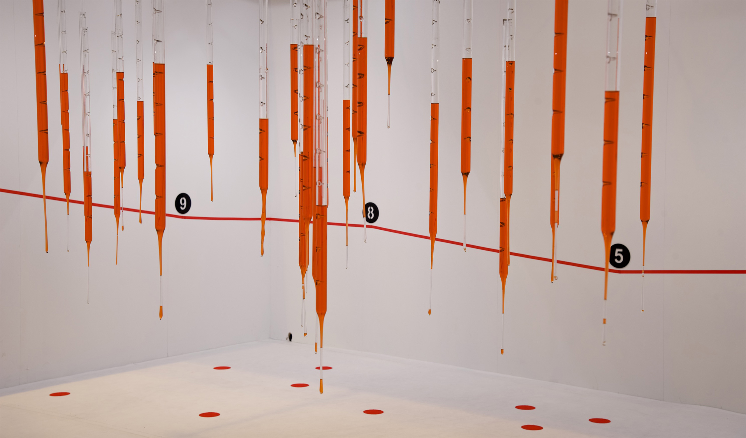 Suspendidas en el espacio, 49 probetas cristalinas, que albergan en su interior un líquido de intenso color rojizo, hacen alusión a los asesinatos clasificados dentro de la tipología de feminicidio íntimo oficial (mujeres asesinadas por un hombre con el que mantenían o habían mantenido una relación). El nivel de líquido de las probetas nos indica el rango de edad de fallecimiento de cada una de estas víctimas, a la vez que evidencia la sangre derramada por estas mujeres.