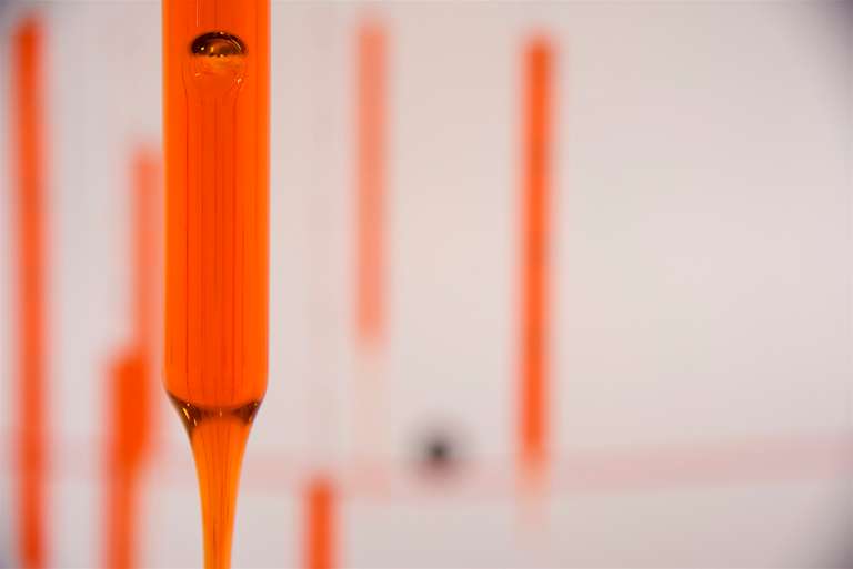 Vidrio de borosilicato, agua coloreada, metacrilato, cinta adhesiva y pigmento