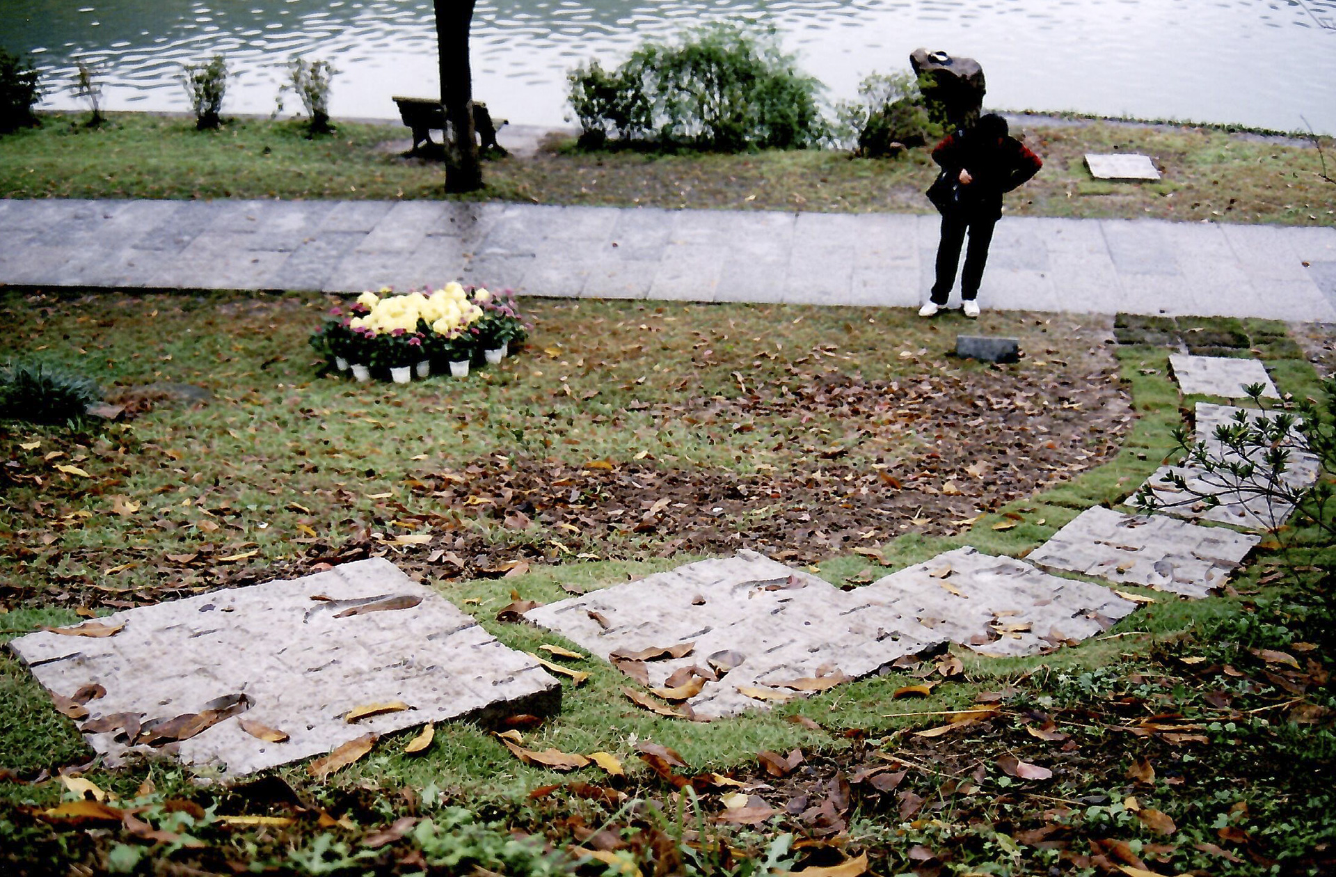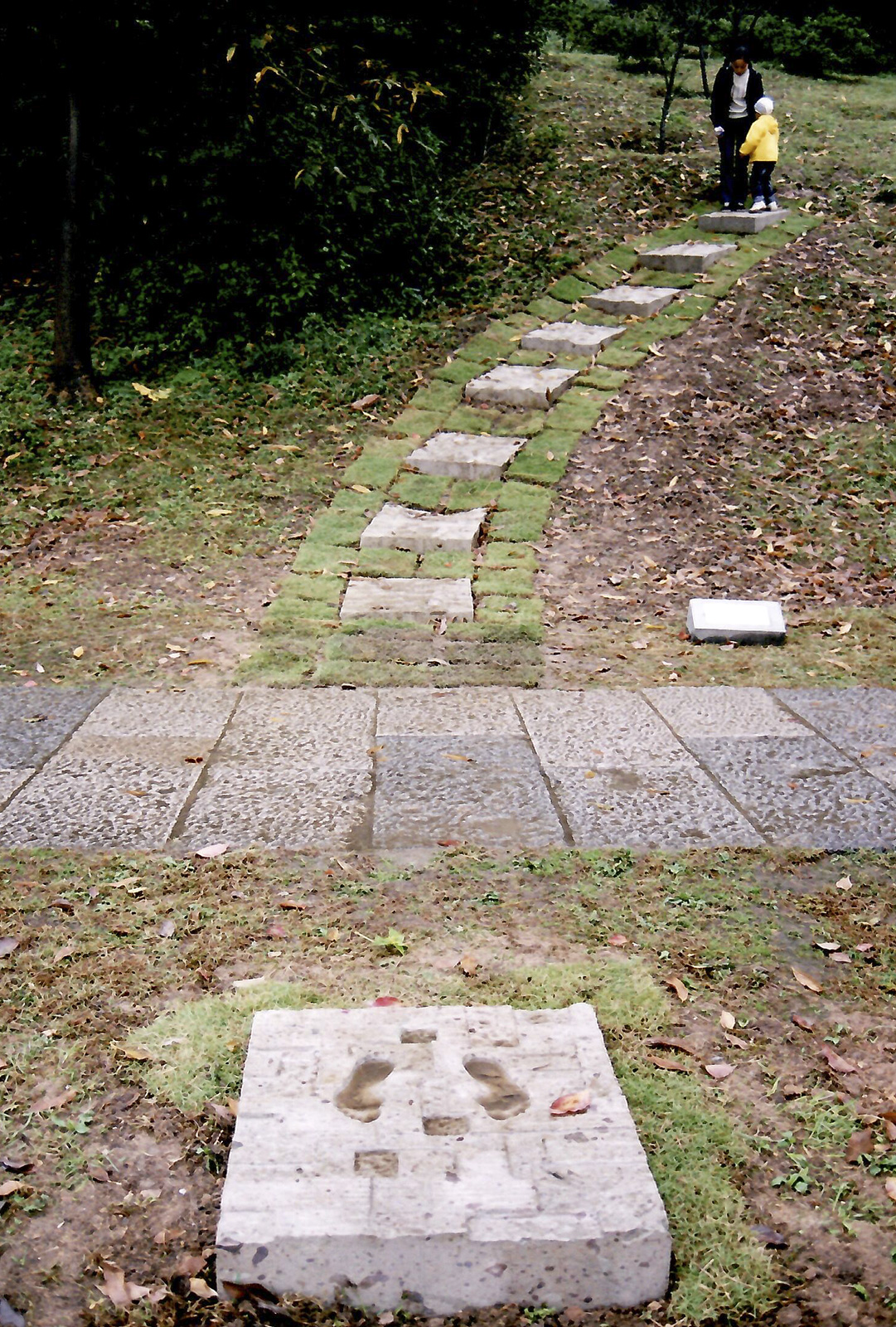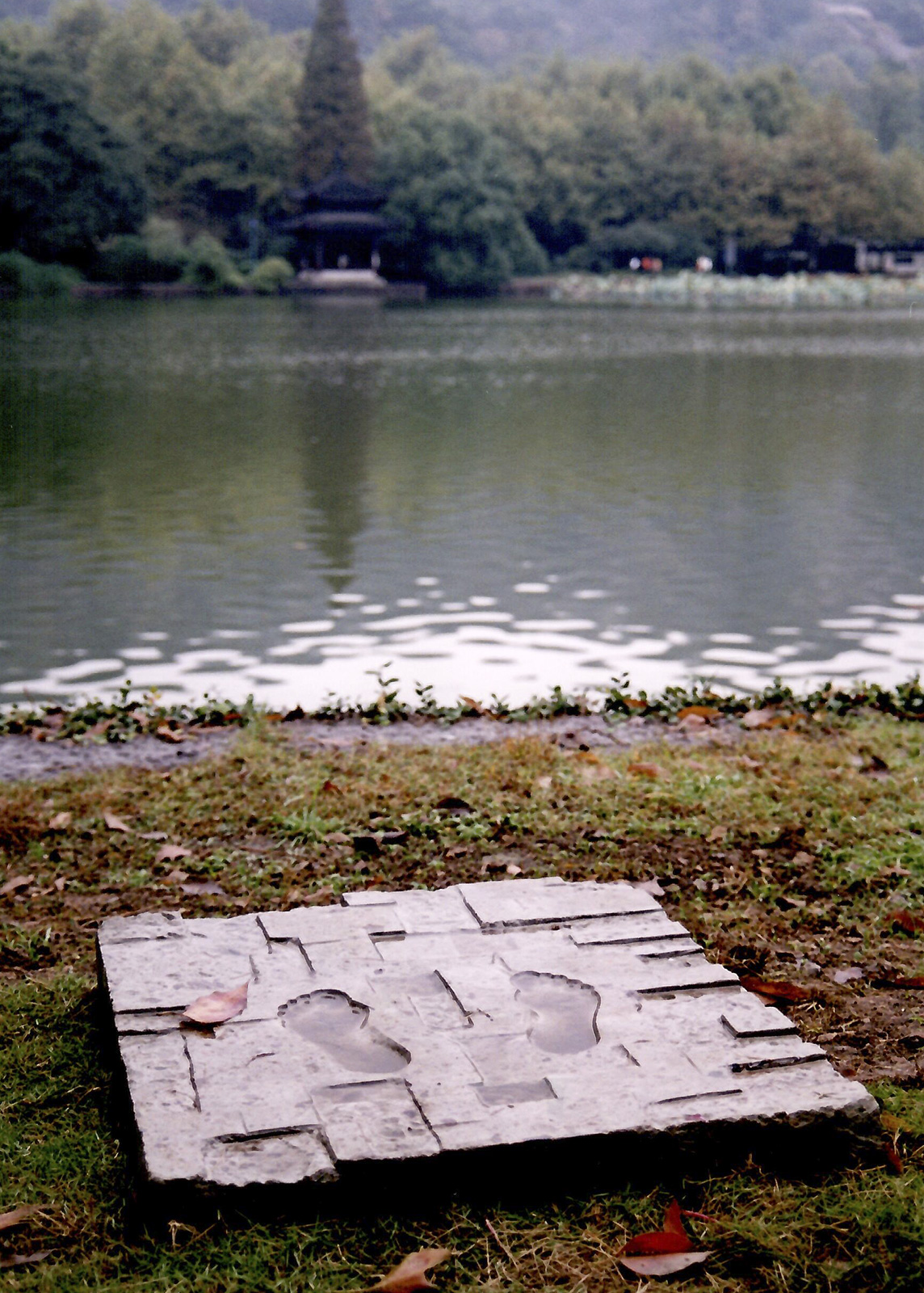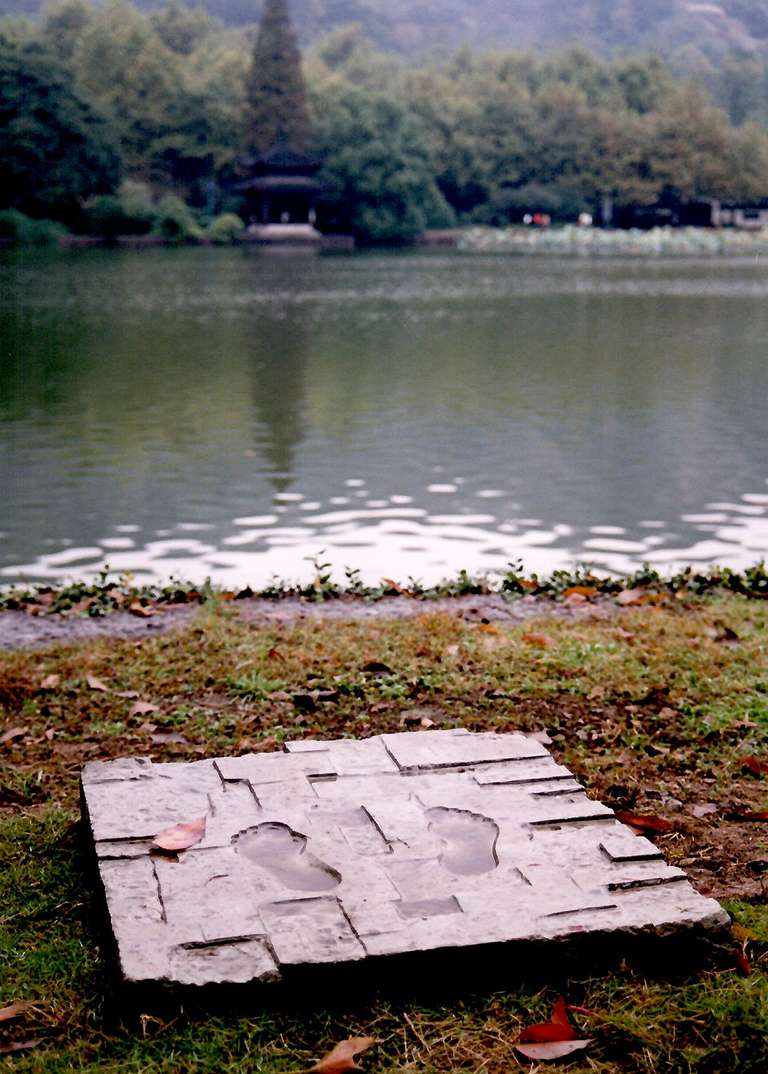 El hecho de caminar es una manera de medir el espacio y el tiempo. Footprints es un gesto solidificado del caminar. Se trata de un memorial anónimo dedicado a todas aquellas personas que han caminado alguna vez en el West Lake, (Hangzhou, China). Es un libro abierto que nos cuenta la memoria de este paisaje. Las huellas que aparecen talladas en las losas de piedra podrían ser las huellas de cualquiera. El interés de este proyecto radica en la necesidad de evidenciar una presencia humana mediante la ausencia de sus huellas. Formalmente, Footprints consiste en nueve unidades de piedra del lugar, en las que aparecen huellas de pie talladas en su superficie. Ocho de estas losas, se encajan en una pequeña colina ascendente, a modo de escaleras, y nos conducen a un espacio superior. En estas losas de piedra las huellas, izquierda y derecha, están desplazadas en una actitud dinámica, invitándonos a caminar. El conjunto se dispone en una especie de curva, adaptándose a las características del entorno. Un camino, que discurre paralelo al lago, separa este grupo de piedras de la novena losa, la cual se ubica a orillas del lago, señalando un punto de vista estratégico para la contemplación de un bello paisaje. En esta piedra, las huellas están talladas en paralelo señalando una posición estática de contemplación y reposo.