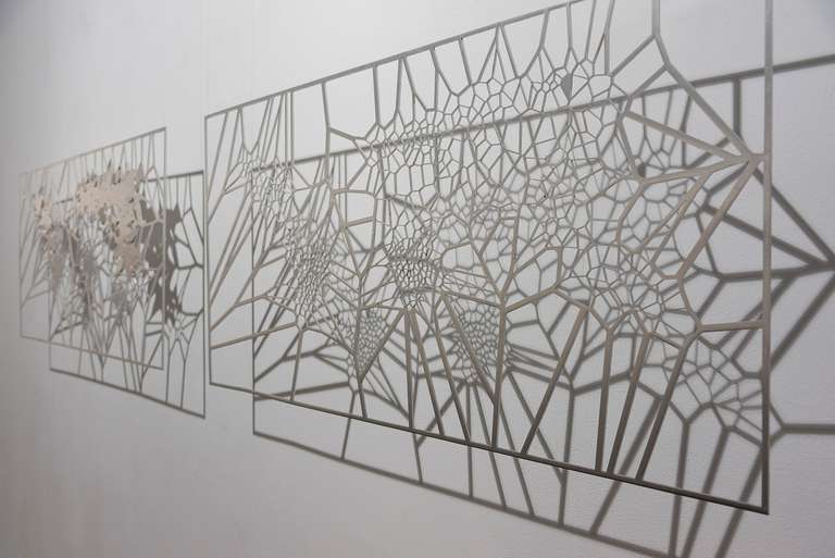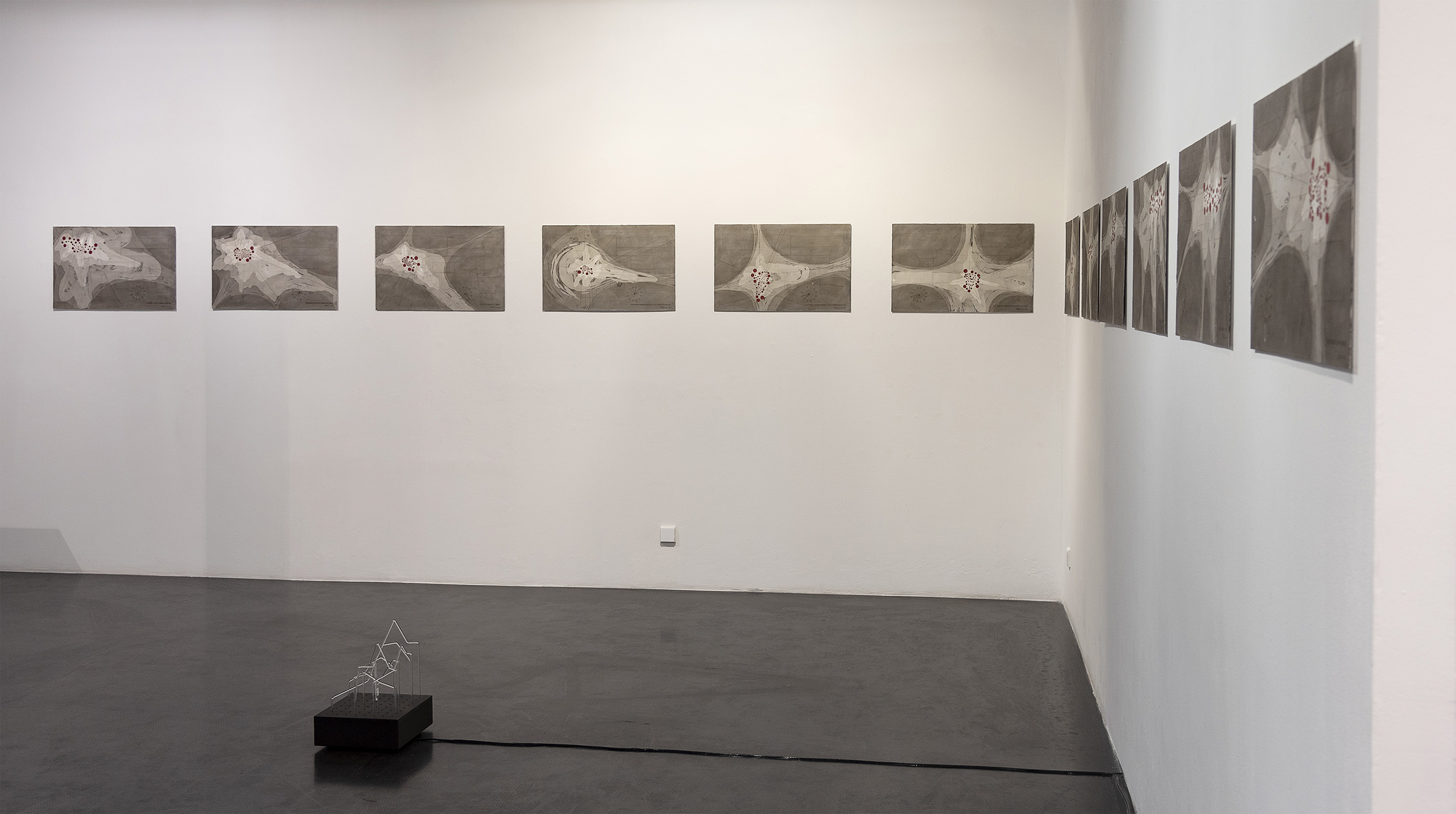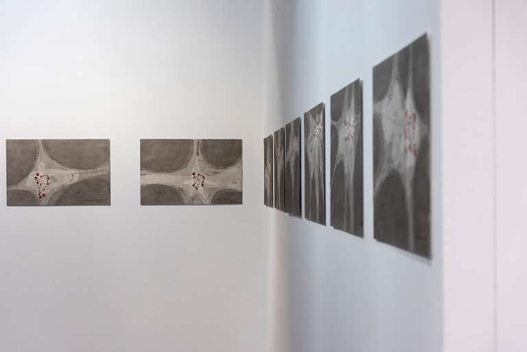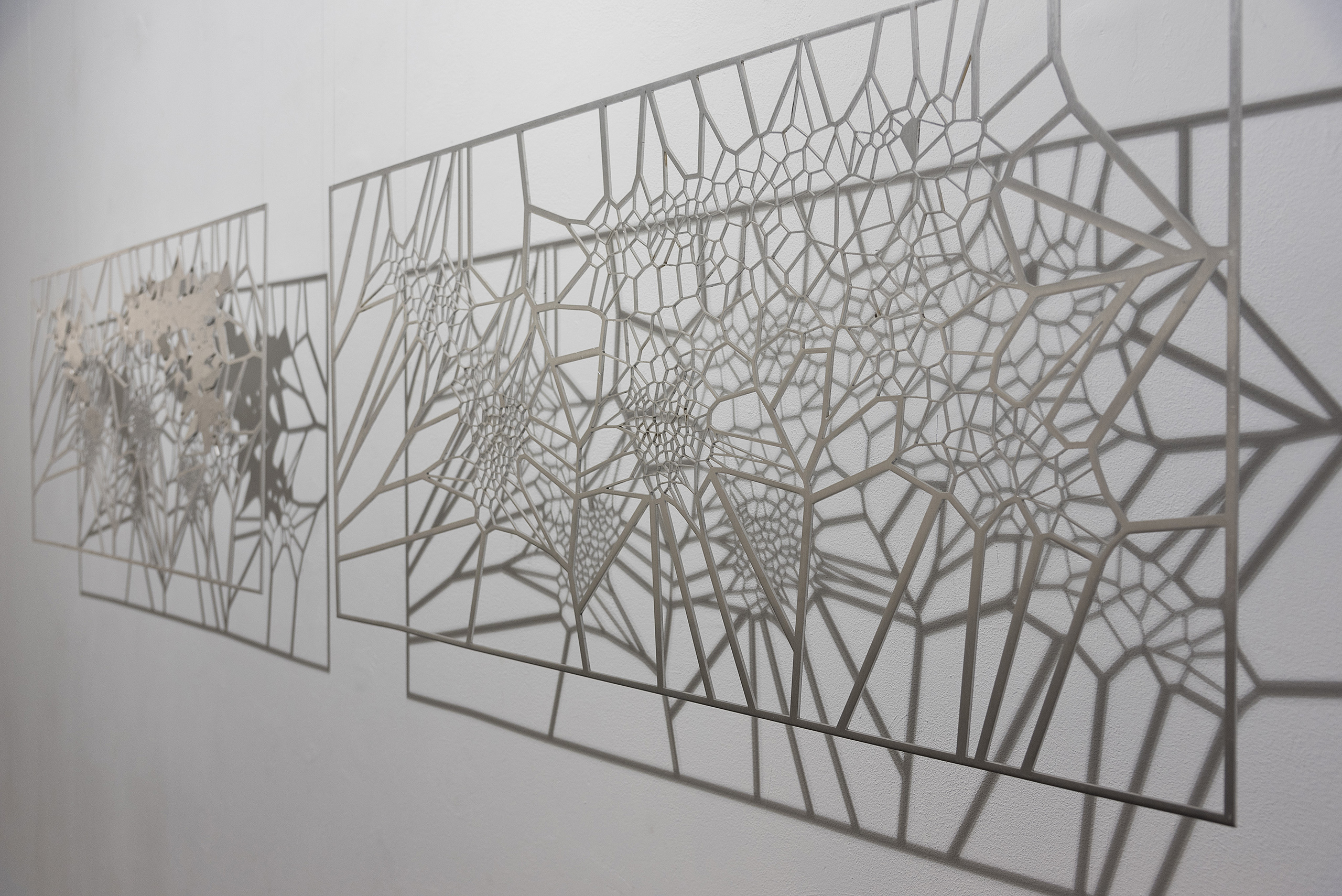 Como continuación de esta línea de trabajo, se presenta en Ponce+Robles la serie [MAFD] :: Drawings , un conjunto de catorce dibujos donde cada uno de ellos atiende a una zona geográfica del planisferio terrestre, según la división espacial de (GFED) Global Fire Emissions Database. Se trata de unas cartografías diagramáticas, sustentadas en el principio del Diagrama de Voronoi, un tipo de geometría computacional generativa que se basa en el concepto de distancia de métrica euclídea. A partir de la identificación en las imágenes extraidas del Moderate Resolution Imaging Spectroradiometer (MODIS) de los centroides, origen de focos de incendios, se generan los diferentes patrones geométricos. La celosía geométrica resultante en cada cartografía, nos da una idea de las zonas afectadas por los grandes incendios y del agrupamiento o dispersión de la emisión de CO2 . A mayor concentración de incendios y gases (centroides), se origina una celda más cerrada; y a mayor dispersión de focos de incendios, mayor es el tamaño del área resultante. Una cartografía basada en la lógica de visualización del “mapa de densidad de puntos” donde cada círculo rojo representa el foco de un área devastada por el fuego. En un segundo nivel se encuentran el resto de áreas geográficas que componen el planisferio terrestre, únicamente identificadas por un rectángulo que perfila su área de extensión. La aportación de datos se refuerza con un gráfico radial, donde aparece indicado un promedio de la cantidad de incendios por mes en el área geográfica tratada.