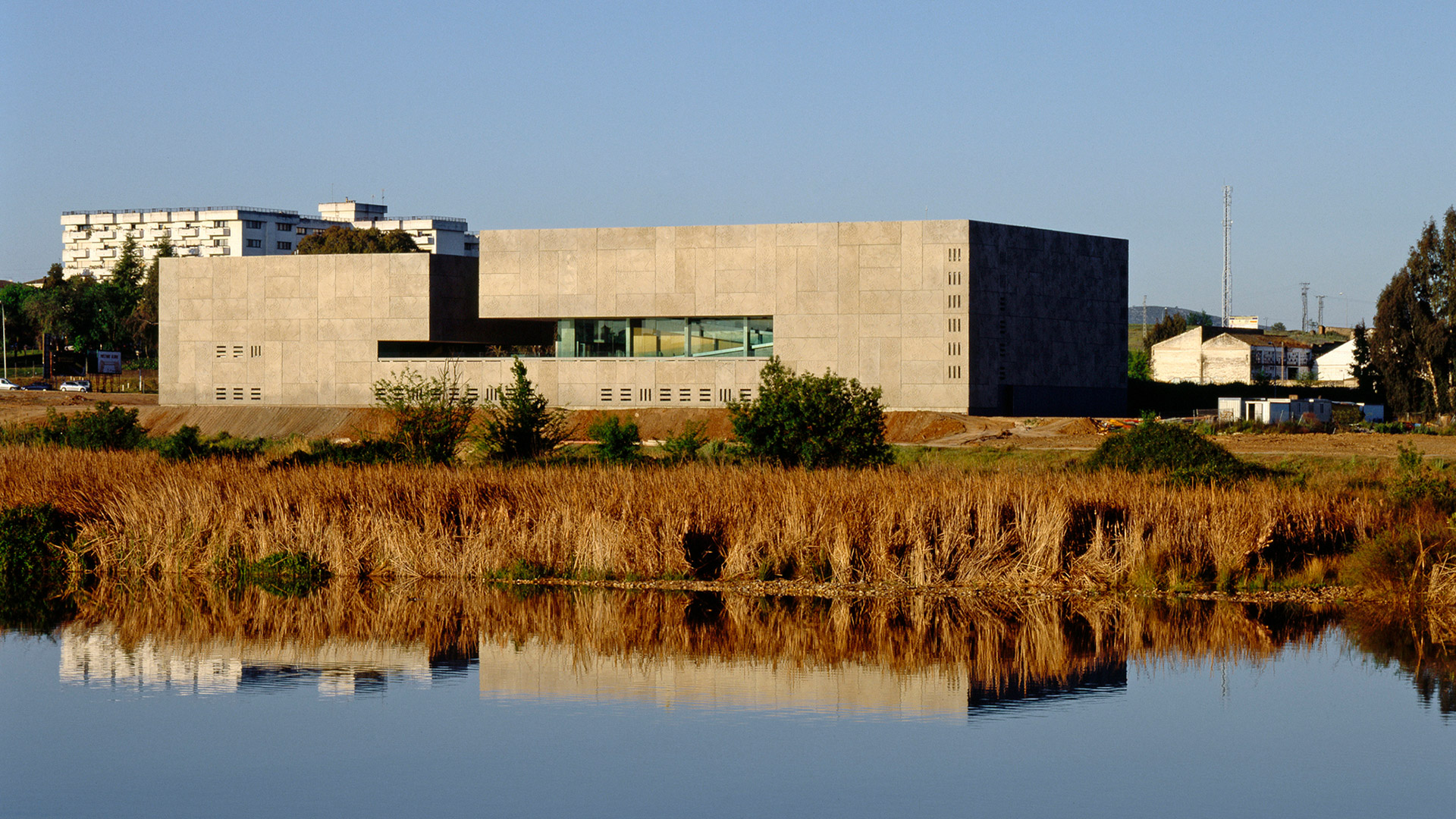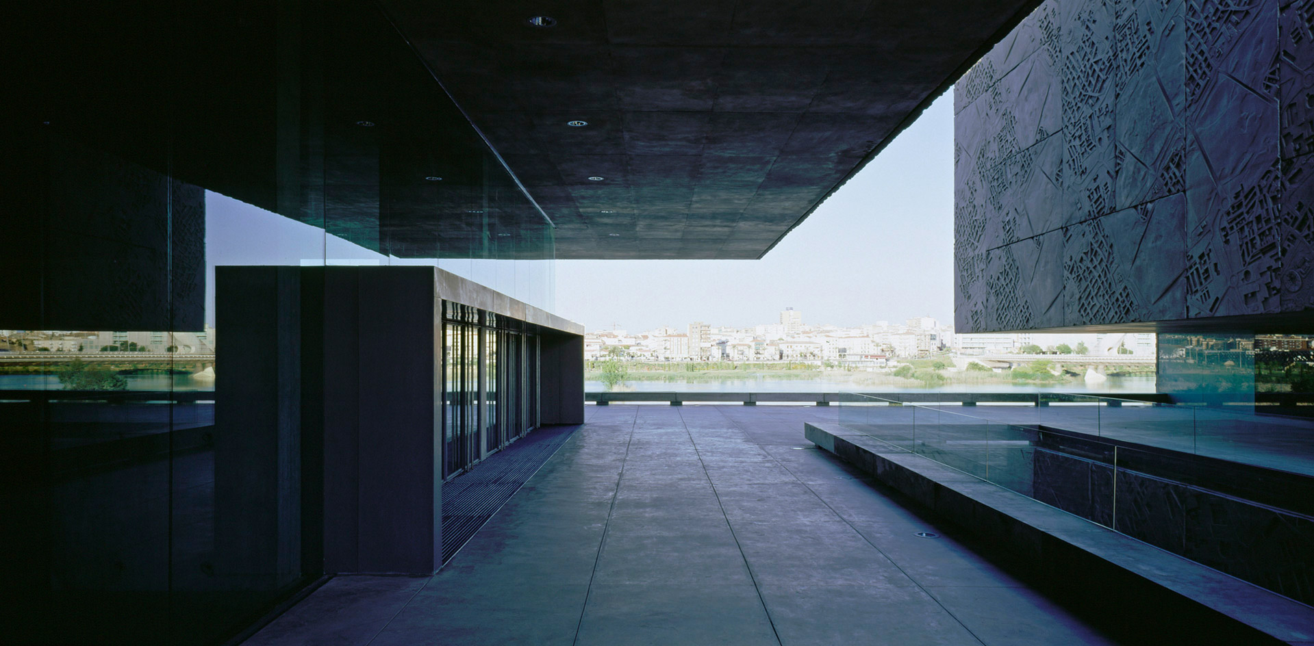 The Palace of Exhibitions and Congresses of Merida has been conceived by the architects as a unitary piece, emptied inside, to form a new public space: a large raised terrace that overlooks the city and articulates the functional elements of the building. Located on the western bank of the Guadiana, between the railroad and Calatrava bridges, it overlooks the river and the city. Special attention has been paid to the artistic treatment and the material used to construct the building's enclosure, not only because it fundamentally characterizes its image, but also because it constitutes an essential part of the project's argument. Like the opus incertum of Roman masonry, the heavily textured and pigmented concrete will manifest a rough and rugged face on the outside, contrasting with the metallic and glass finish of the two boxes corresponding to the auditoriums.