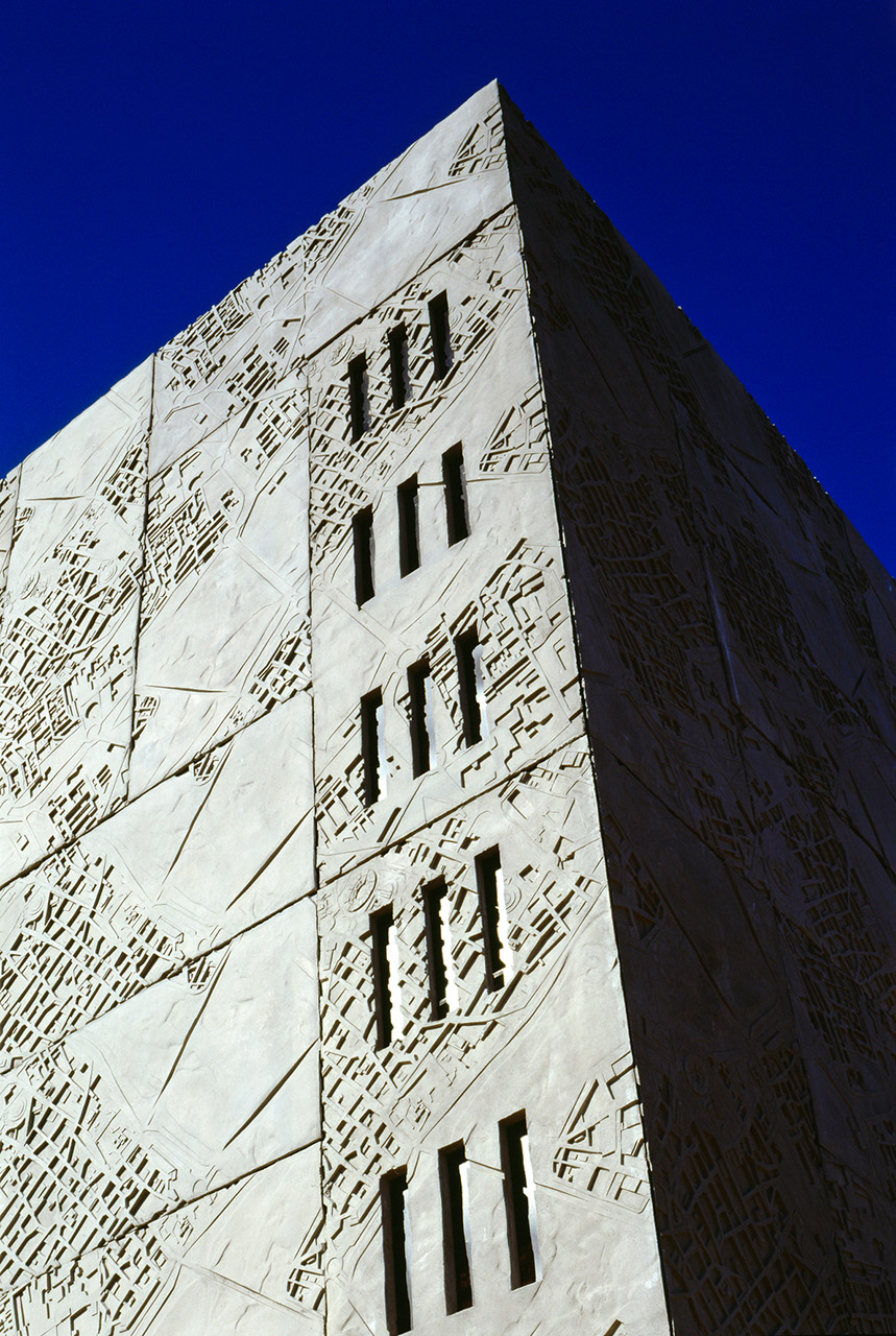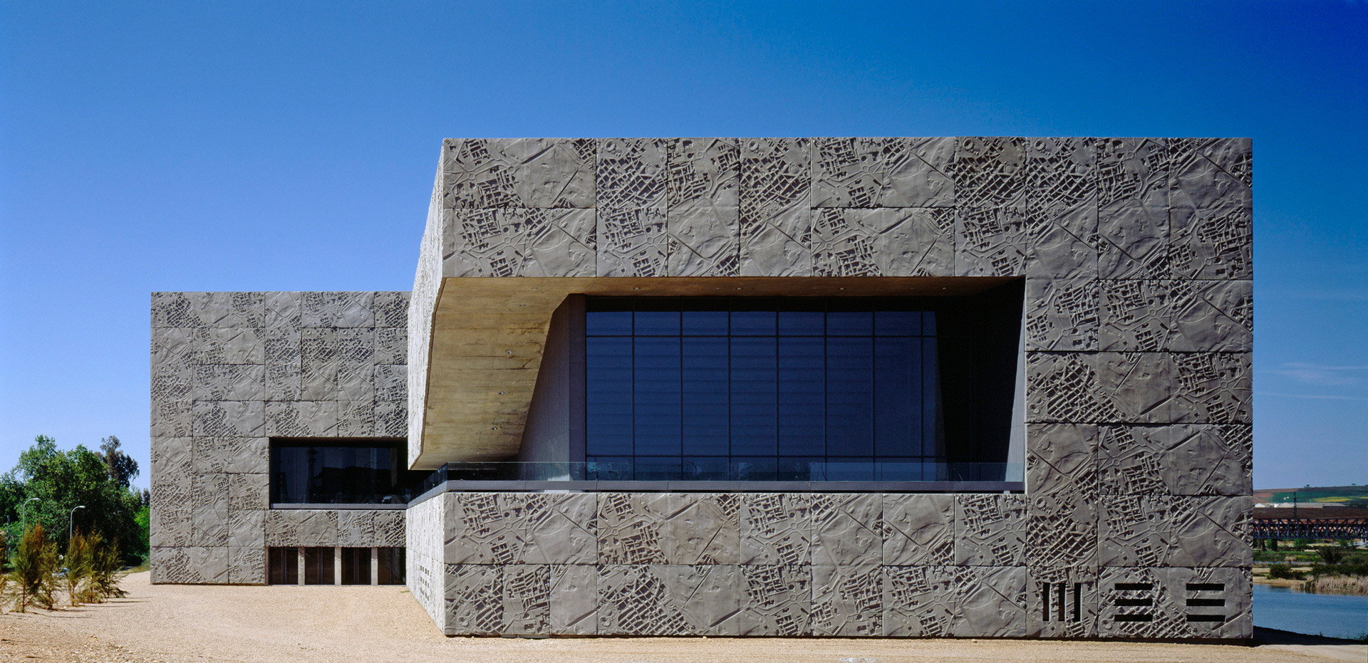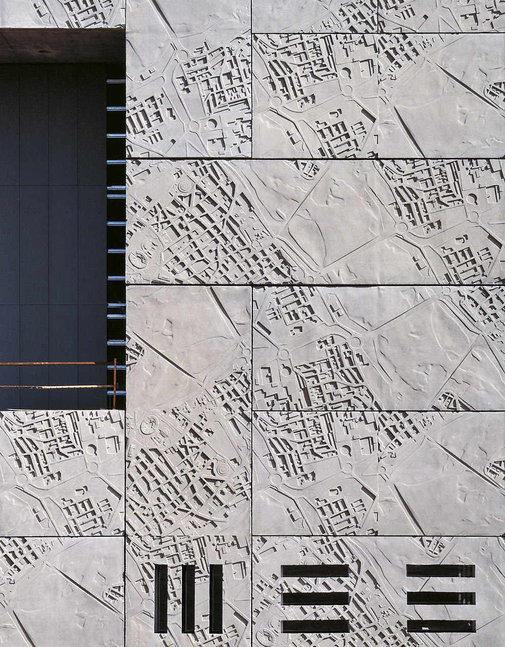 The outer face of the building is developed from a single piece that represents a longitudinal section of the city of Merida, which includes part of the historic center, the Guadiana River and modern Merida. The historic buildings, as well as the modern architecture, have been treated as positive volumes, while the rest of the urban fabric has been worked as a network of gaps and voids, thus highlighting the character of ruins and the historical past of the city. From this single piece measuring 720 X 240 X 15 cm, and by means of different combinations, five different panels are developed, giving rise to five rubber molds. The result is the creation of five concrete panels with repetitive elements that in turn are arranged in four basic groupings. This generates a combinatory system that makes possible the transition from the singularity of a sculptural work to the execution of an industrialized construction process. On the outside, the building is characterized by the continuity of a stone material, contemporary in its construction technique, yet reminiscent of the ancient walls of the city's Roman past. The skin of the city, of a reinvented Merida, becomes the epidermis of the building and turns it into a living element through the effects of light, as its facades are continuously transformed by the movements of the sun and climatic changes. The result is a powerful and characteristic image due to the strong texturing of the enclosure of the large blind volumes of the auditoriums.