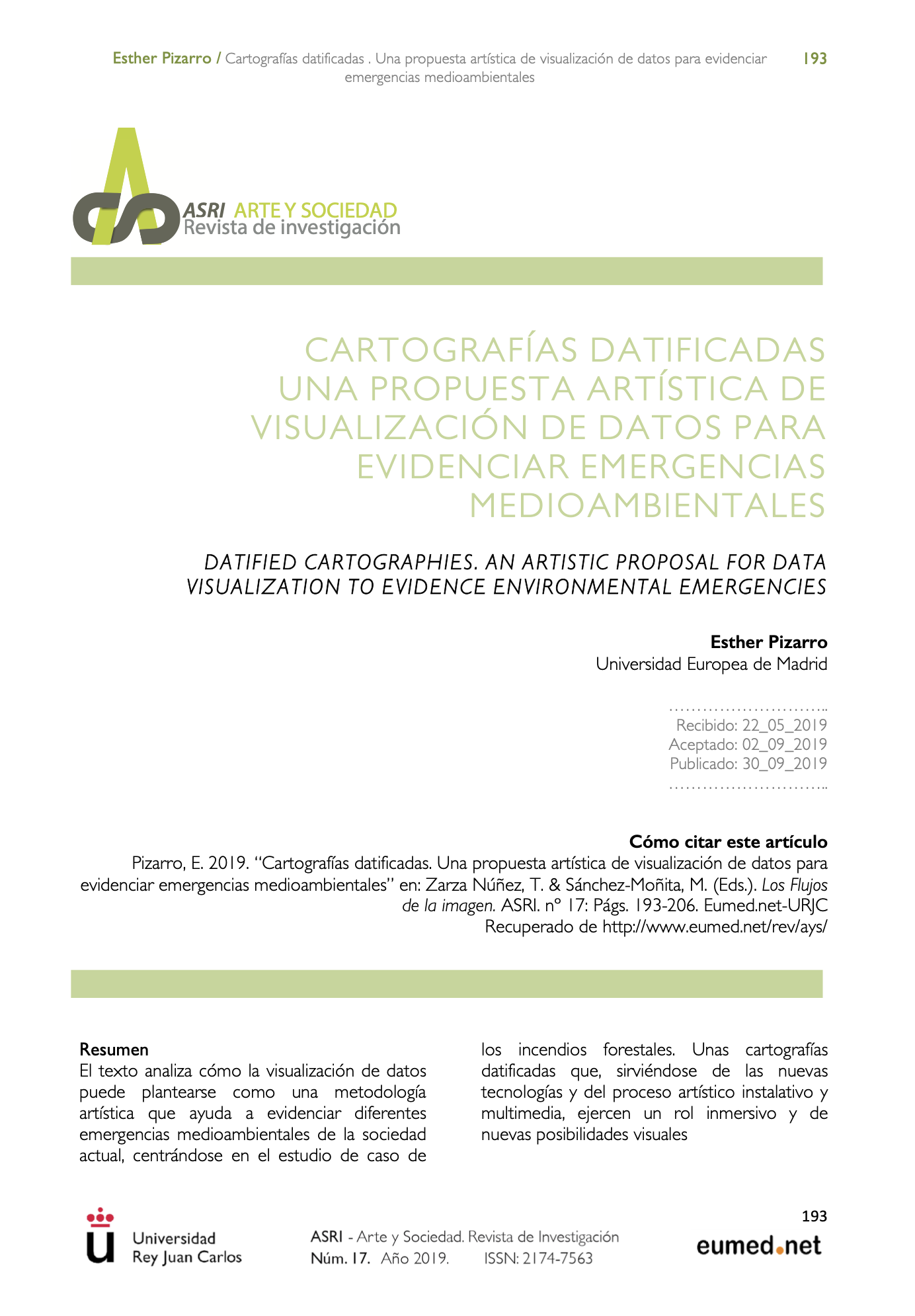 Pizarro Juanas, Esther (2019). “Cartografías datificadas. Una propuesta artística de visualización de datos para evidenciar emergencias medioambientales” en Zarza Nuñez, T. & Sánchez-Moñita, M. (Eds.). Los flujos de la imagen. ASRI, Nº 17, pp. 193-206. Eumed.net-URJC. Publicación Semestral. ISSN:2174-7563. Recuperado de https://www.eumed.net/rev/asri/17/cartografias-datificadas.html |