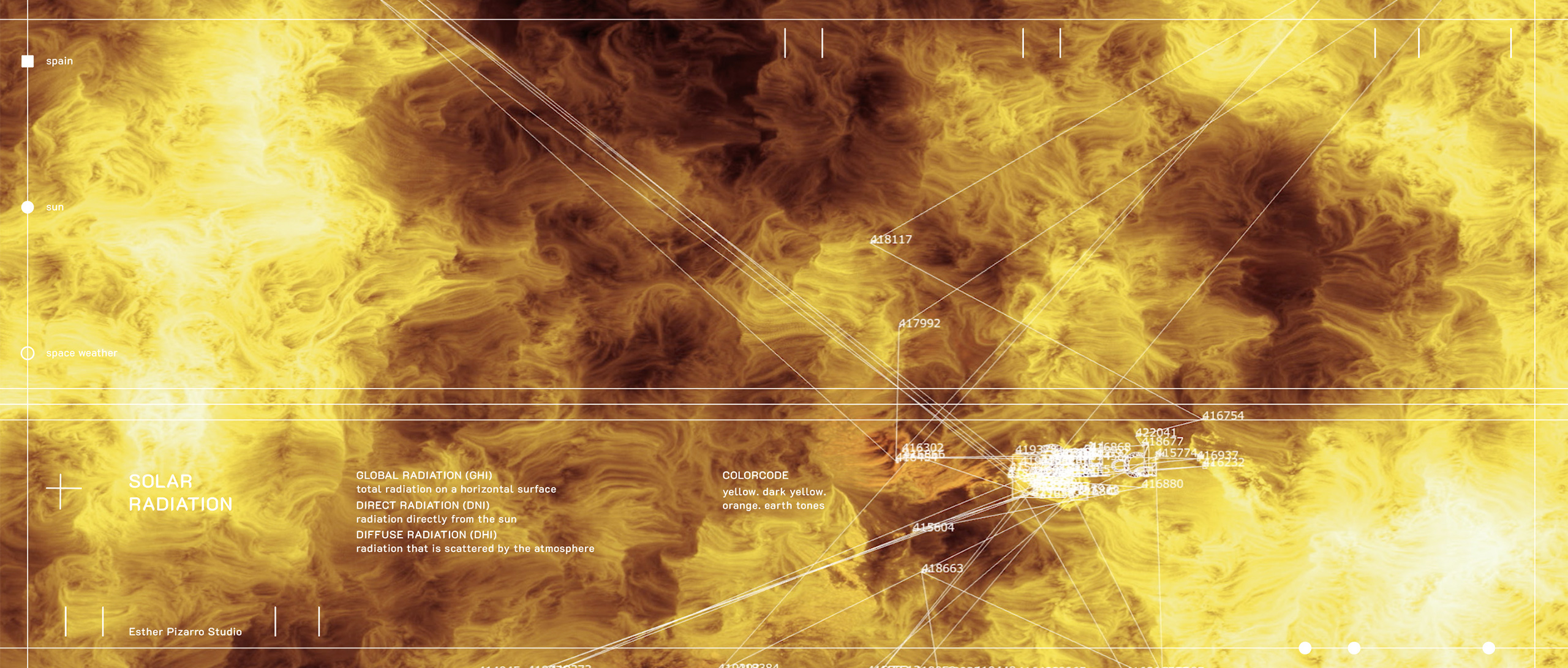 Thanks to its strategic location and cutting-edge technology, Spain holds the seventh global position in solar energy production. Solar radiation maps, energy flow diagrams, and intensity charts are essential tools for its visualization. The aesthetic transformation of these elements, extracted from scientific sources, marks the starting point for Esther Pizarro Studio in the creation of Atlas of Solar Radiation, a generative atlas that, through an artistic approach, translates real data on solar irradiation across Spain into abstract and suggestive imagery.
