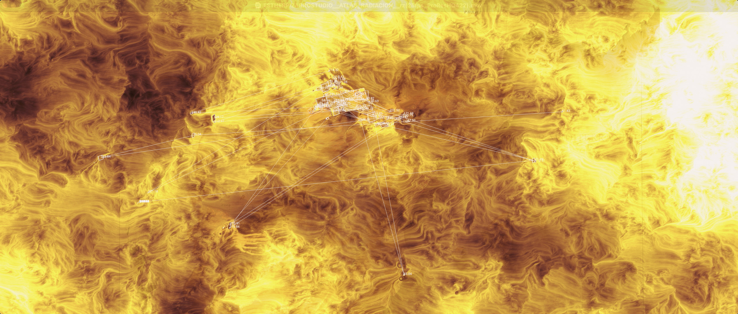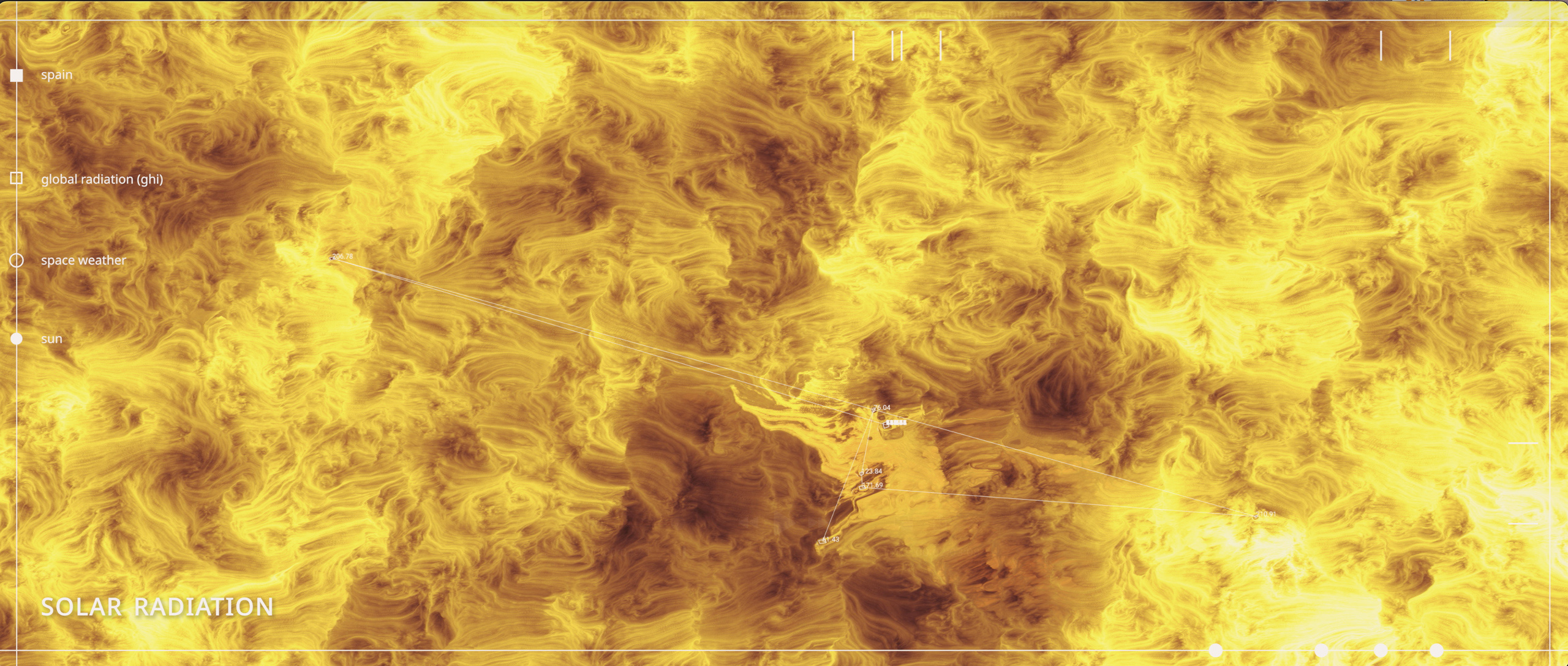 Atlas of Solar Radiation is an artistic proposal that transforms the Sun’s dynamics into images, revealing its essential role as a source of life and energy on our planet. The project focuses on the solar radiation received by Spain over the span of a decade, converting this data into a generative audiovisual work that poetically explores the visual metamorphosis of solar energy flows.