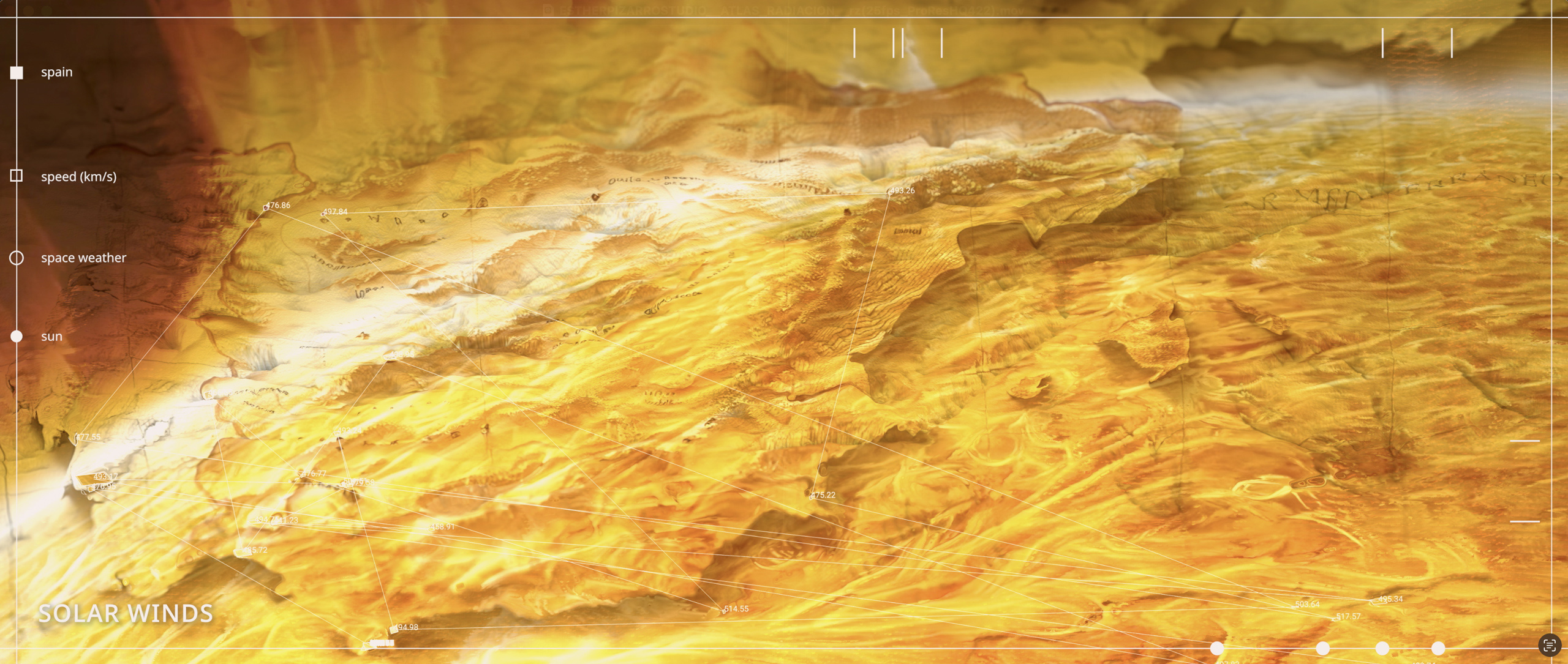 Based on three key parameters—solar wind, solar flares and coronal mass ejections (CME), and solar radiation—the project generates abstract and evocative visuals that invite viewers to contemplate the invisible beauty of solar energy. The solar wind, a continuous flow of charged particles, can cause anything from auroras to disruptions in communication systems. Solar flares and CMEs are powerful bursts of energy capable of triggering geomagnetic storms. Solar radiation, the engine of Earth’s climate, influences weather patterns and thermal dynamics essential to life.