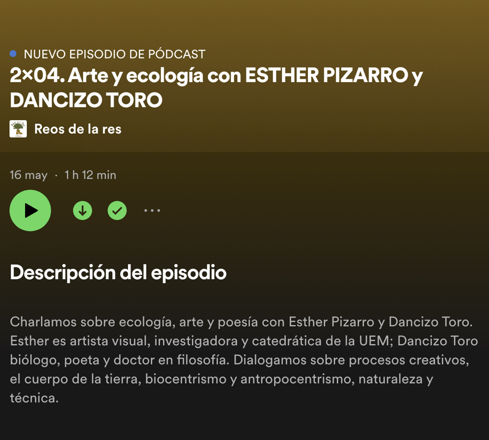 News INTERVIEW: ‘2x04 Art and ecology with ESTHER PIZARRO and DANCIZO TORO’, Programme ‘Reos de la res. Fundamental Philosophy’ Leer más
