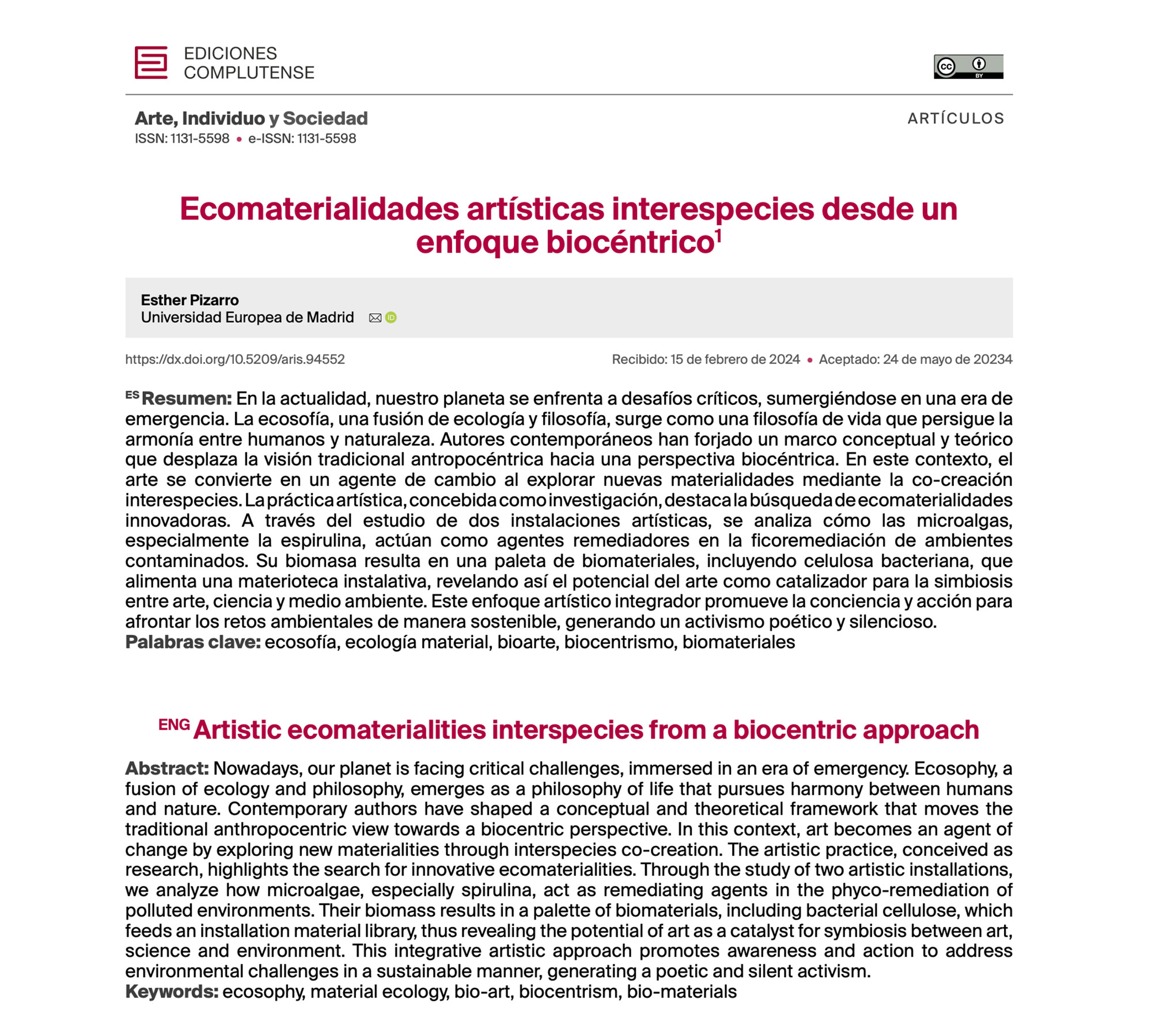 News PUBLICATION: “Interspecies artistic ecomaterialities from a biocentric approach”, journal: Art, Individual and Society Leer más