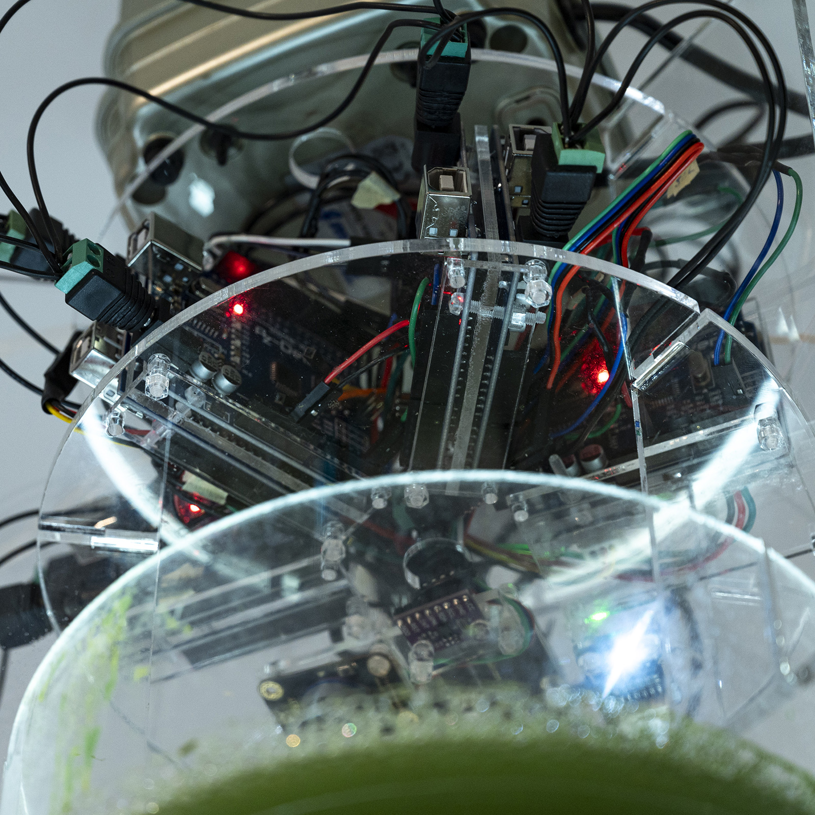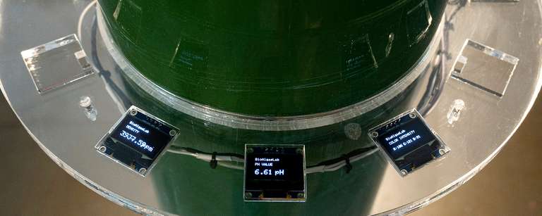 Connected to this core is the technological layer of the project. Five sensors (CO2, O2, temperature, pH and color) activate their corresponding Arduino, which is responsible for sending the information in real time to a touch screen located in the lower half of the cylinder. The viewer can see the data that the bioreactor is generating at any given moment.