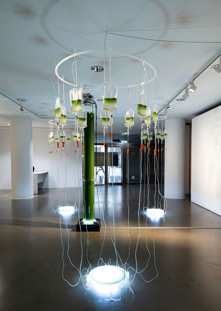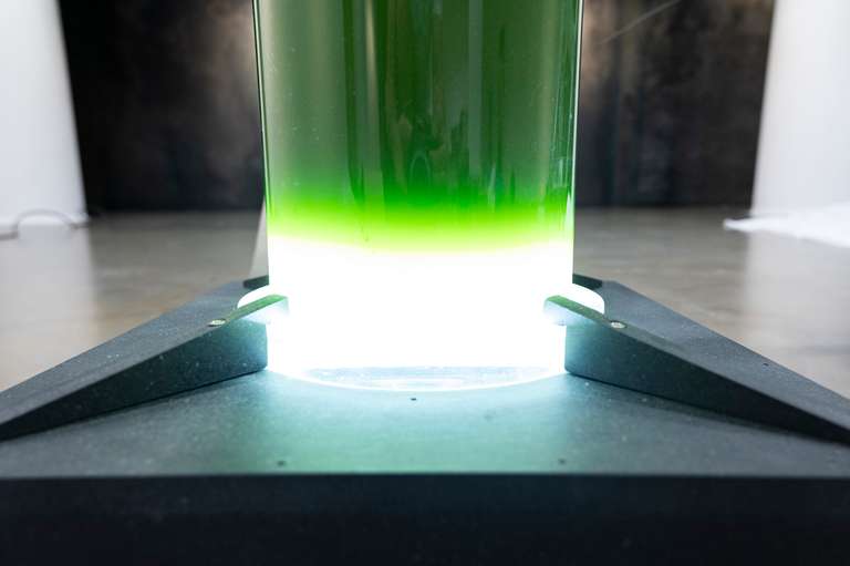 BioAlgaeLab Interespecies is formalized in a central core, a two-meter-tall tubular structure that acts as a bioreactor for the microalgae. It constitutes the culture medium for our microorganisms (spirulina). The care of this biological solution is carried out by means of light activation timers (16 hours light, 8 hours without light). Light is responsible for triggering photosynthesis in an indoor space, capturing CO2 from the environment and returning a purification of the air by emitting O2. Specific nutrients are dissolved in the aqueous solution, which, due to light activation, turns an intense green. An aeration pump is responsible for activating the agitation of the culture medium to keep it alive, as the spirulina needs to rise to the surface to capture CO2.