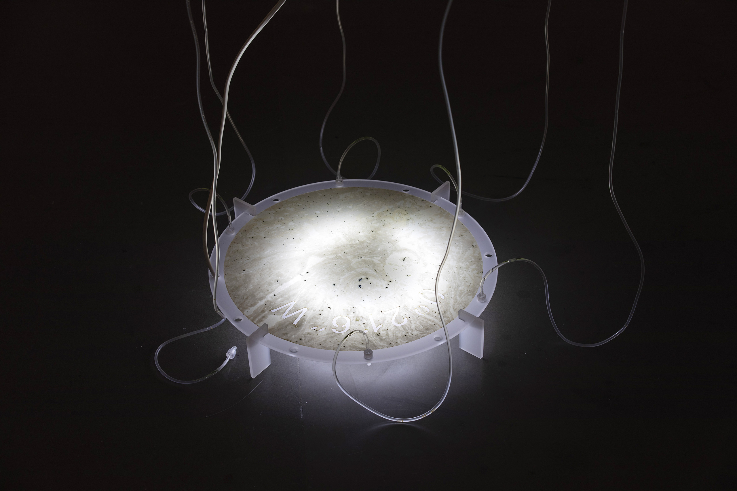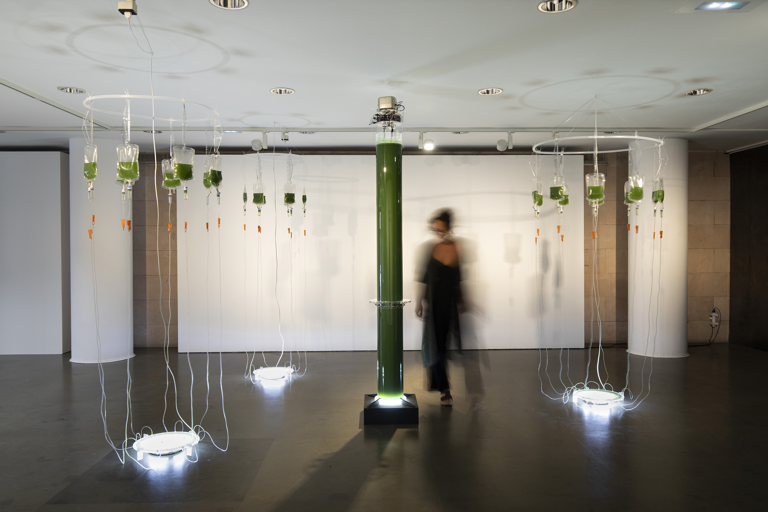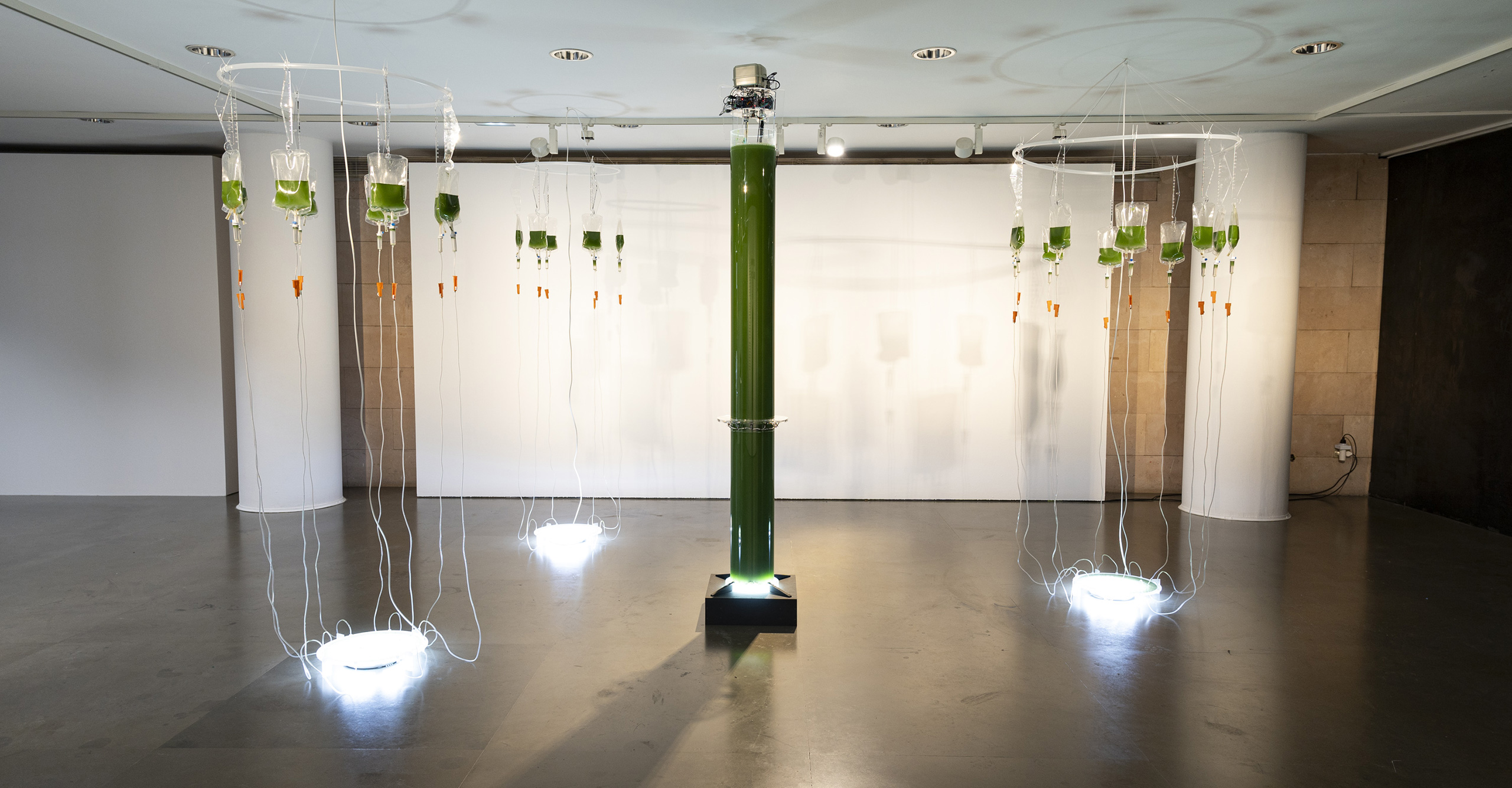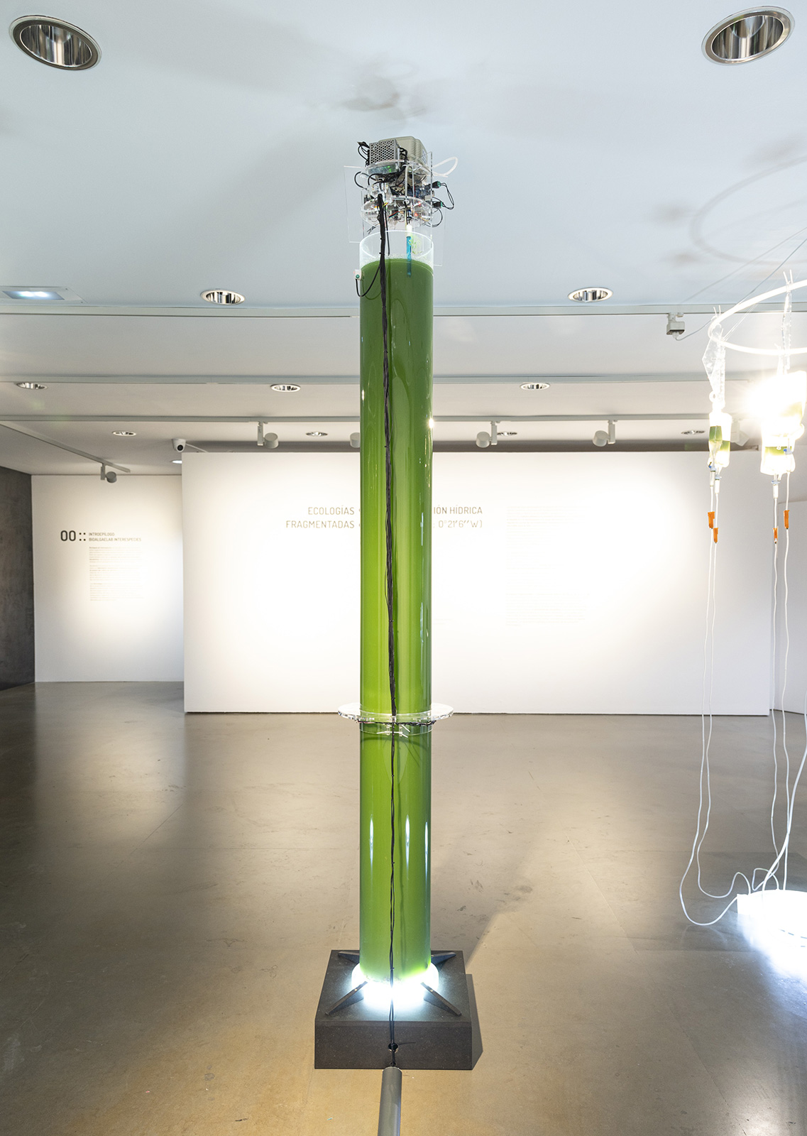 BioAlgaeLab Interspecies is conceived as a co-creation between human and non-human organisms, which understands the artistic work as an unstable, changing and mutant entity. This helps us to explore the expressive capacity of both its materiality and its horizontal and biocentric production process. A polyphonic ensemble of multiple temporalities emerges with a prominent protagonist: microalgae.