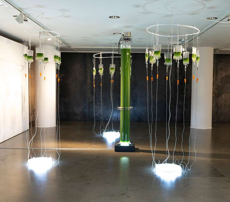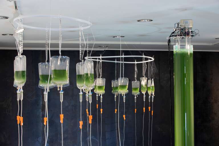 Microalgae bioreactor (Spirulina), infusion bags, biomaterials, sensors, acrylic and light.