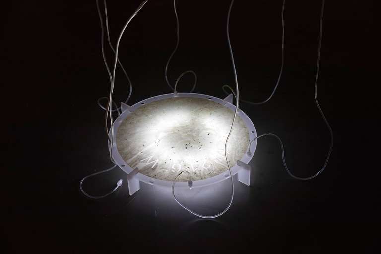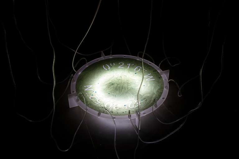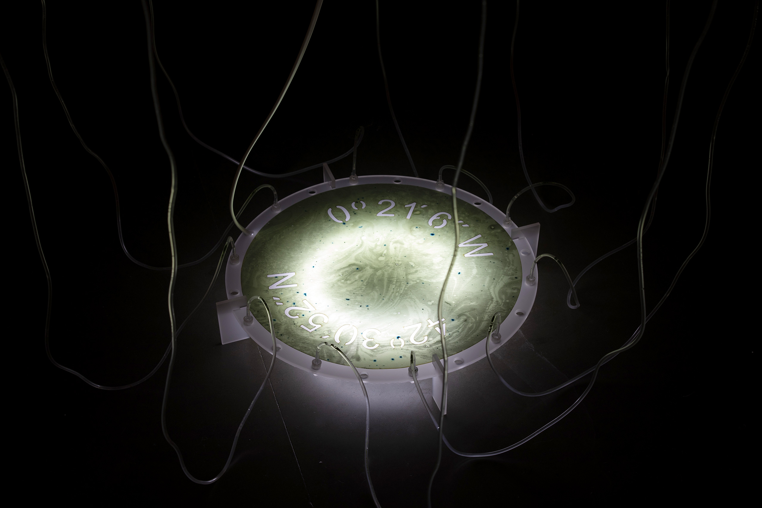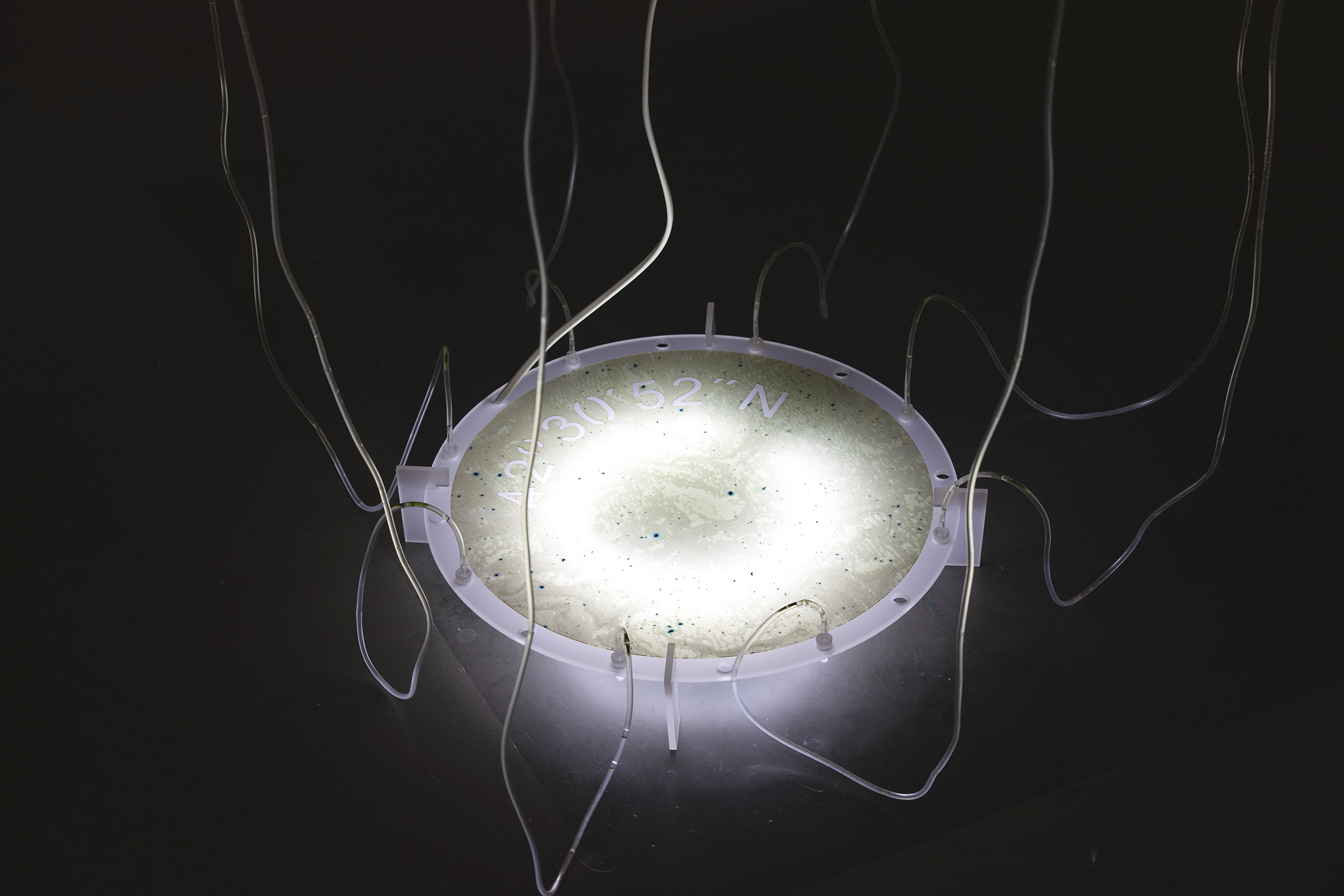 The lab is completed by three sets of drip infusion bags, which hang from the ceiling of the room supported by circular hoops. These bags contain a stable solution of spirulina, with the corresponding biomass, inside. The biomass is the culture resulting from the production of spirulina from the bioreactor and constitutes the organic agent that will allow the continuation of our interspecies cycle. The connecting tubes hanging from the bags are attached to biological tissues that are deposited on the ground and constitute the third level of our process cycle. Three biomaterials made from the biomass extracted from spirulina, organic skins made from biomaterials. The digital fabrication (laser cut) joins its analog materialization and in its interior are cut out the geographical coordinates that give title to the exhibition and that are articulated as pages of our eco-environmental story.