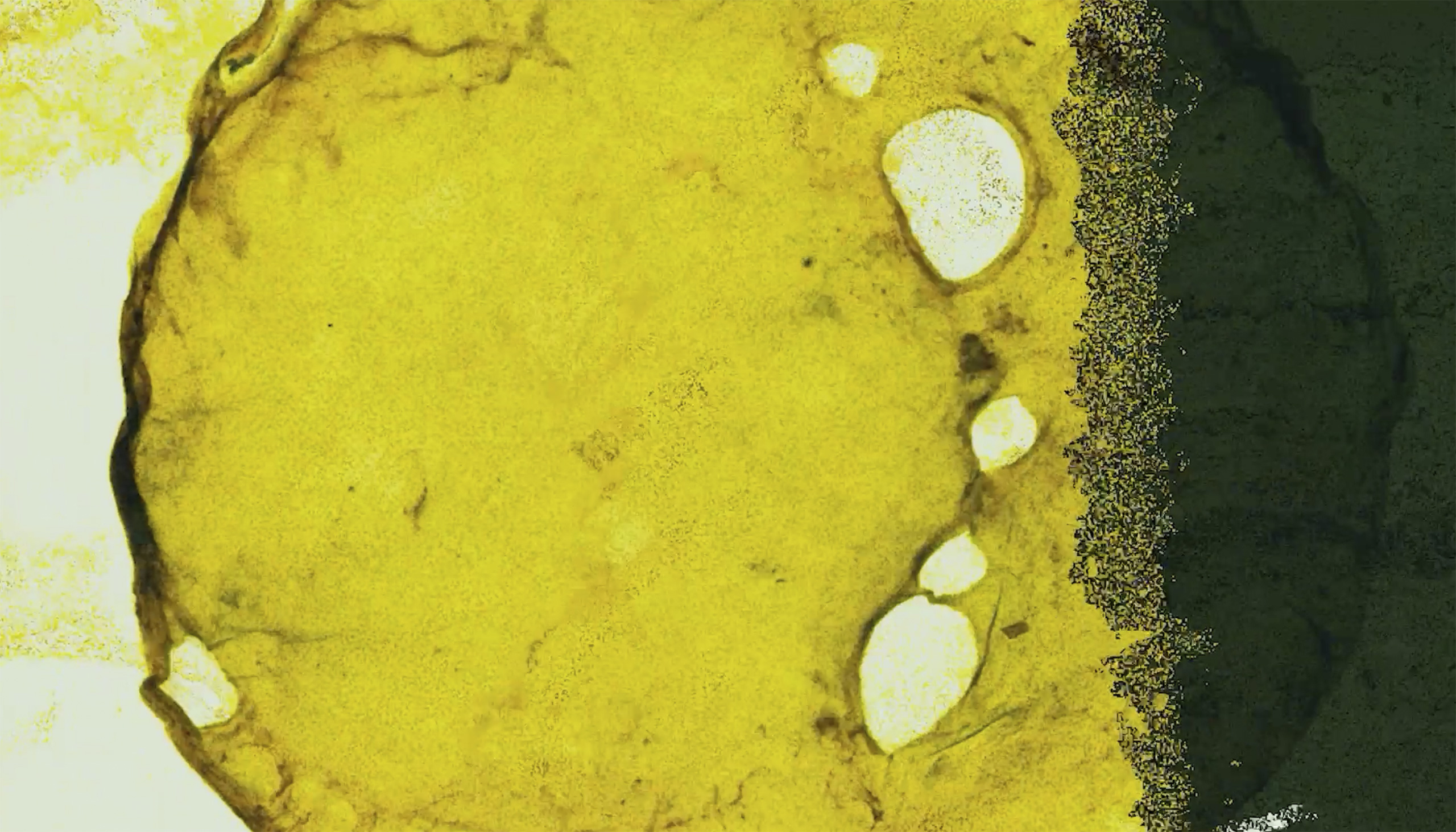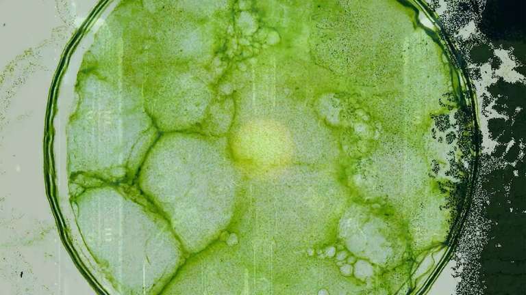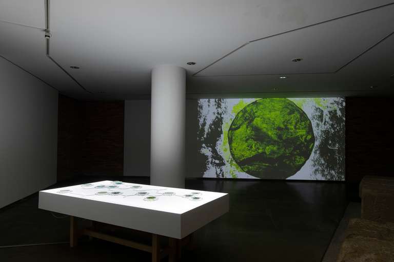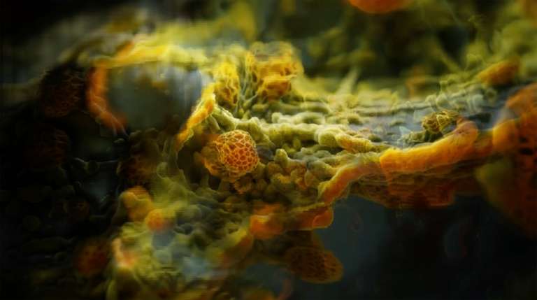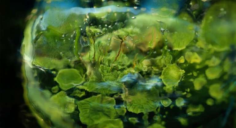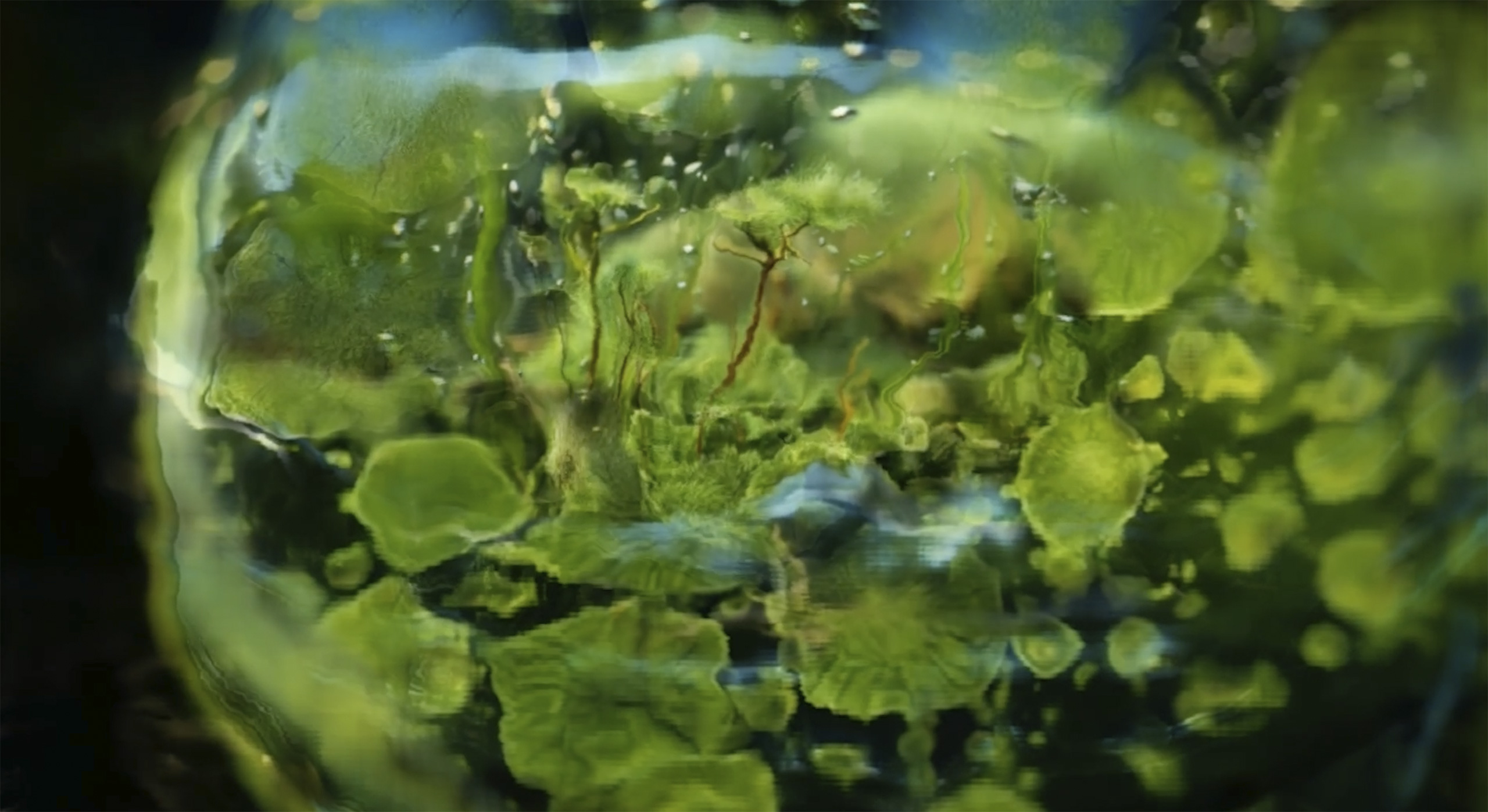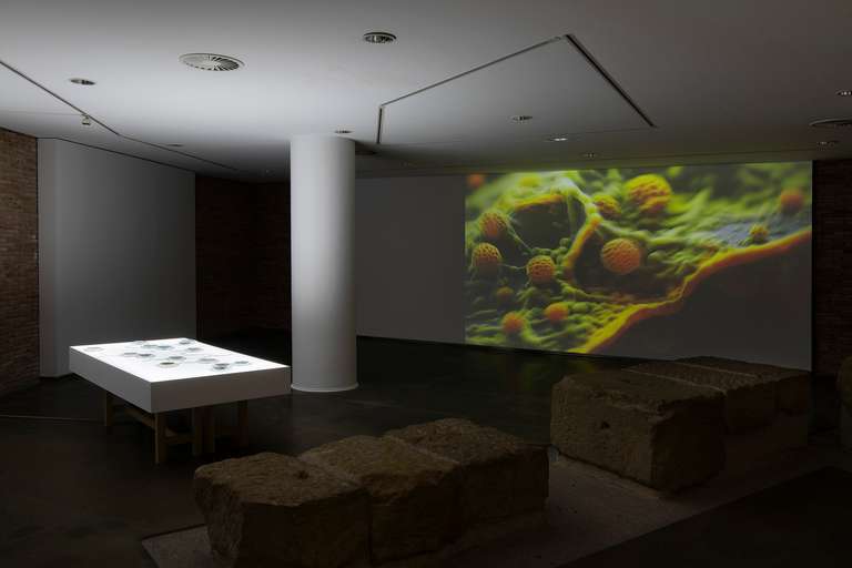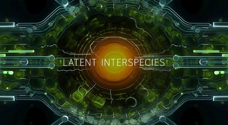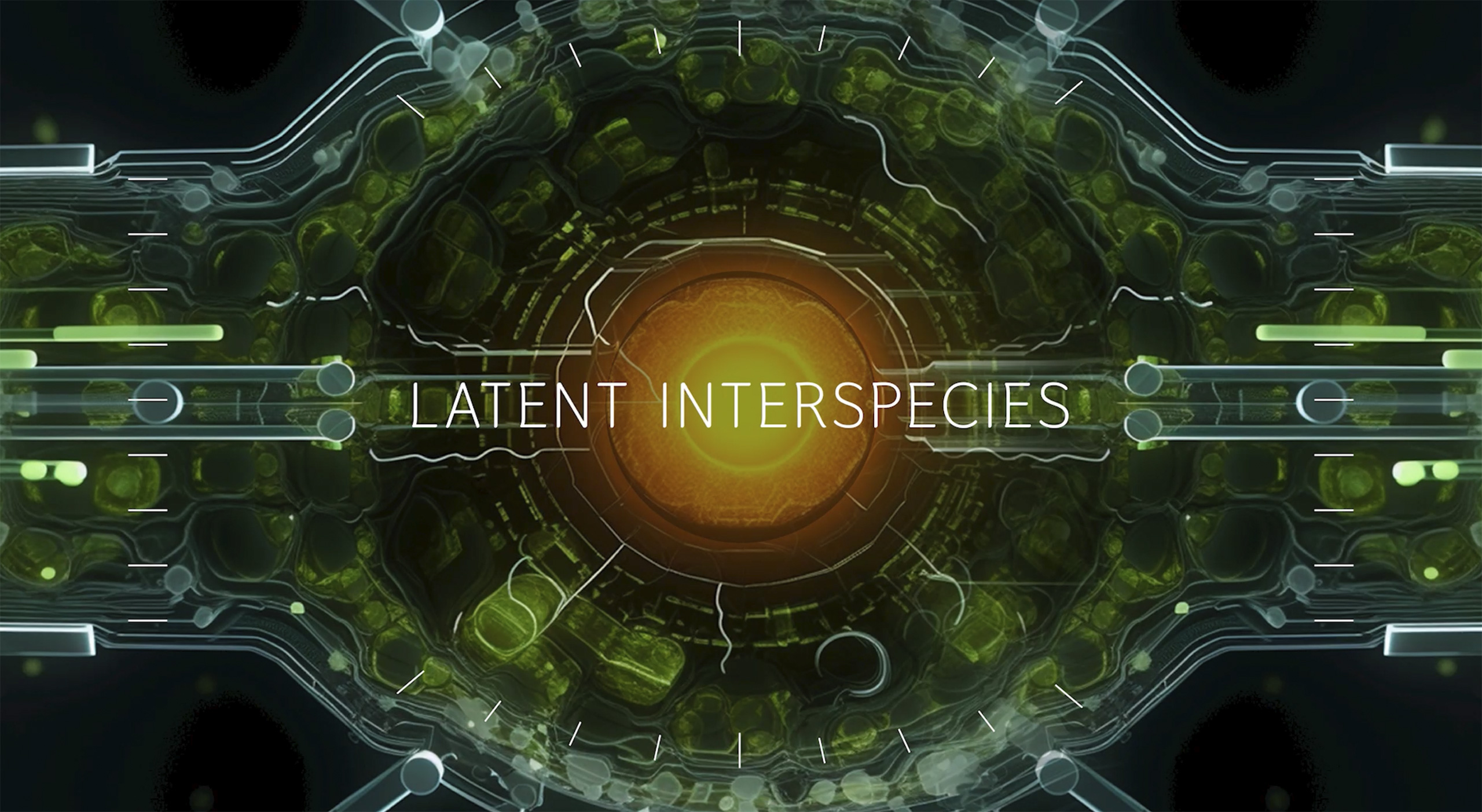 Interespecies latentes is a generative projection that uses the microscopic look as a door to a visual, dynamic and magnetic world, which shows us the multiplying capacity of cyanobacteria or microalgae. The circle functions as a microscopic peephole, but also as an aseptic container where biologists analyze their samples. Change and transformation act as a motor and magnet for living, resilient and hopeful nature. Their images are based on physical biomaterialities that merge to introduce us into a world of images generated by artificial intelligence and generative elements. The audio has been programmed and mixed from royalty-free sources.