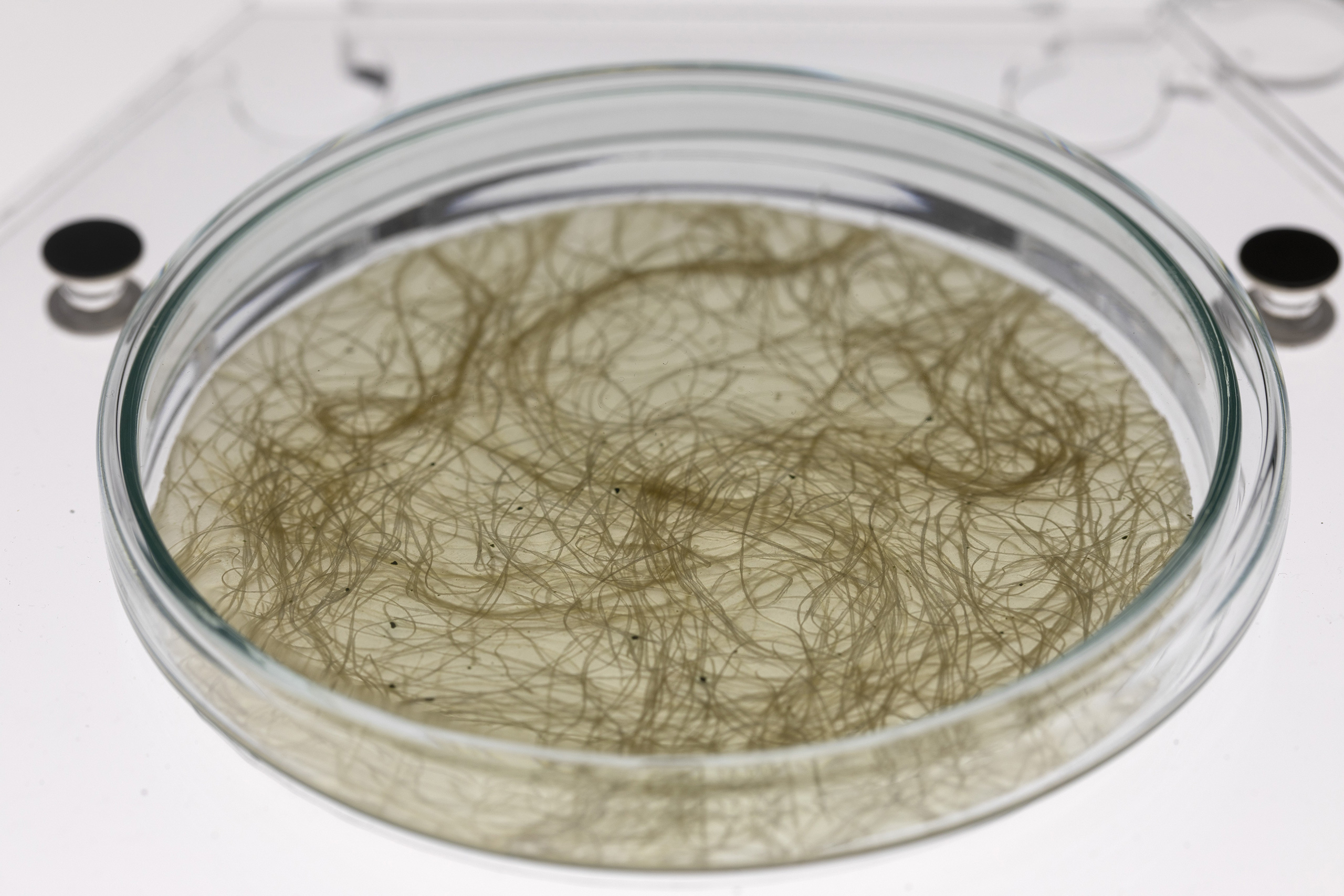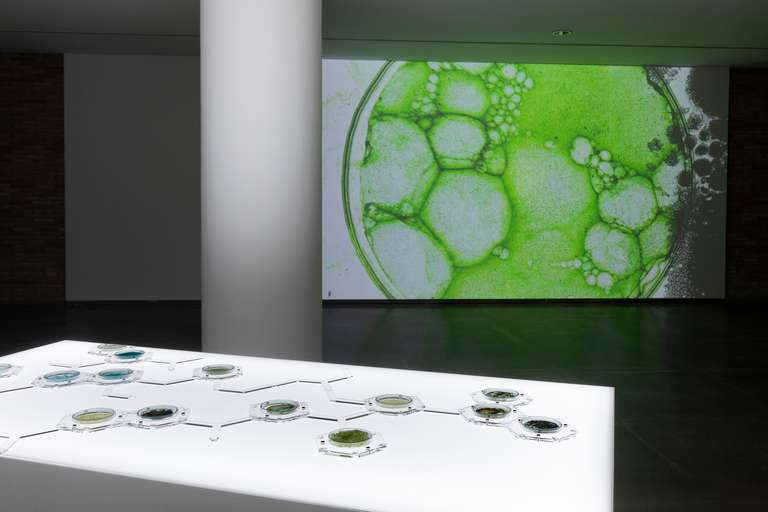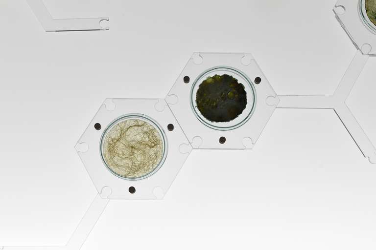 The installation is conceived as an experimental laboratory for biomaterial samples, the common element of which is the use of spirulina biomass (fresh or dried) in their testing and formulation. BioLabMatrix is constituted as a material library, whose arrangement is determined by a hexagonal matrix. An invisible lattice that, like a game table activated by light, brings us closer to the materiality of the tissues tested and protected in glass Petri dishes. A mosaic of connectors, links and hexagons that helps us to reinterpret impossible formulas in our bioexpositor.