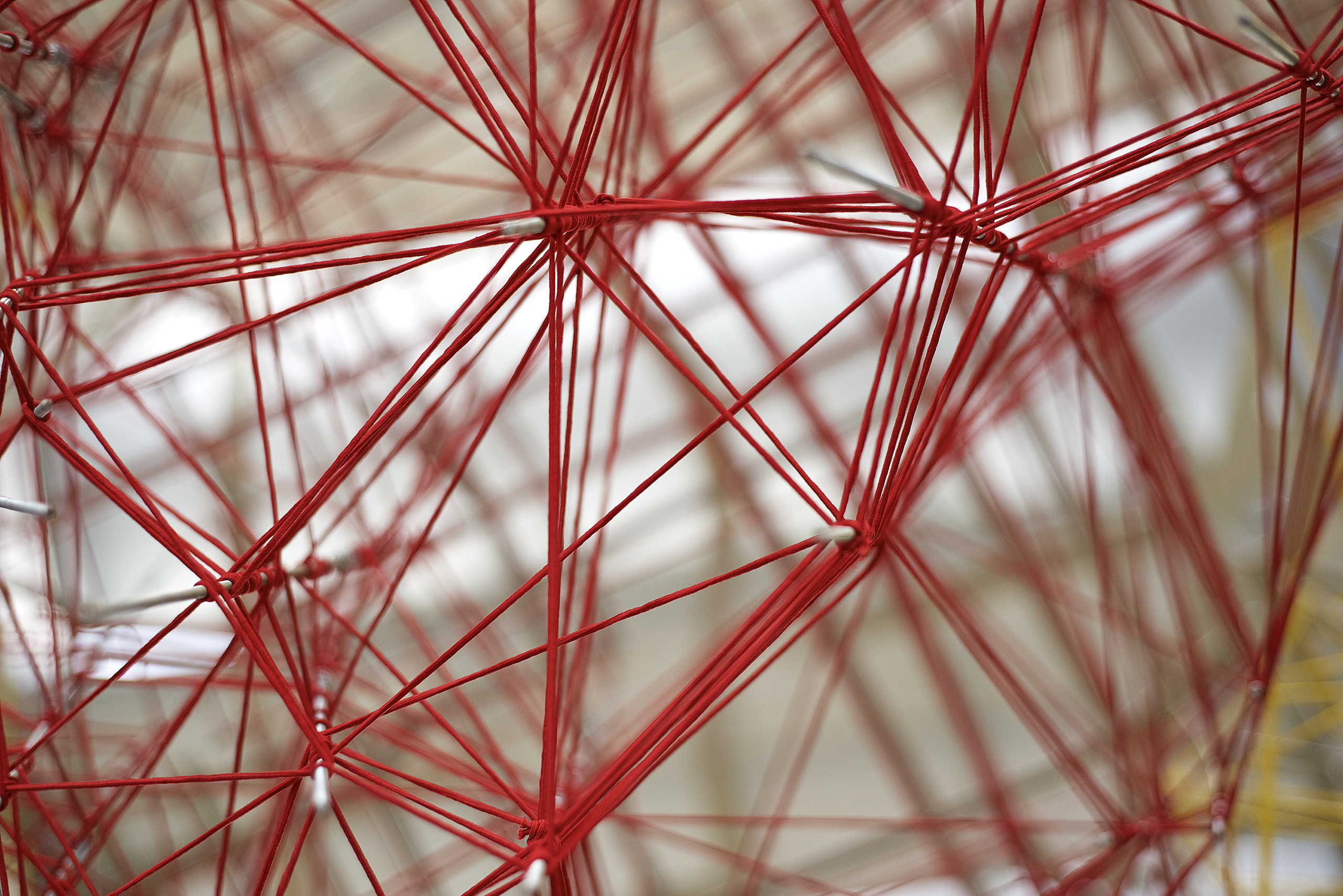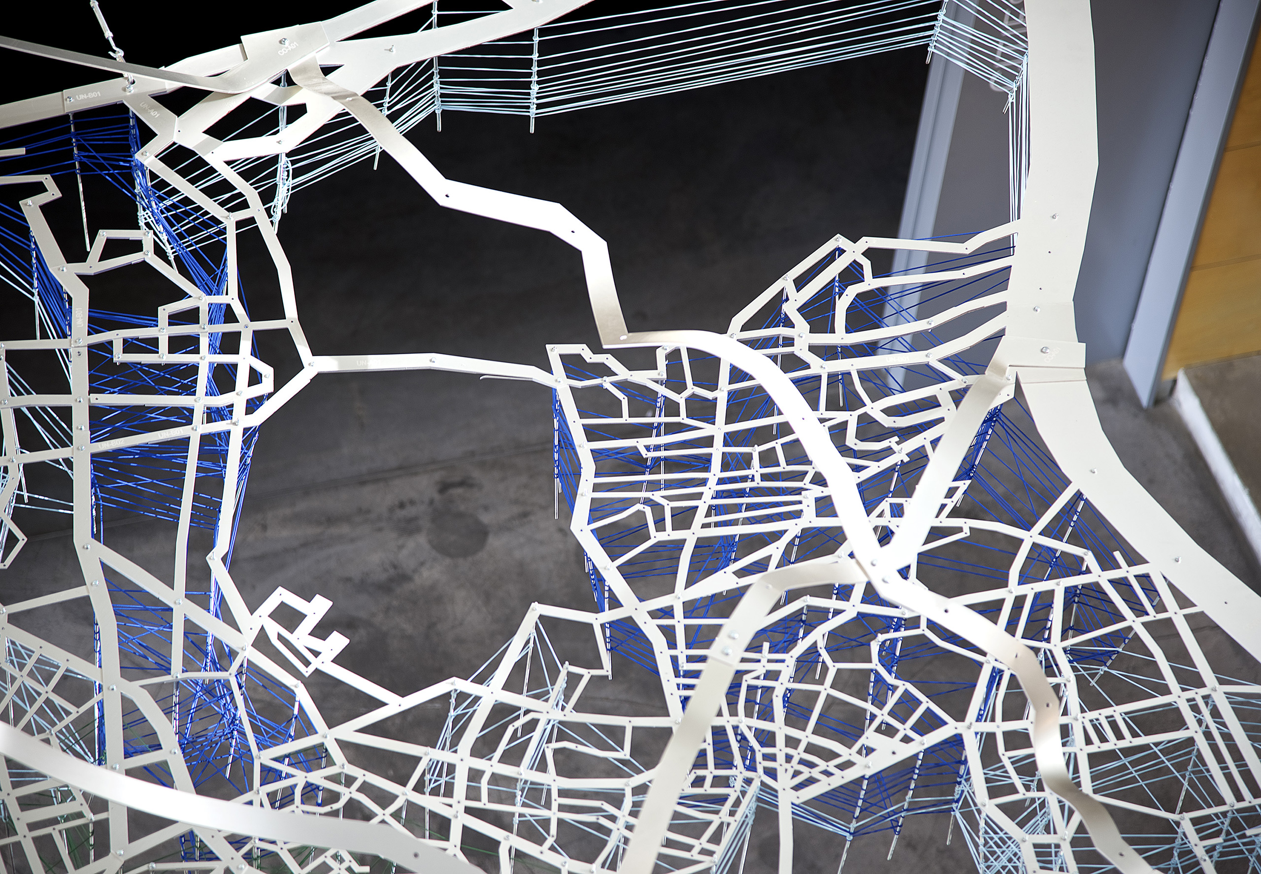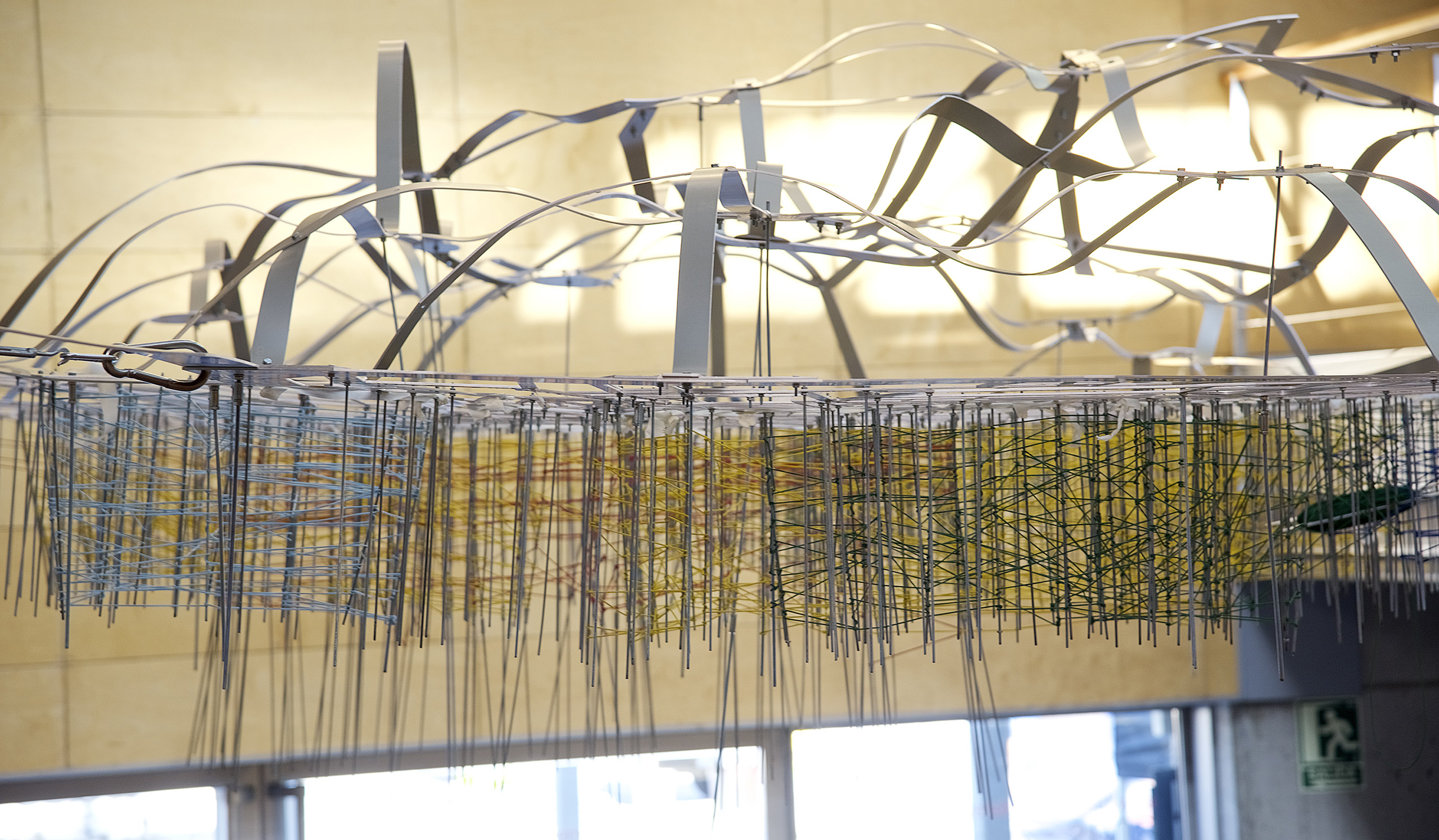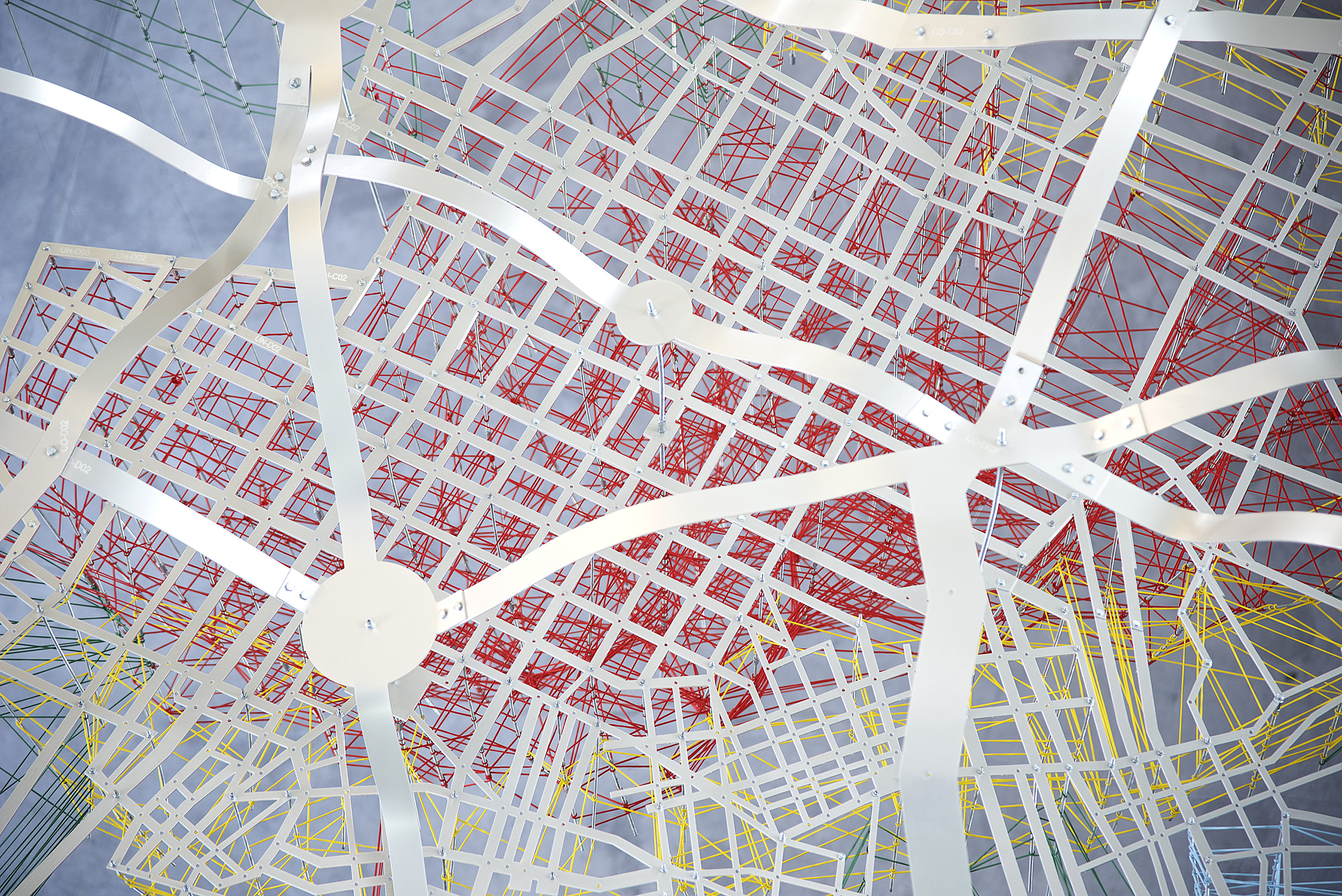 City Connect :: Patronando Madrid interprets the central core of the Spanish capital as a matrix, a sculptural loom, where multiple threads "weave" different situations in the city, a rhizome of mobility and urban connectivity. The city understood as a fabric where different routes and possibilities can be patterned and mapped. Madrid's M30 is an "urban motorway" that has the potential to be progressively transformed into an Ecobulevar, an axis of urban revitalisation, of collective transport and exchange, in dialogue with the urban fabric of the heart of the city. The Space Syntax (Fundación Metrópoli) studies inspired this installation, which identifies five areas of accessibility and centrality within the capital. Overlapping lines, routes and patterns that weave the network through which urban flows circulate. The resulting map resembles a rhizome, a kind of burrow, a complex and random network of paths whose destination is undefined and whose process is open, establishing a parallelism between the textile and cartographic worlds.