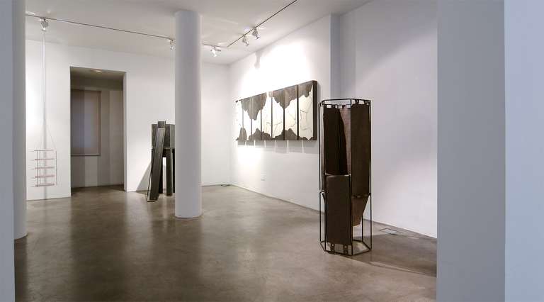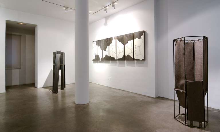 The towers show a regular growth based on simple and sober geometries and the rhythm with which they rise is gentle and harmonious. We spoke of the "relative absence" of human forms, but the anthropomorphic character of a work like Contención Férrea cannot go unnoticed. A (thoracic?) box stands on four iron pillars. This box is accessed by a diagonal ramp that breaks up the prismatic form. Inside the box, once again, the dynamic succession of geometric planes catches the eye. In the felt pieces we return to the contrast, mainly between cold and warm rhythms, between the rigidity and rotundity of the iron structures and the malleability of the material. Approaching its interior implies an absorption into the very soul of the sculpture. In many of these pieces we see the anthropomorphic character not only because of the scale of the sculptures but also because we understand their interior as a living organism. There is an outer skin and a persistent crossing of energies in the interiors.