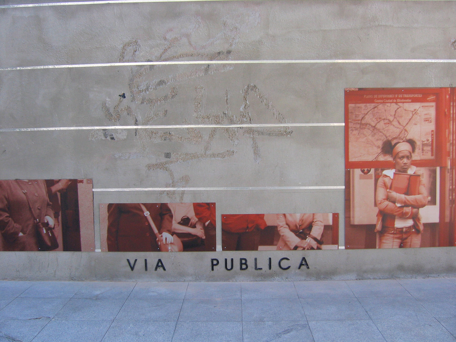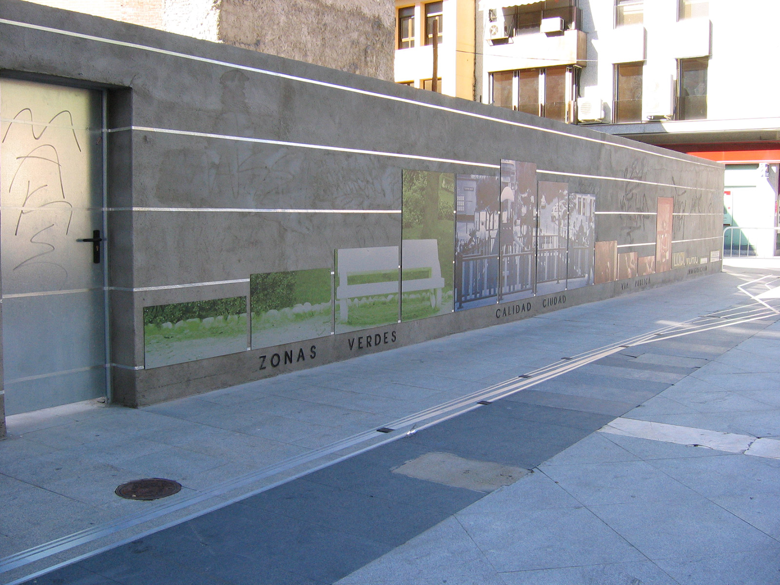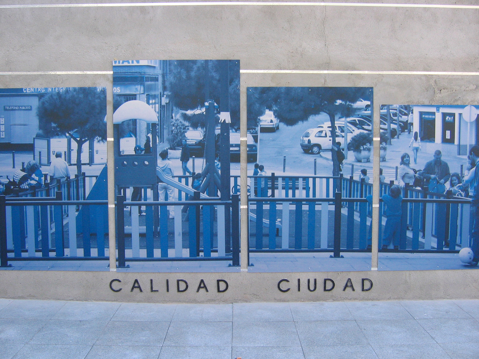 Conceptually, Diagrammatic Map is articulated in two directions. The vertical one, which uses the plan of the wall located in the Town Square, where the parameters of green areas, quality of the city, public roads and immigration are interpreted in percentages. The information, extracted from the series of Working Documents published by the Alcobendas City Council, is interpreted in coloured graphs, in the form of columns, according to the neighbourhoods that currently make up the municipality: Centre, Ensanche, North and Urbanisations. Each concept dealt with has as a background a photographic image related to it, taken from the streets of the city and digitally printed on aluminium. The other direction, the horizontal one, contains historiograms that translate the information on the wall and articulate it on the basis of time parameters, on a scale of 1 to 10. The superimposition of different years, 2005, 2003, 2002 and 2001, draws metallic lines on the pavement which, by overlapping each other, generate a plastic cartography, a kind of conceptual map.