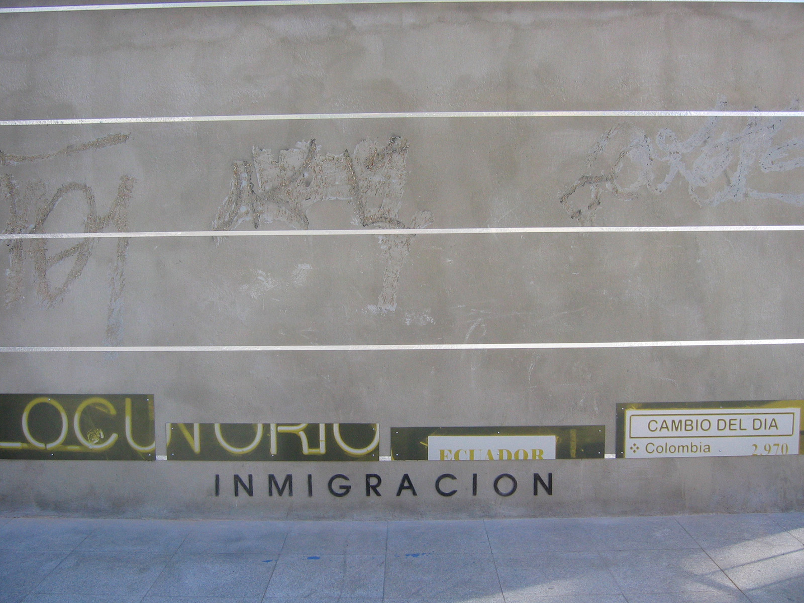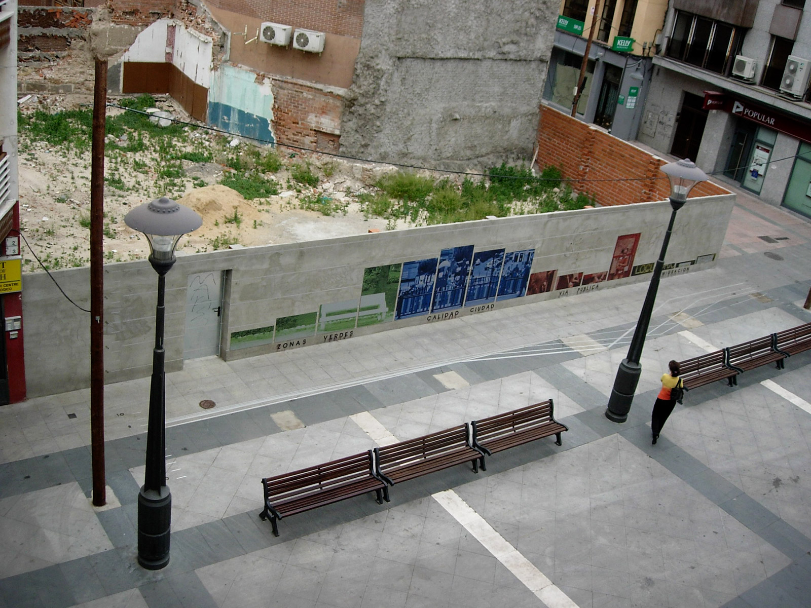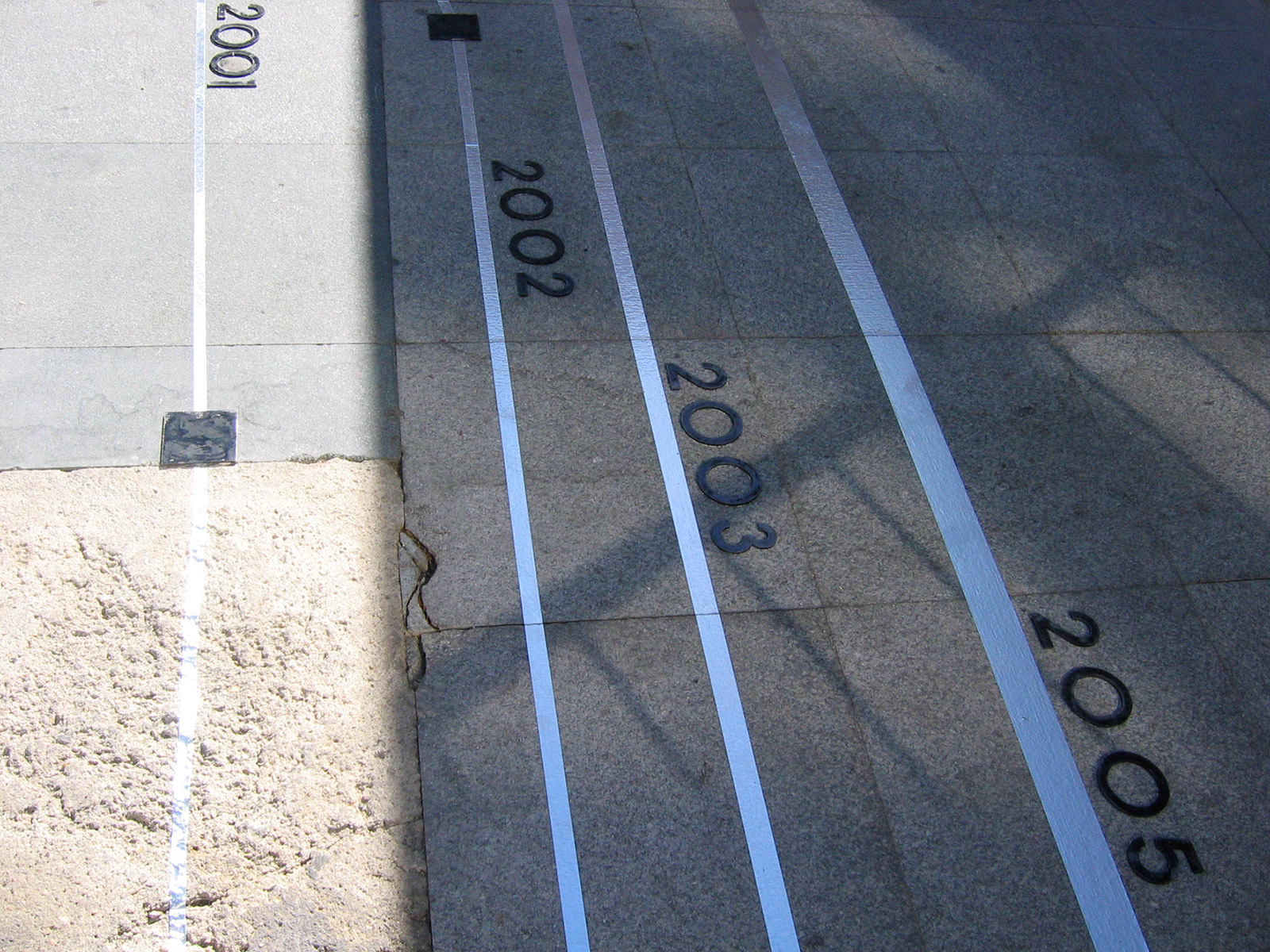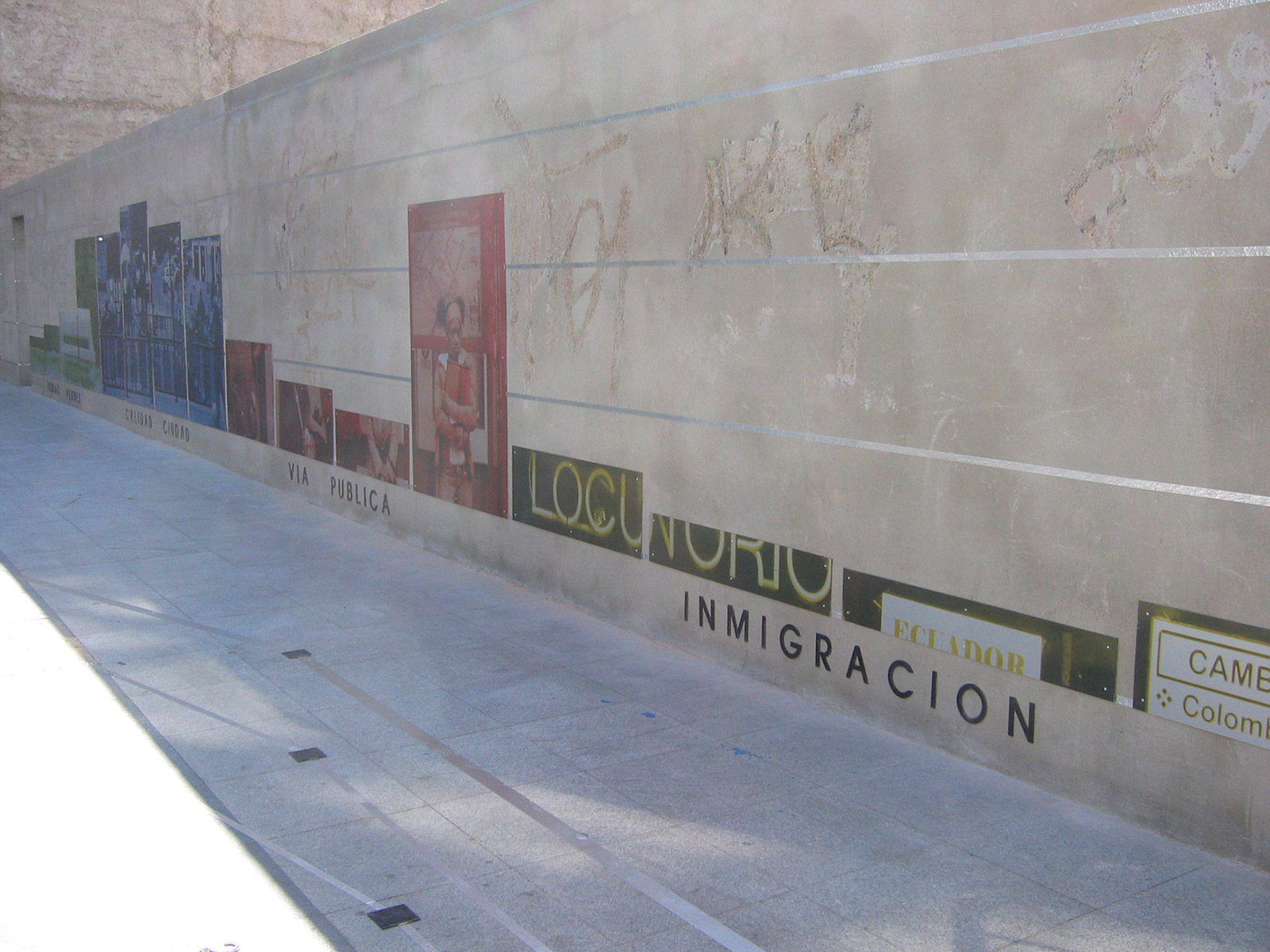 Conceptually, Diagrammatic Map is articulated in two directions. The vertical one, which uses the plan of the wall located in the Town Square, where the parameters of green areas, quality of the city, public roads and immigration are interpreted in percentages. The information, extracted from the series of Working Documents published by the Alcobendas City Council, is interpreted in coloured graphs, in the form of columns, according to the neighbourhoods that currently make up the municipality: Centre, Ensanche, North and Urbanisations. Each concept dealt with has as a background a photographic image related to it, taken from the streets of the city and digitally printed on aluminium. The other direction, the horizontal one, contains historiograms that translate the information on the wall and articulate it on the basis of time parameters, on a scale of 1 to 10. The superimposition of different years, 2005, 2003, 2002 and 2001, draws metallic lines on the pavement which, by overlapping each other, generate a plastic cartography, a kind of conceptual map.