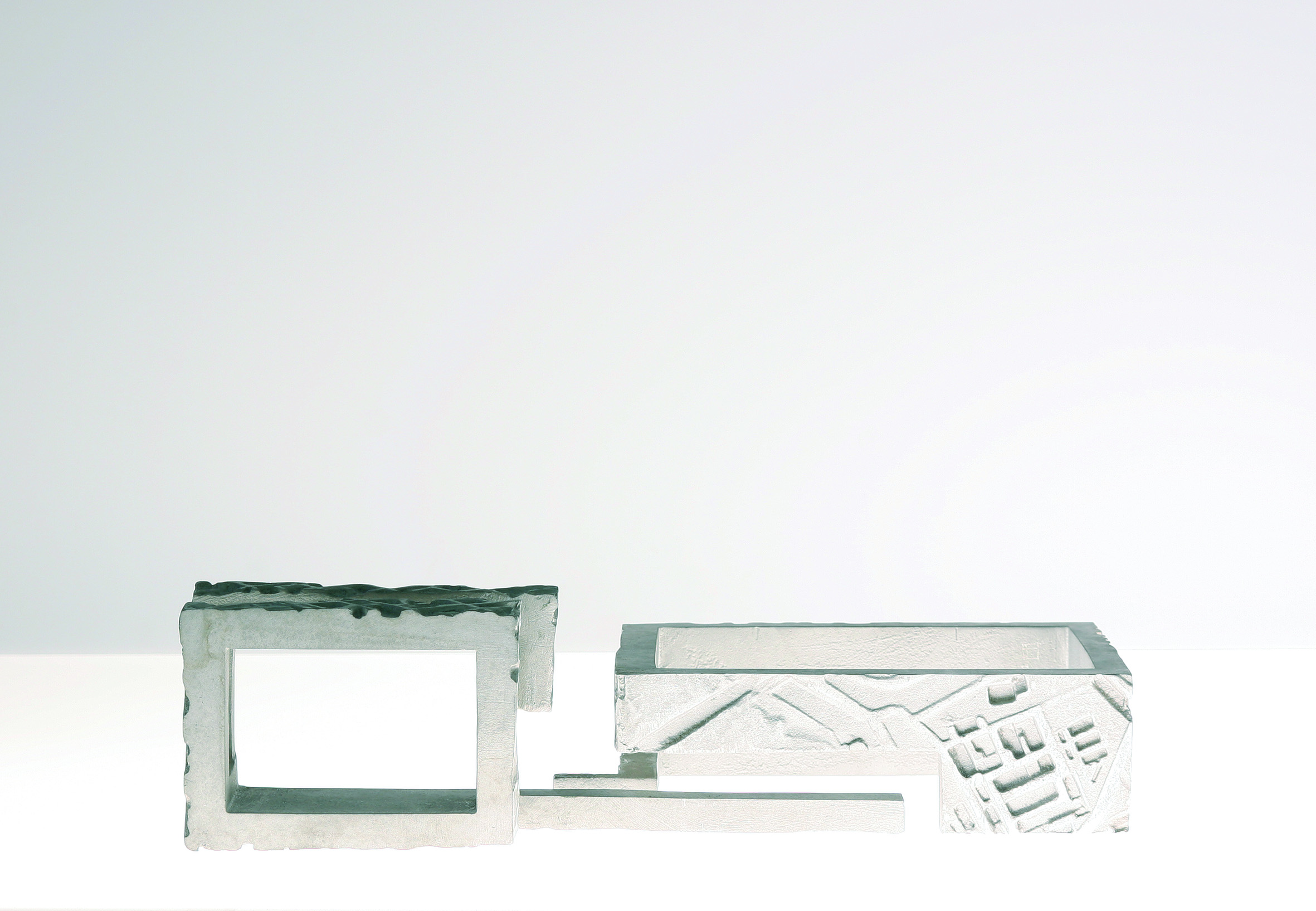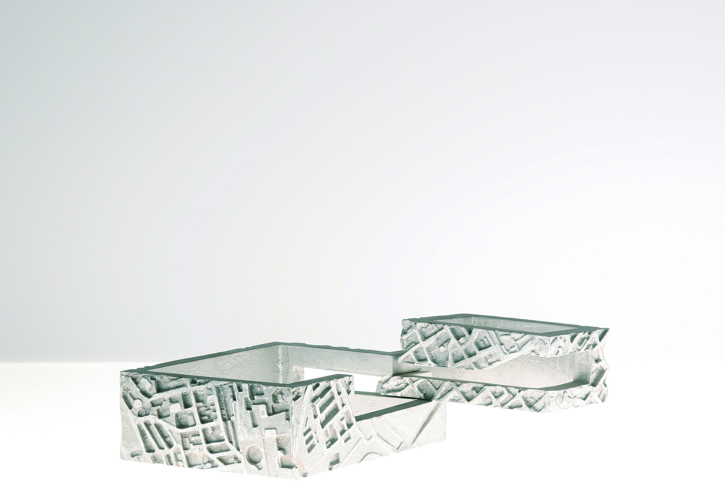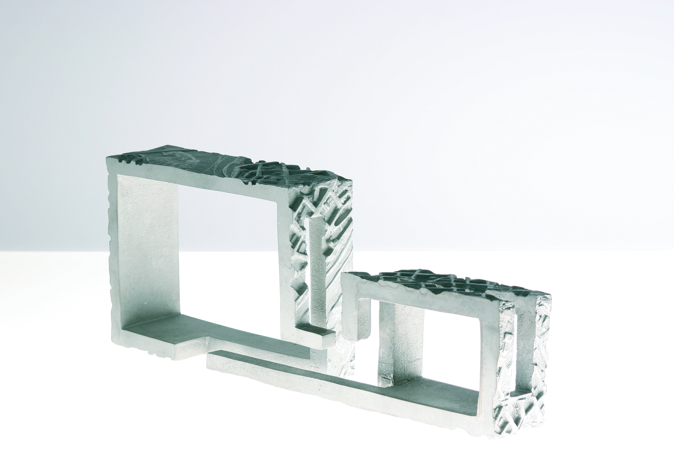 In the entrance area of the gallery 15 cast aluminum reproductions, made by Esther Pizarro, based on a sculptural interpretation of the Palacio de Exposiciones y Congresos de Mérida, are distributed on the floor as an installation, showing the viewer the multiple variations of the same model.