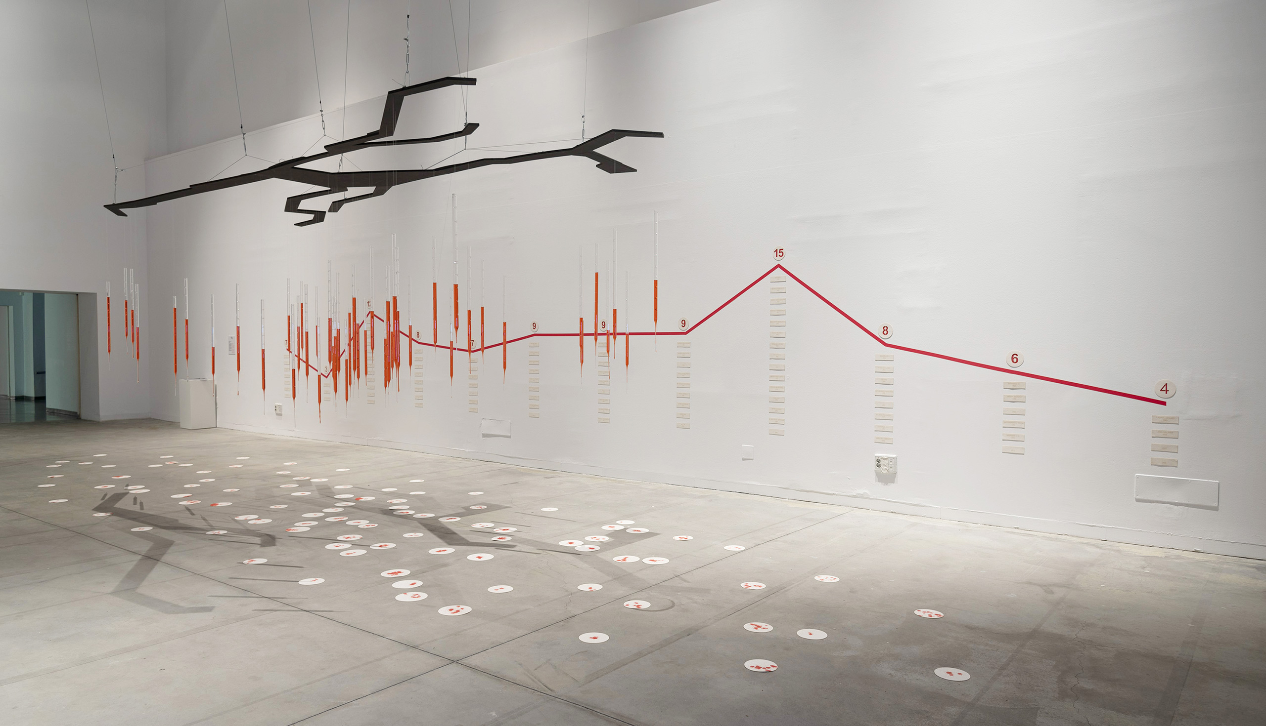 The artistic installation #NiUnaMenos makes visible, in the form of a three-dimensional diagram, the murders of women committed in Spain as a result of gender violence in 2018. The data allows us to quantify through figures an alarming social scourge that we have not yet been able to eradicate. Every year innocent victims lose their lives, their dreams and their freedom; discriminated against because they are women (feminicide).
