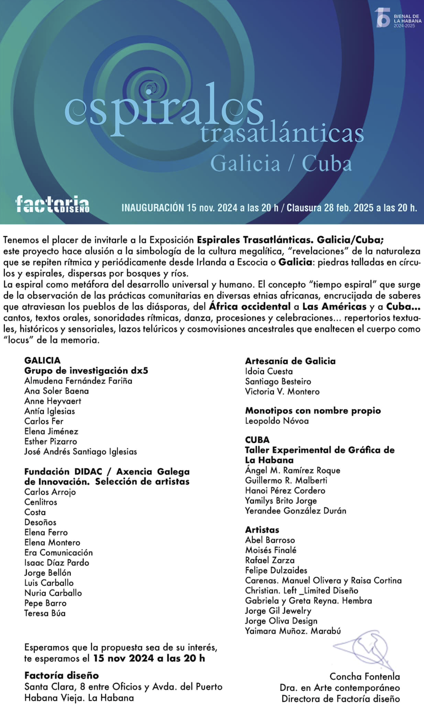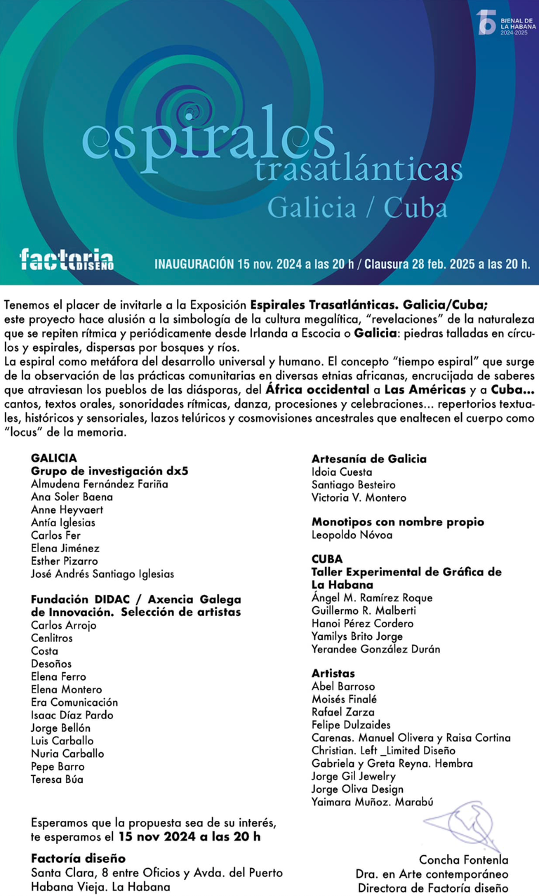 It’s an honor to be invited by by @factoriadesign and together with @grupodx5 to participate in the 15th Havana Art Biennial. 🙏✨ This week, the research group is traveling to Havana for the Espirales Trasatlánticas exhibition, organized by Factoría Diseño (@factoriadesign) as part of the Biennial (@bienaldelahabana). The exhibition features works by Dx5 members Almudena Fernández Fariña (@almudenafernandezfarinha), Ana Soler Baena (@anasolerbaena_art), Anne Heyvaert (@anne.heyvaert.14), Antía Iglesias (@antiaiglesias17), Carlos Fer (@carlxsfer), and José Andrés Santiago Iglesias, along with guest artists @esther_pizarro_y and @elenajimenezart.
