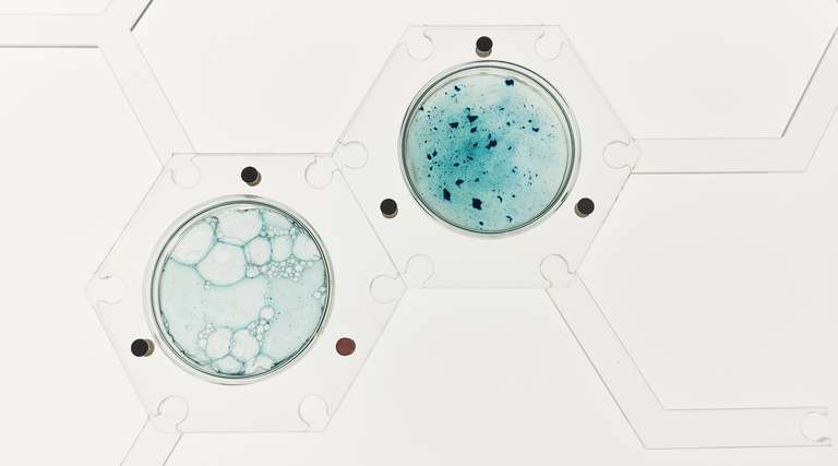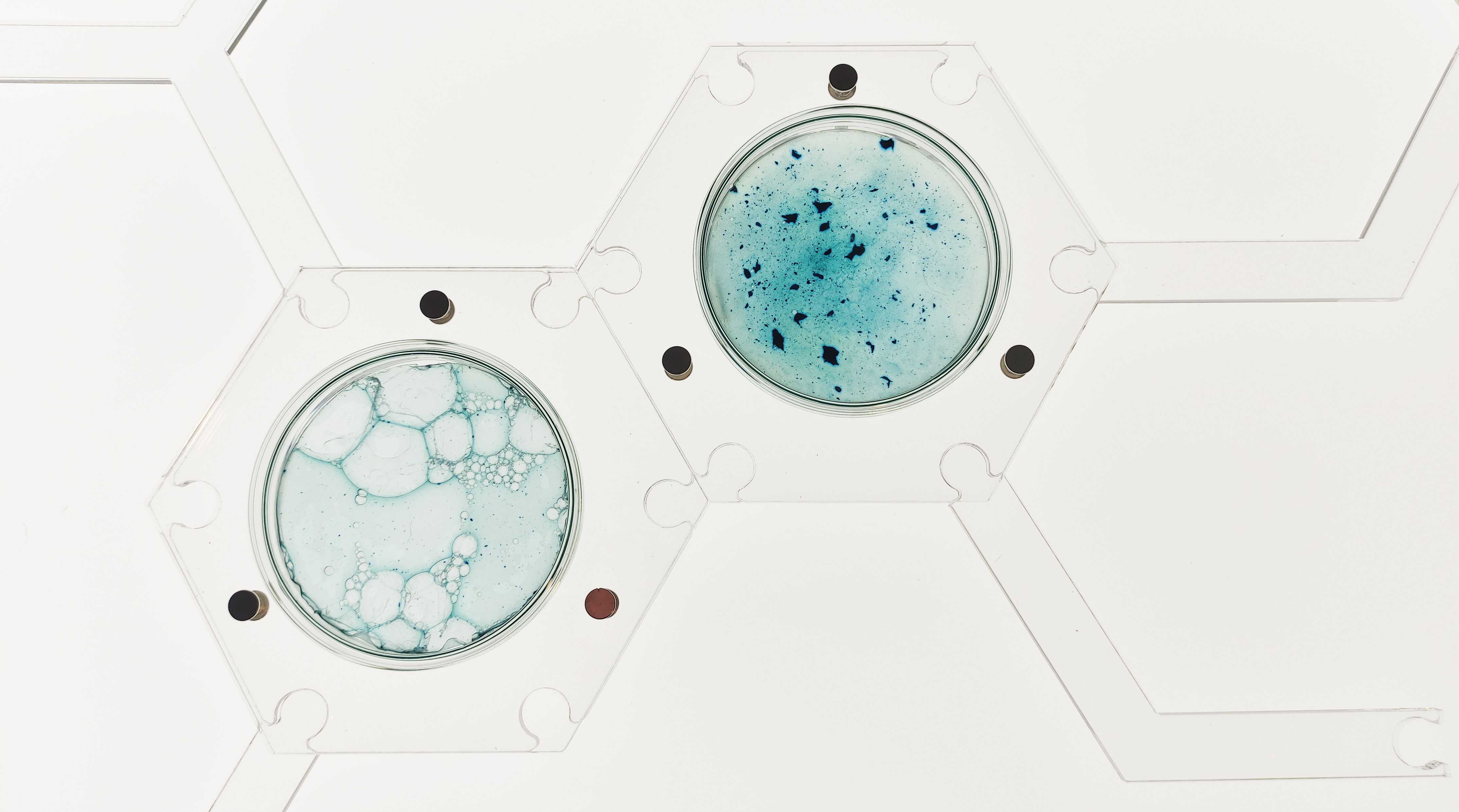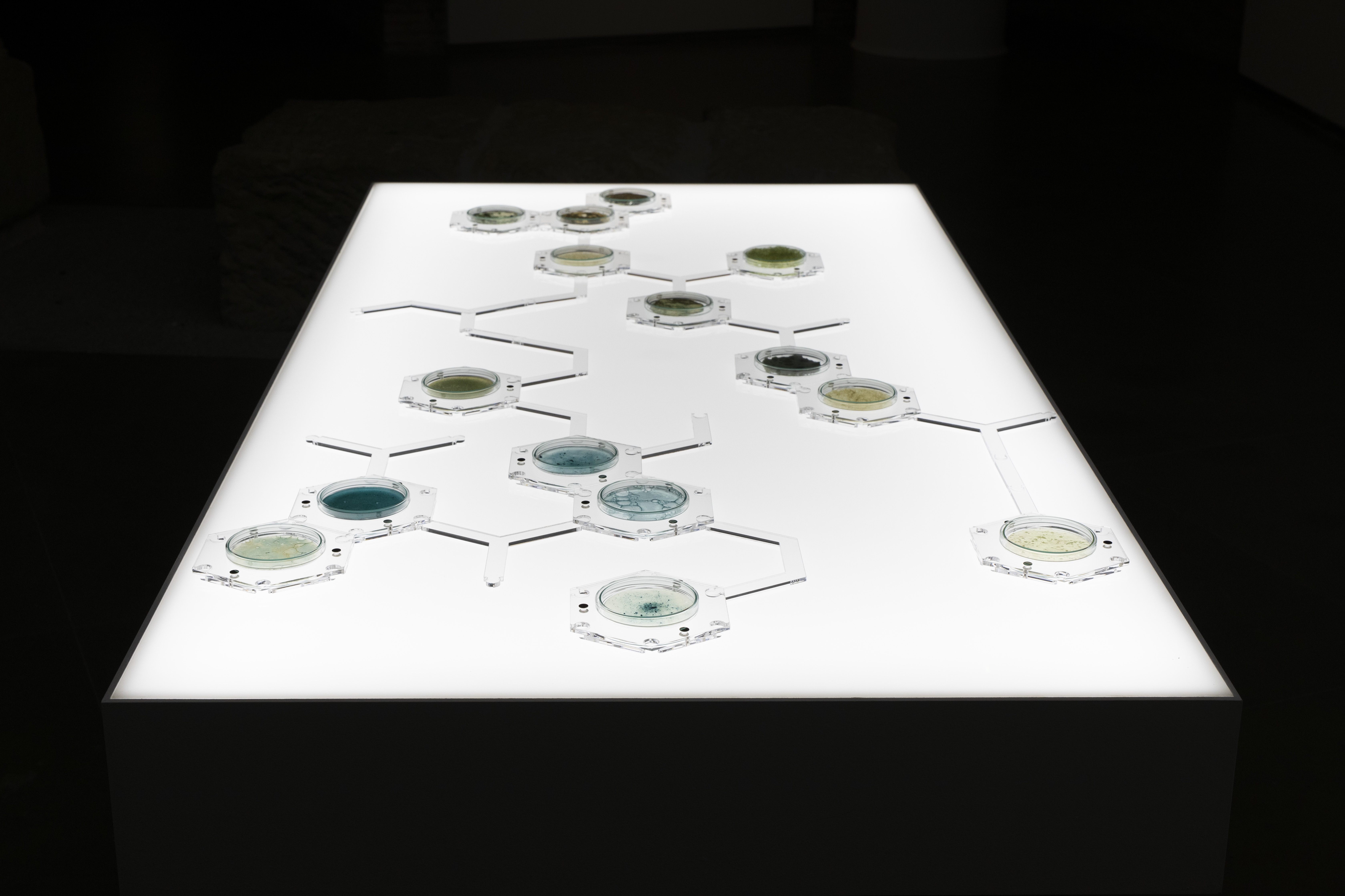 As part of this program, I am presenting my installation BioLabMatrix. This piece is designed as an experimental biomaterials lab where spirulina biomass (fresh or dehydrated) serves as the common element in its testing and formulation. BioLabMatrix acts as a library of materials, organized in a hexagonal matrix—an invisible lattice that, when illuminated, becomes a “game board” drawing viewers closer to the materiality of the biomaterials, preserved in glass Petri dishes. It’s a mosaic of connectors, links, and hexagons that helps reinterpret unconventional formulas within our bio-display.