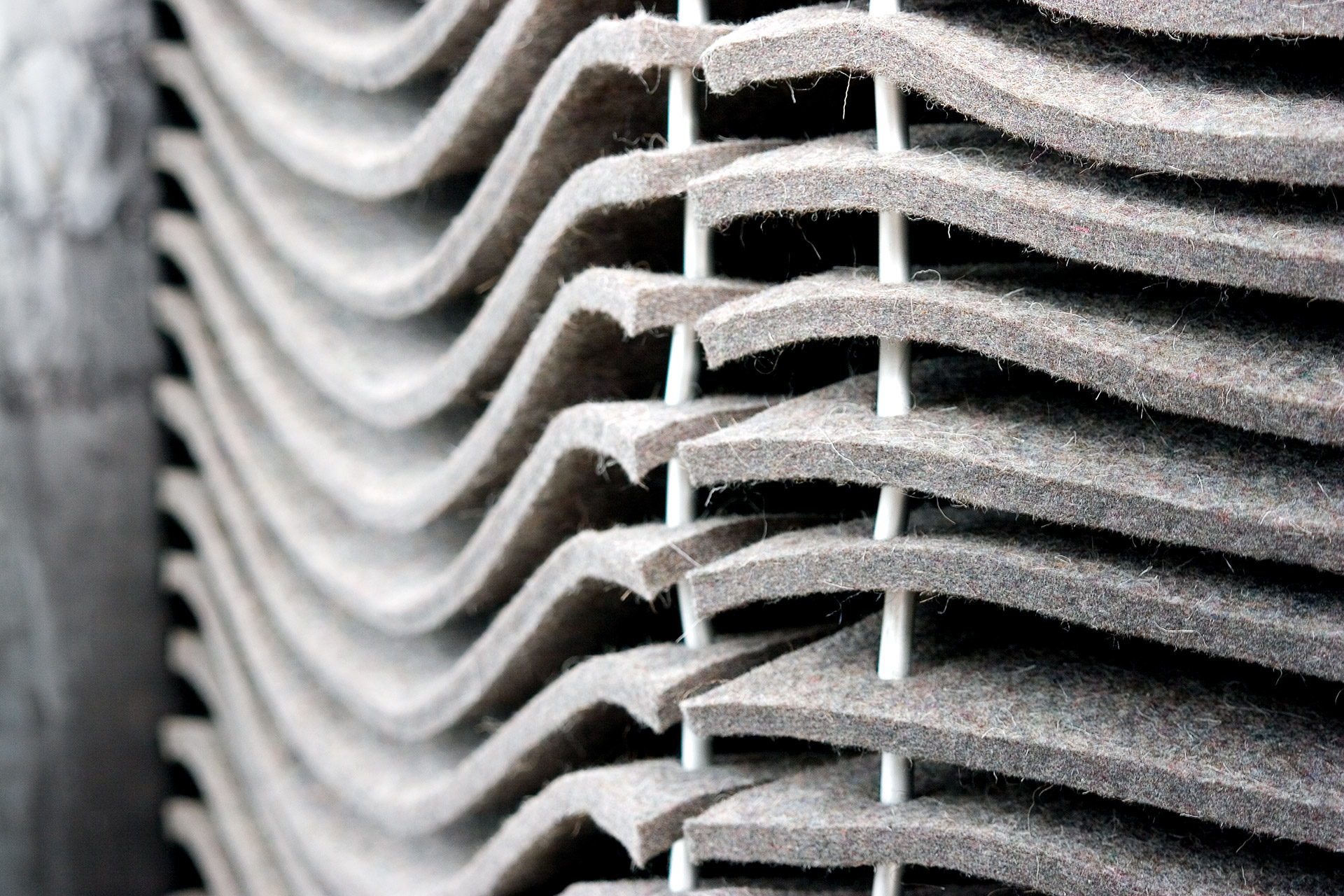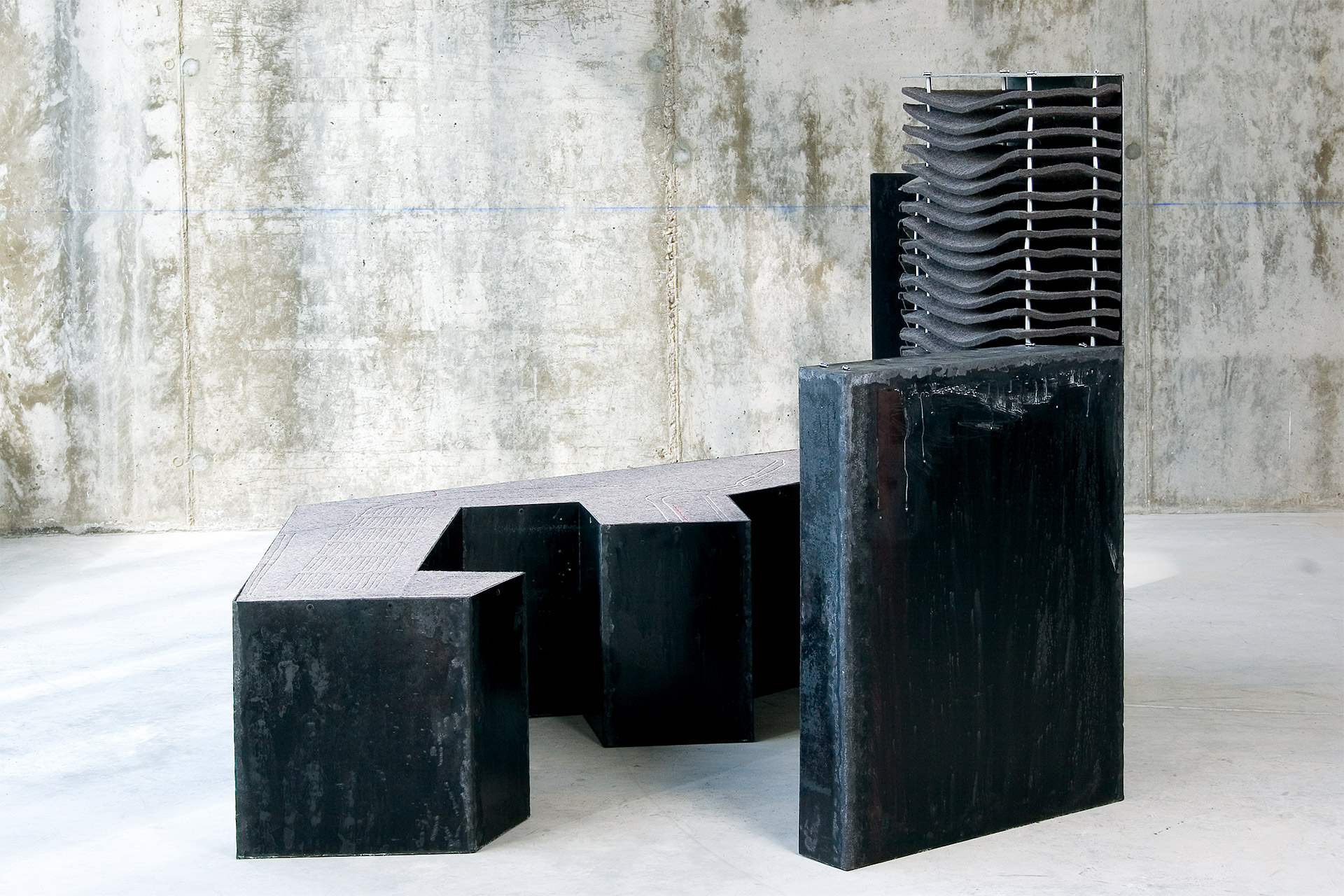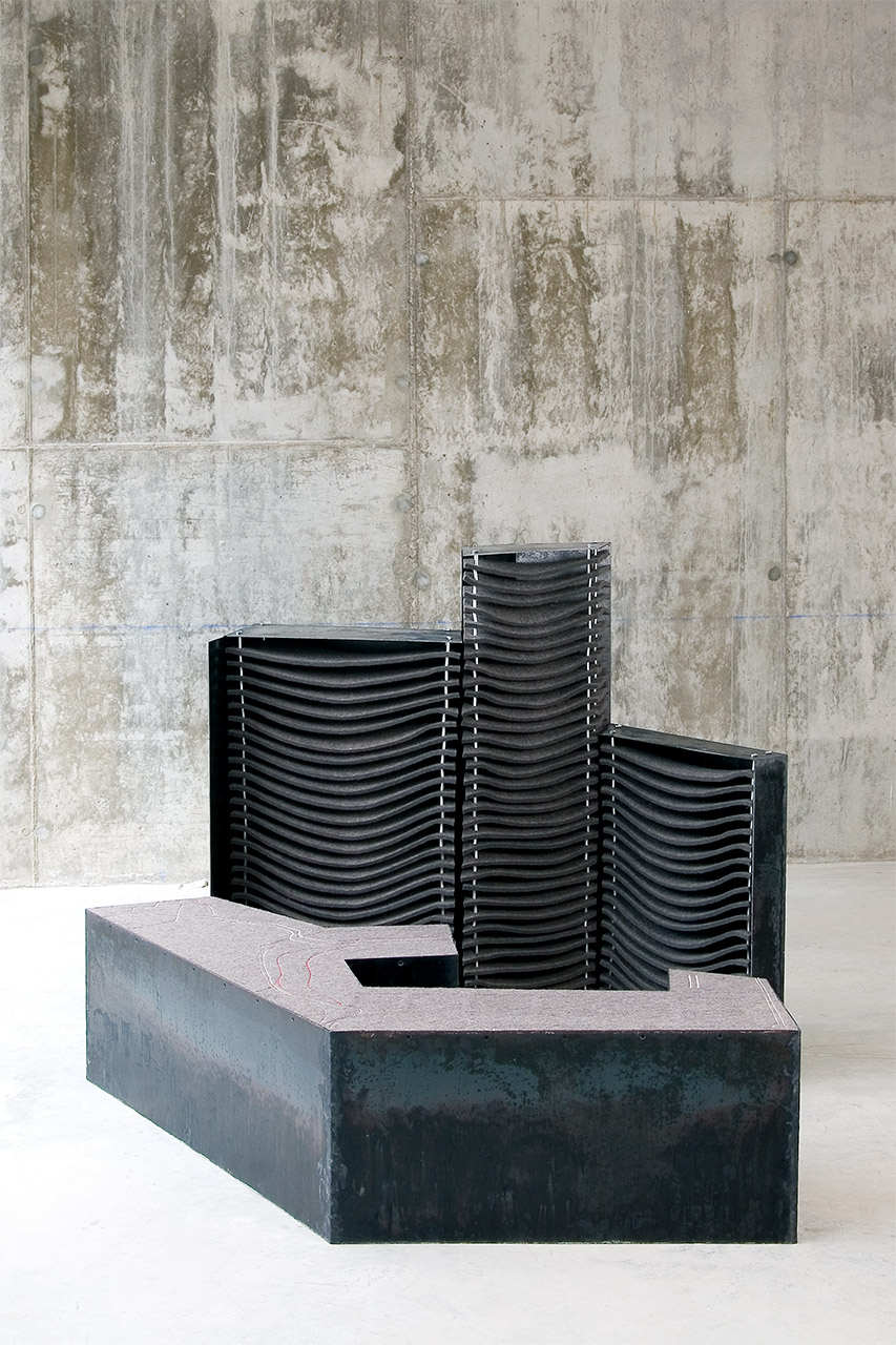Apilamiento Portuario works like a screen with three planes or wings. The iron manufacturing material of the shipyards, of the ships. A thick grey felt, which is piled up in different layers: its own weight gives it movement, it composes undulations as in a sea with calm waves, in which you can put your hand and wet it once you have lost your fear of the darkness of these waters. They are also sails that approach the coast, their refuge.