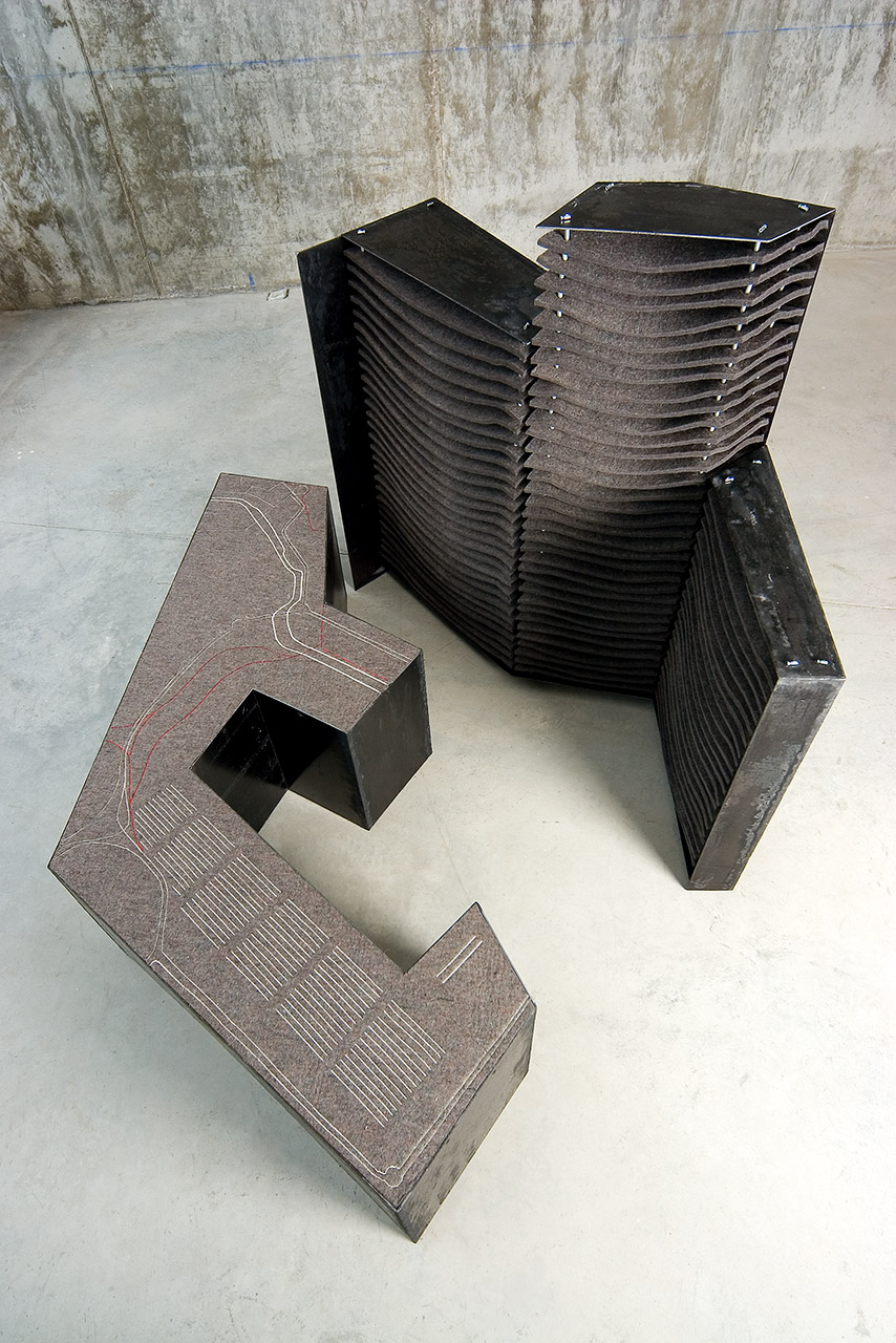 This sculptural assembly is made up of four pieces which, in this case, work together but which can also act separately. It all depends on whether we are looking for an exact situation, as if it were an aerial reconnaissance, or whether we lose ourselves in the lines of a formal abstraction that is also suggestive.