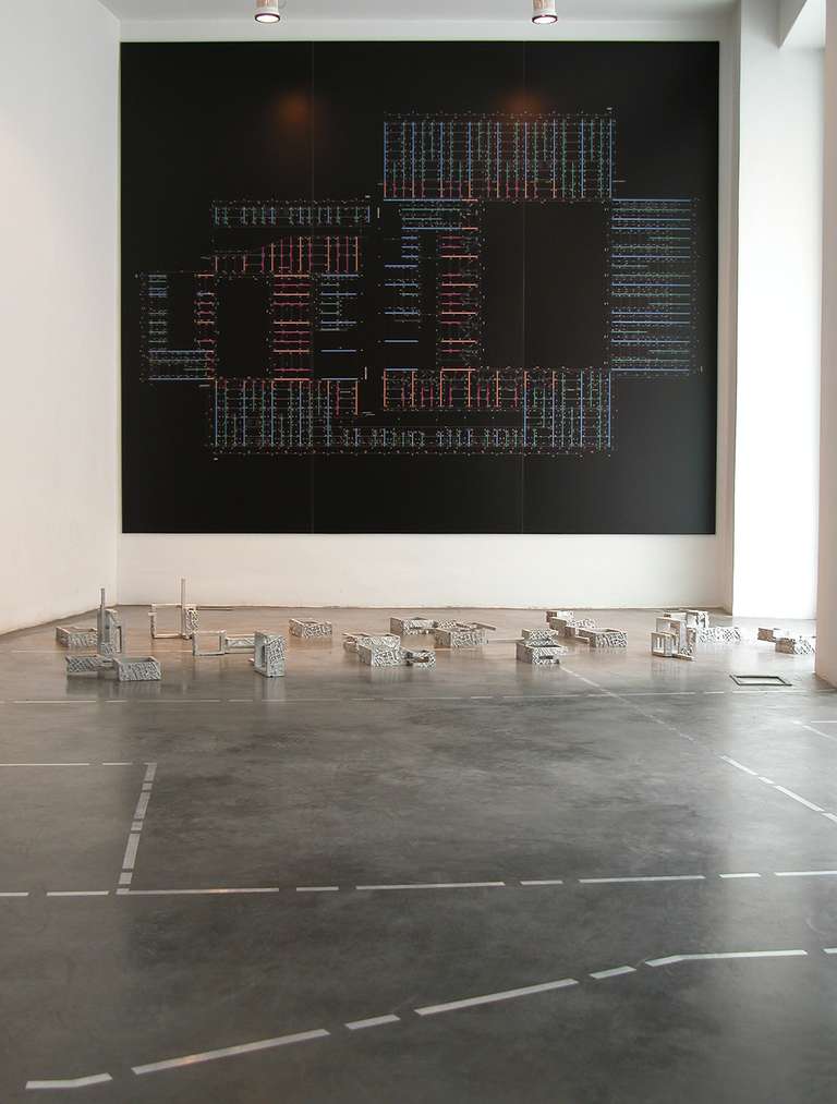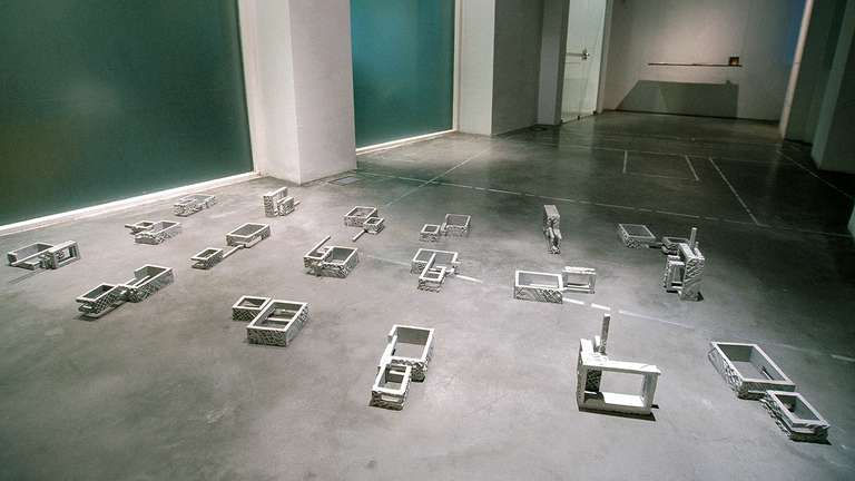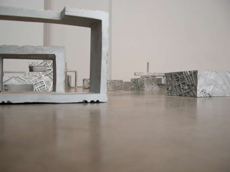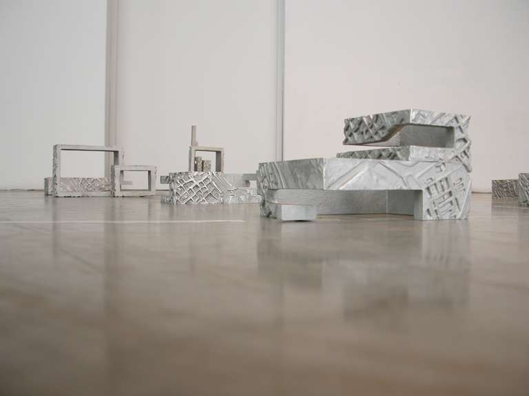 In the entrance area of the gallery 15 cast aluminum reproductions, made by Esther Pizarro, based on a sculptural interpretation of the Palacio de Exposiciones y Congresos de Mérida, are distributed on the floor as an installation, showing the viewer the multiple variations of the same model.