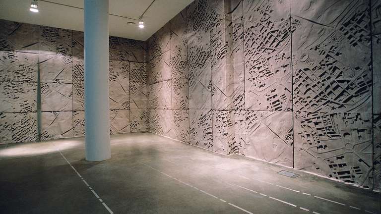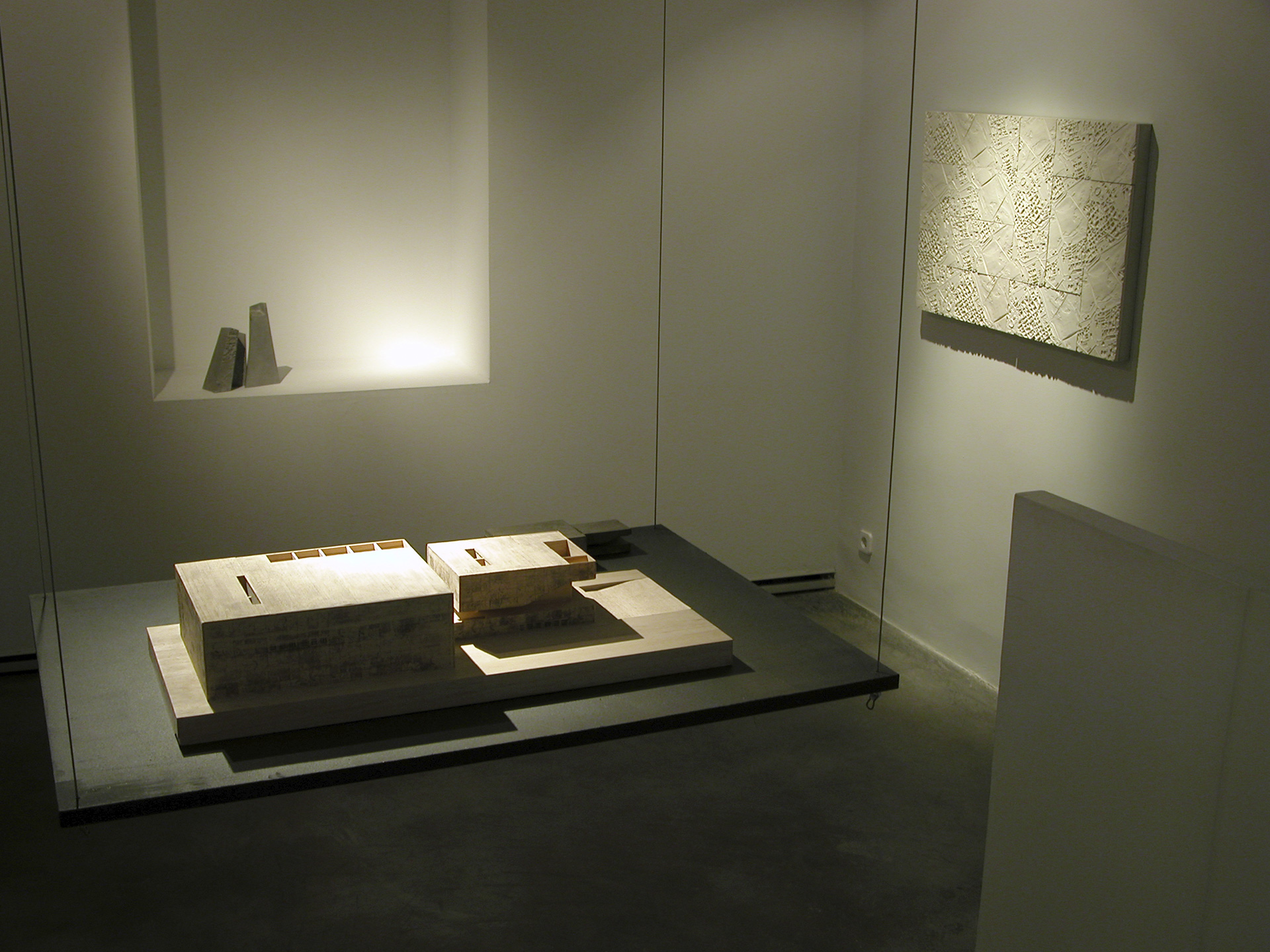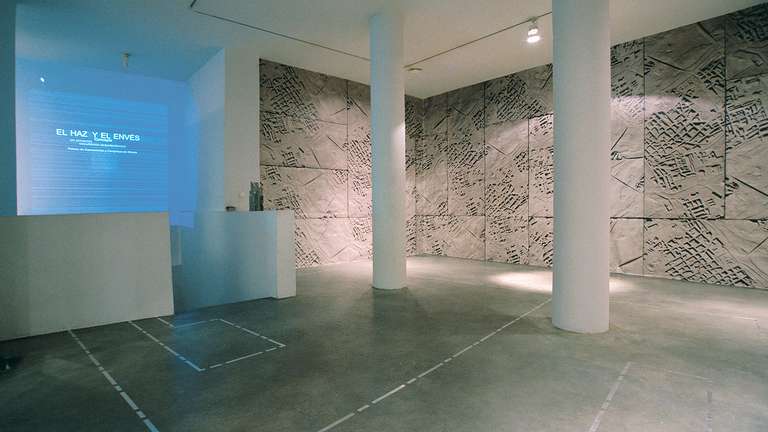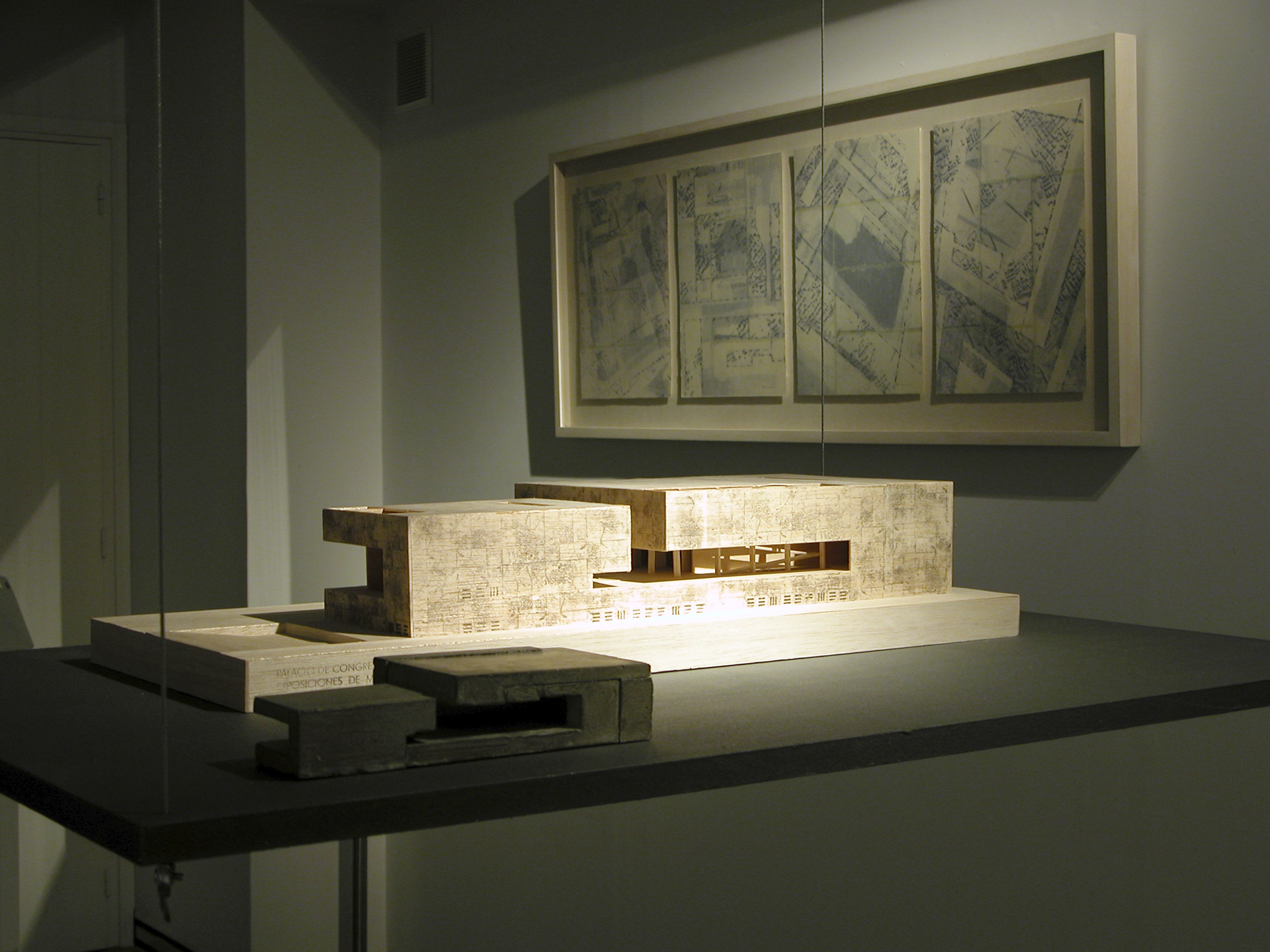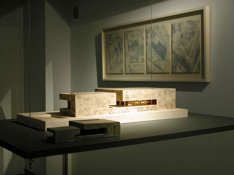 On the wall leading down to the lower floor of the gallery, a CD will be projected that contains all the information on the process and evolution of this unique collaboration between the architects Nieto-Sobejano and the sculptor Esther Pizarro. The lower floor is intended as a documentation center containing panels, a model and all the bibliographical references that have appeared to date on the Palacio de Exposiciones y Congresos de Mérida.