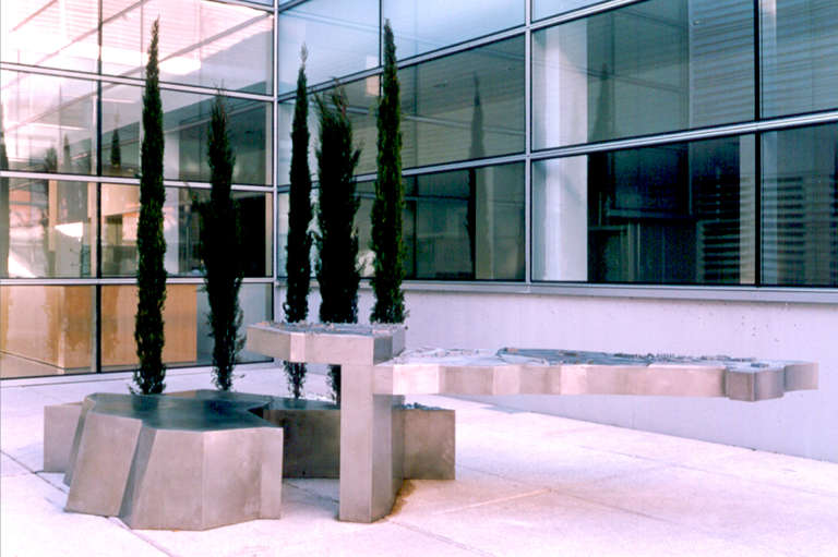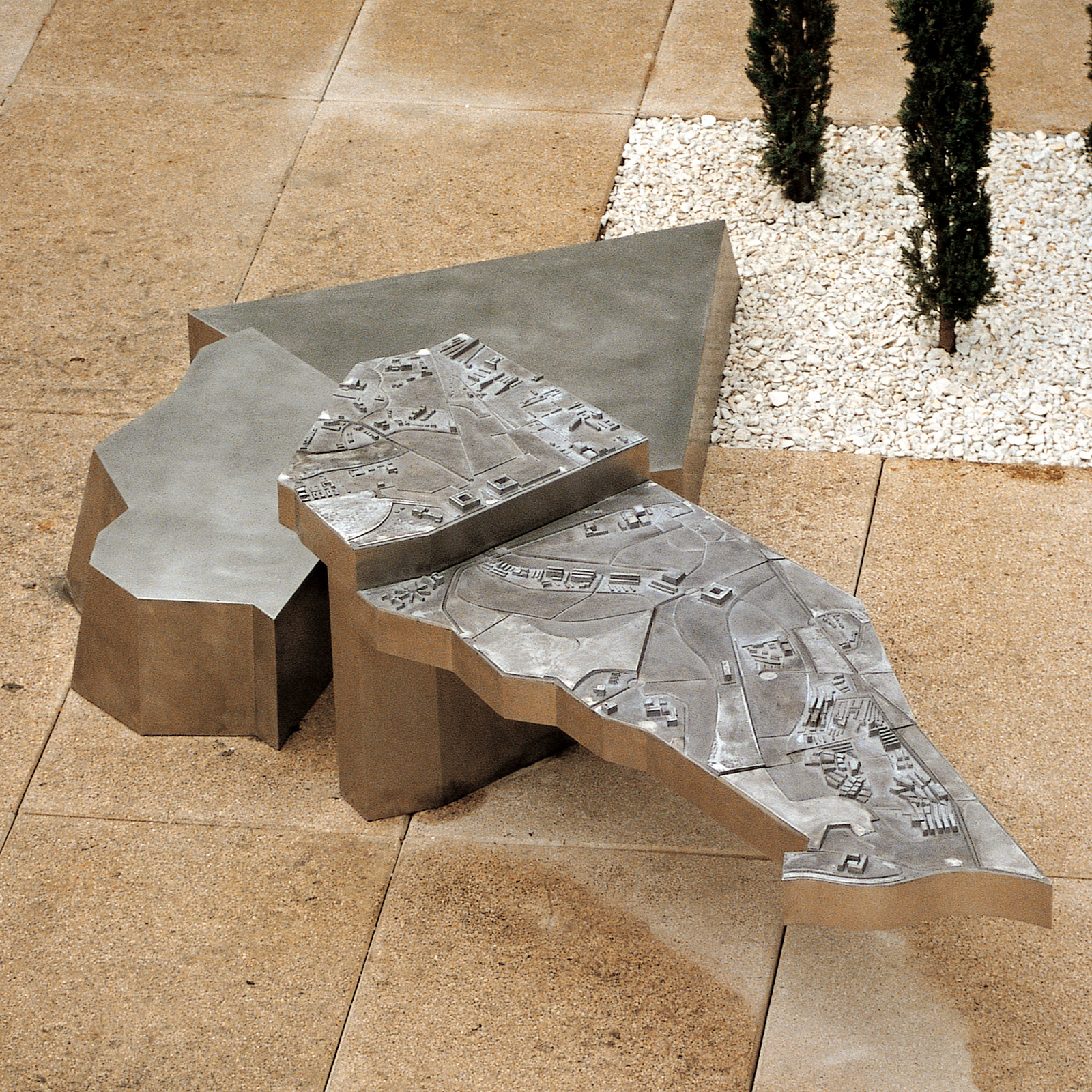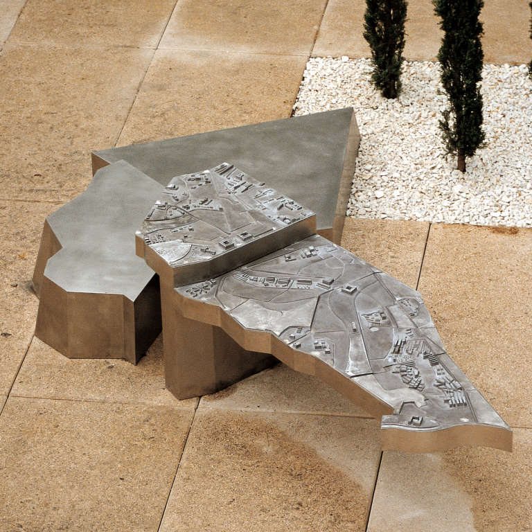 Functional Topography constitutes a metaphorical map of the Latina district, where it is located. The environment, the landscape, the history, the urban framework and the architectural constructions have been the source of inspiration for the creation of this sculptural group.