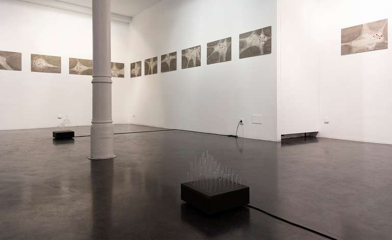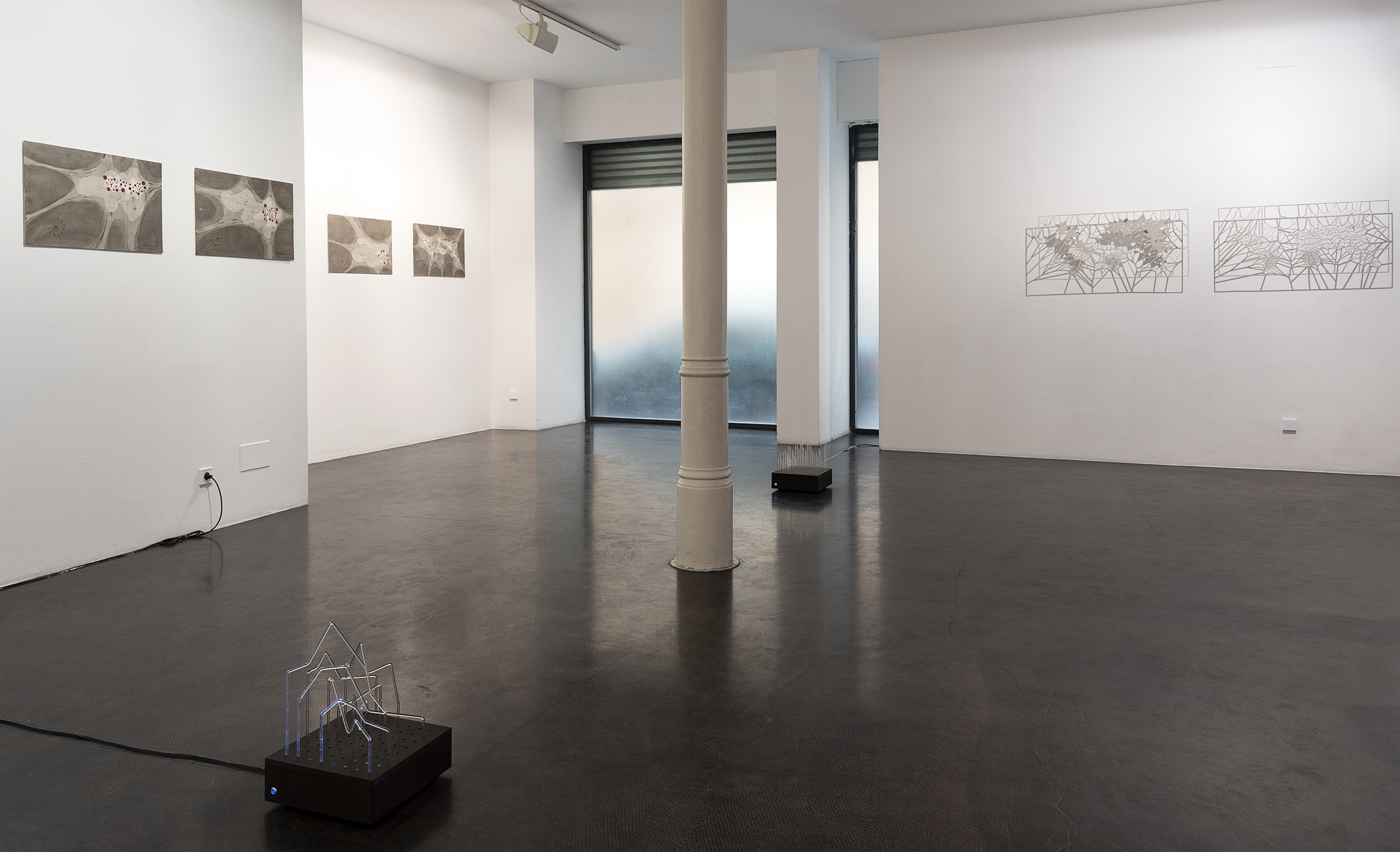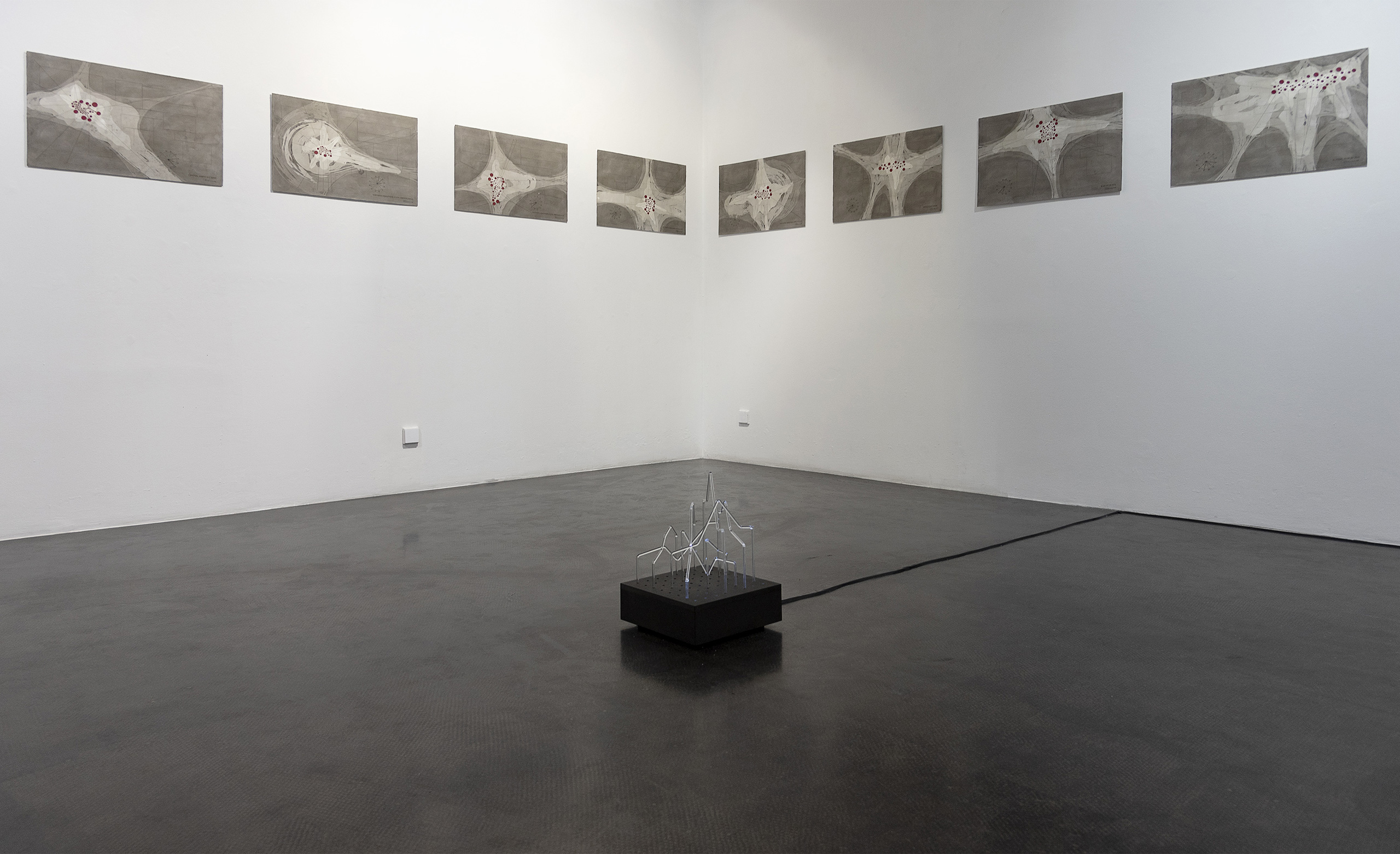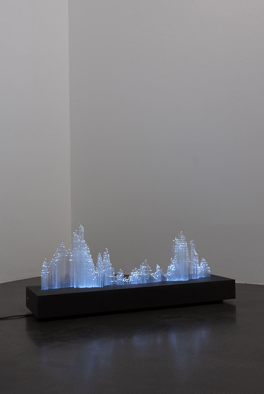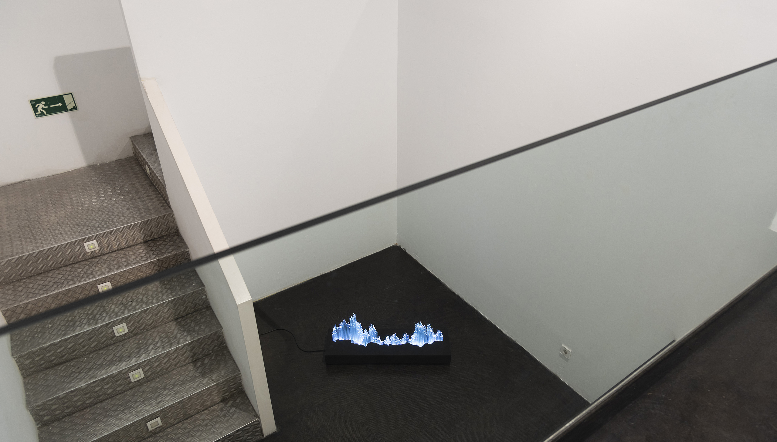 The exhibition is completed with small and medium-sized sculptures, made of borosilicate rod with light programming. Based on forest fire data, but this time decontextualized from their geographical space, they formulate dynamic gazes based on the refraction of light from abstract graphs and diagrams. A methodological exercise of the infinite possibilities offered by the visualization of data-based information.