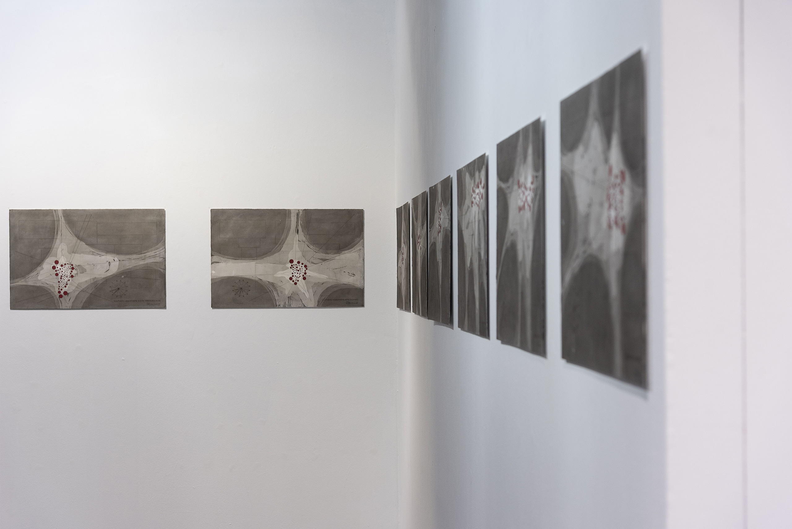 As a continuation of this line of work, Ponce+Robles presents the series [MAFD] :: Drawings, a set of fourteen drawings where each one of them refers to a geographical area of the terrestrial planisphere, according to the spatial division of the Global Fire Emissions Database (GFED). These are diagrammatic cartographies, based on the principle of the Voronoi Diagram, a type of generative computational geometry based on the concept of Euclidean metric distance. The different geometric patterns are generated from the identification in the images extracted from the Moderate Resolution Imaging Spectroradiometer (MODIS) of the centroids, the origin of fire outbreaks. The resulting geometric lattice in each mapping gives us an idea of the areas affected by large fires and the clustering or dispersion of CO2 emissions. The greater the concentration of fires and gases (centroids), the tighter the cell; and the greater the dispersion of fire outbreaks, the larger the resulting area. A mapping based on the visualisation logic of the "point density map" where each red circle represents the focus of an area devastated by fire. At a second level are the rest of the geographical areas that make up the terrestrial planisphere, identified only by a rectangle outlining their area of extension. The data contribution is reinforced with a radial graph, where an average of the number of fires per month in the geographical area in question is indicated.