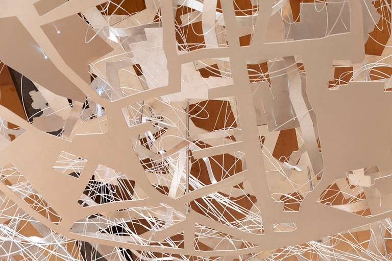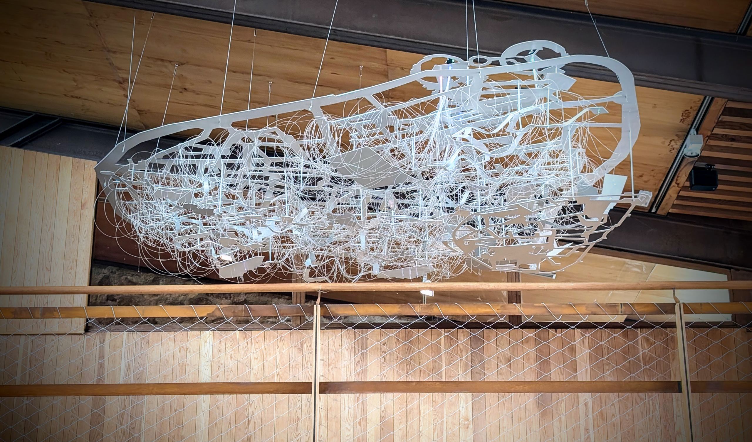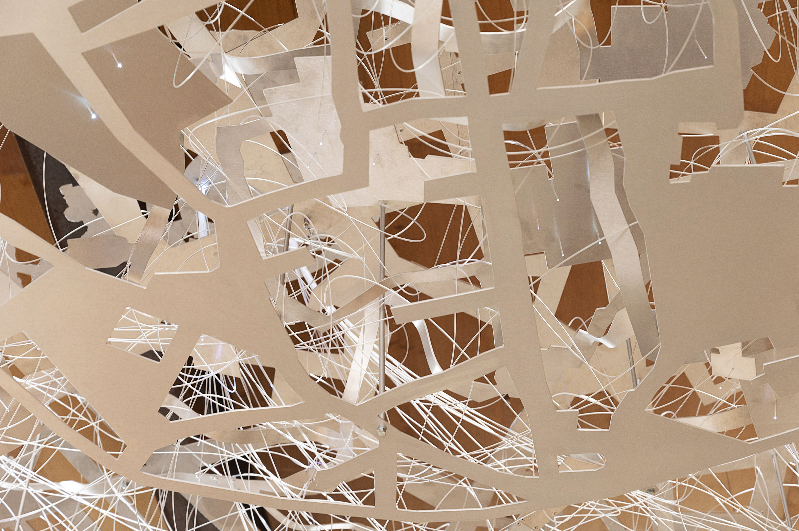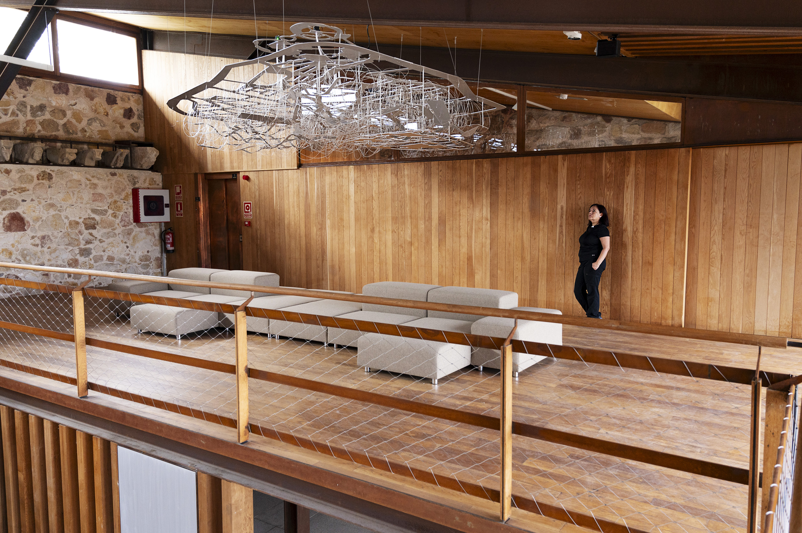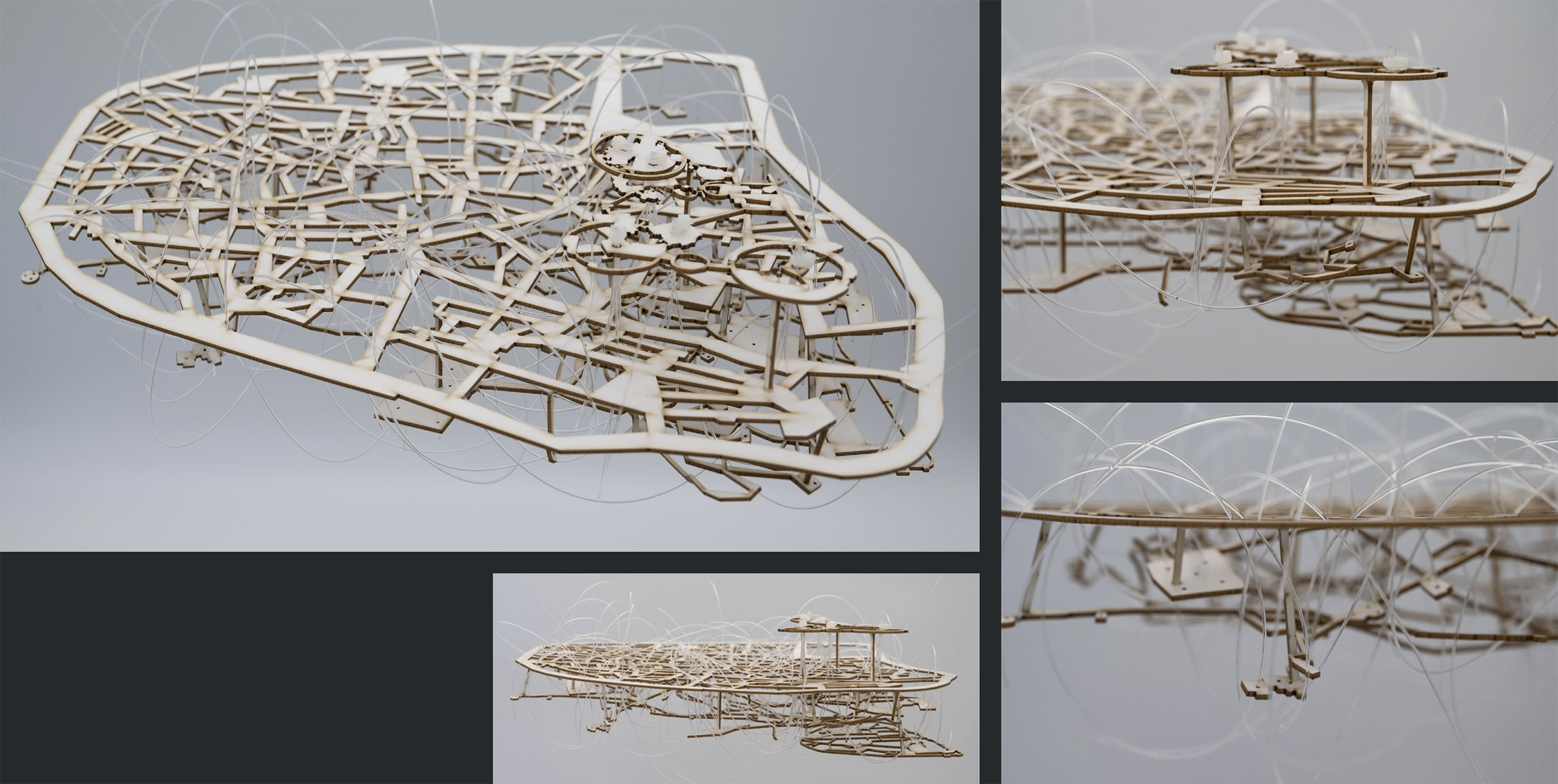 Below lies contemporary Salamanca, depicted as a flat, tensioned metallic framework following the current urban layout of the city’s main streets and avenues. Further down is 15th-century Salamanca, organized through five primary routes: municipal, palatial, ecclesiastical, conventual, and educational. These routes intersect dynamically, forming a rhizomatic structure that evokes a fluid topography. At the lowest level lies 12th- and 13th-century Salamanca, characterized by the Cerca Vieja, the ancient city wall that defined the central core and laid the foundation for the modern city.
