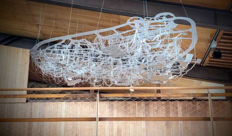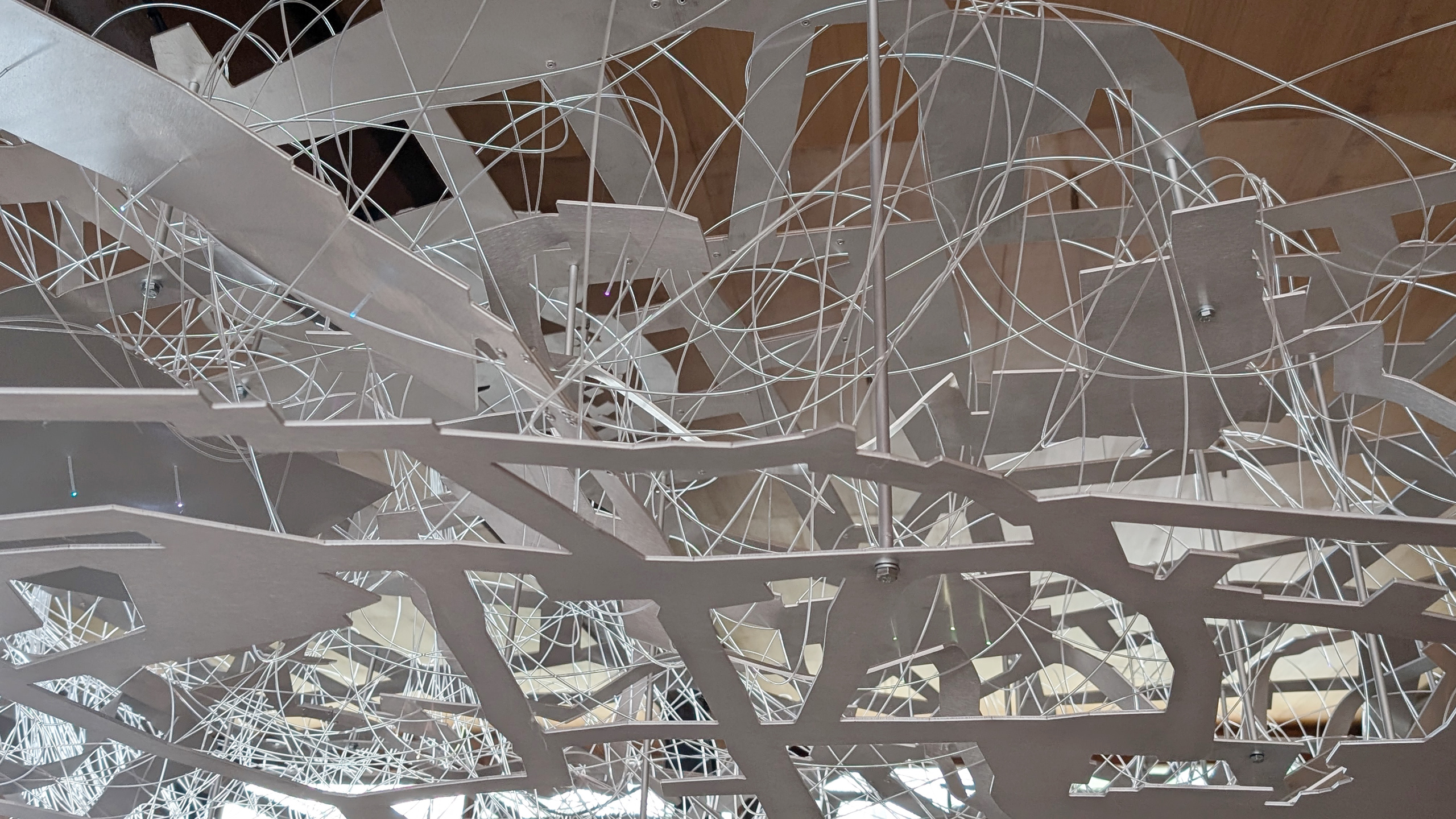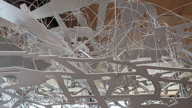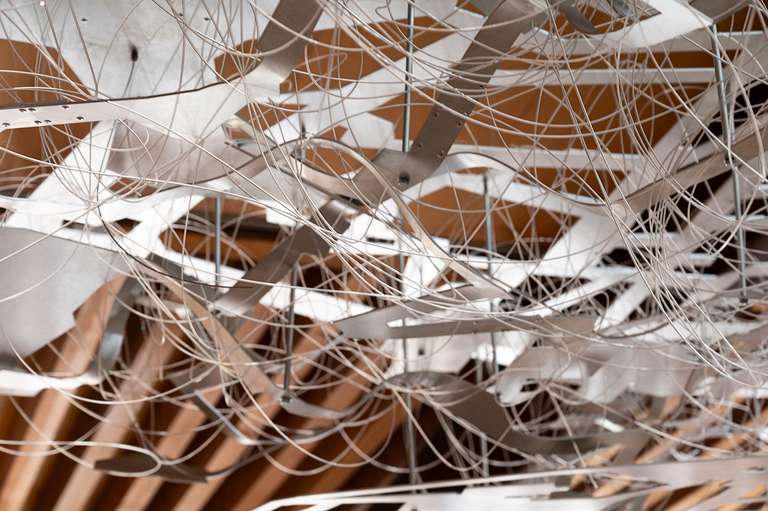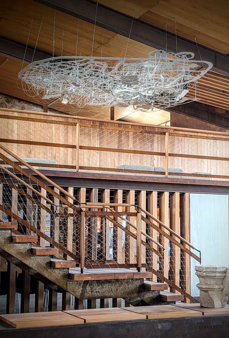 Formally, the installation is structured as a series of metallic pathways that intertwine spatial and temporal layers. At the top is the layer of the Castros, Salamanca’s first stable human settlement, dating back to the Early Iron Age (8th–4th centuries BC) and located on San Vicente Hill. This layer forms the technological heart of the installation, from which five luminous cores (RGB lasers) emanate, controlling and connecting the represented historical layers.