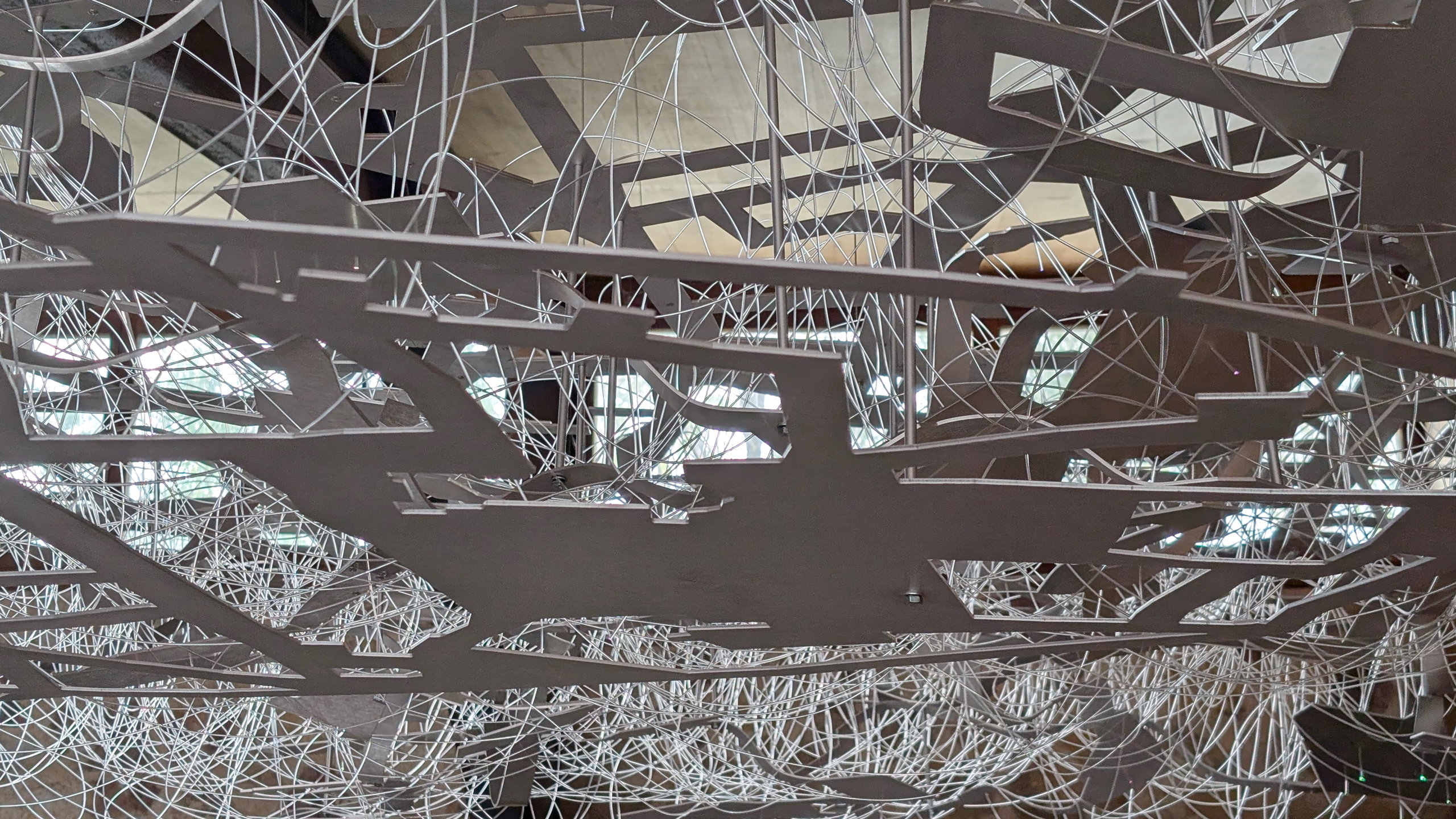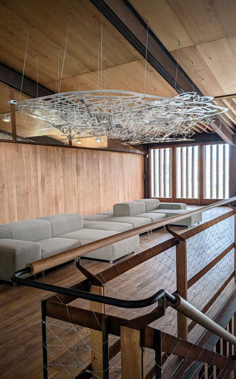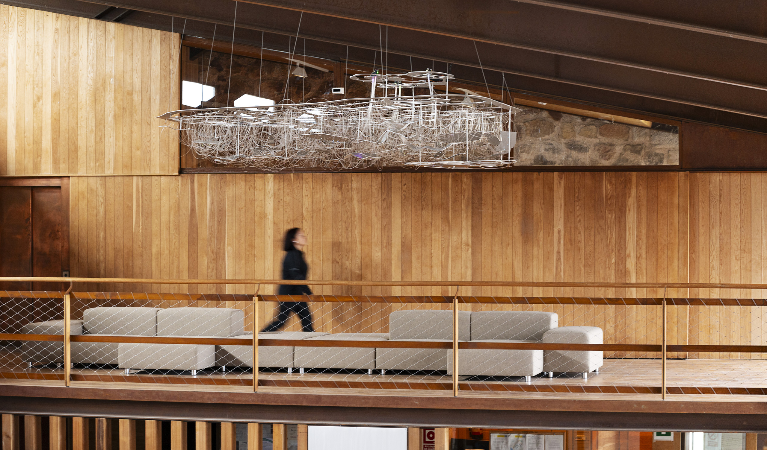Formally, the installation is structured as a series of metallic pathways that intertwine spatial and temporal layers. At the top is the layer of the Castros, Salamanca’s first stable human settlement, dating back to the Early Iron Age (8th–4th centuries BC) and located on San Vicente Hill. This layer forms the technological heart of the installation, from which five luminous cores (RGB lasers) emanate, controlling and connecting the represented historical layers.