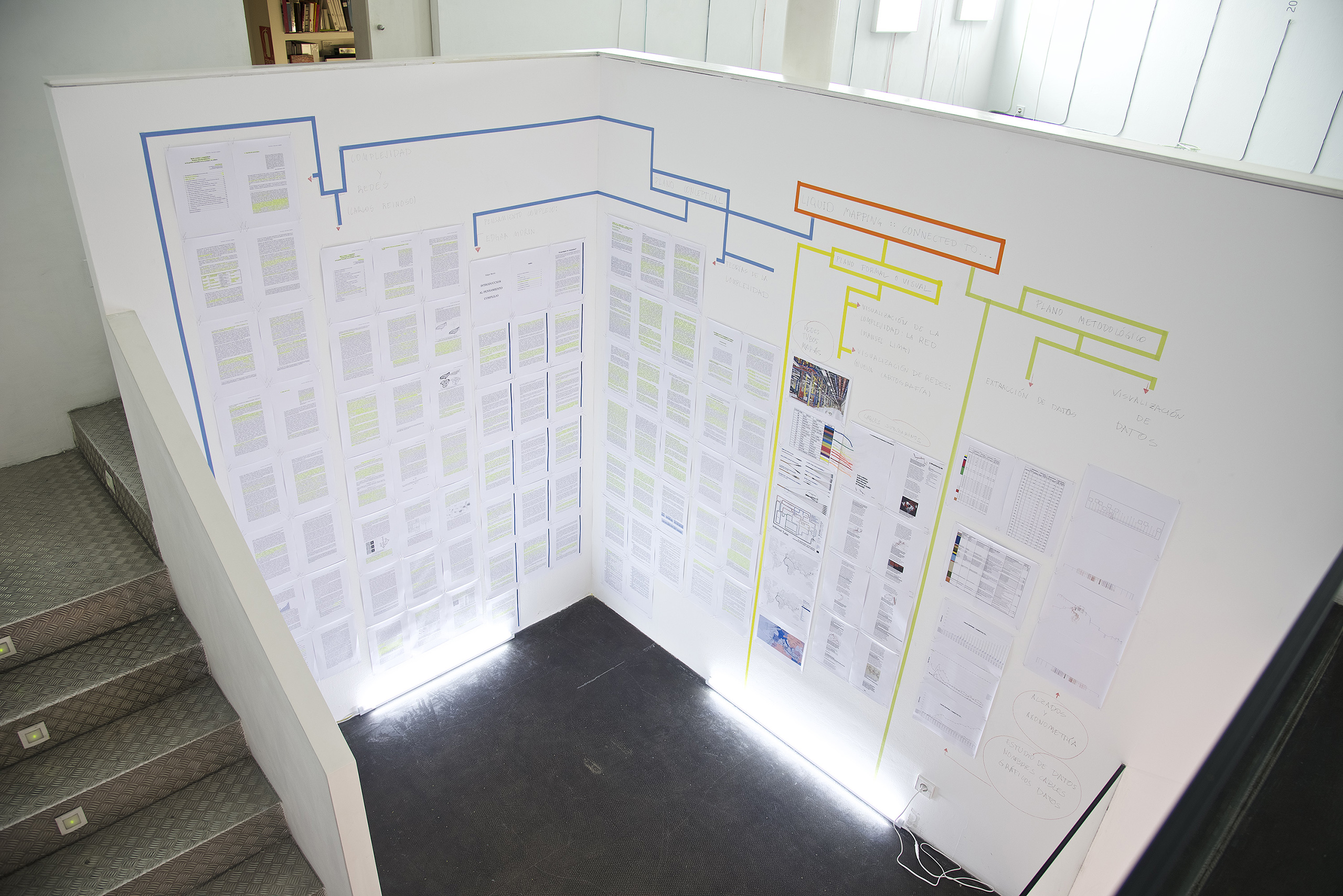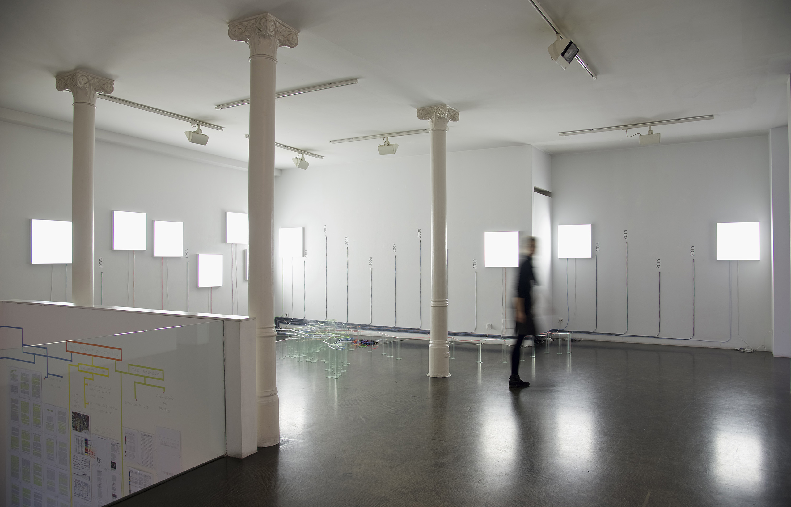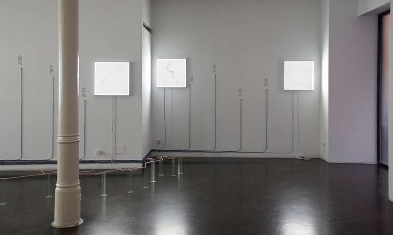 The floor installation is connected to the corner of the gallery through a conduit that houses all the coloured cables to be distributed in an orderly fashion along the vertical plane of the gallery and generate a "timeline" of the growth of this map of connectivity. Each cable will end up in its corresponding year of implantation, and will feed a luminous screen, almost like a computer monitor, where the cables built in that year are decontextualised separately from the geographic set, to visualise them in their linear description, with their geographic coordinates, together with the data legend that conceptualises the installation. A total of ten screens represent the years in which there has been activity in the construction of submarine cables in our country, and build the timeline that runs along three walls of the gallery, establishing a visual continuity and temporal space in the exhibition as a whole. Finally, a soundscape of underwater cables will envelop the whole, introducing the spectator into an almost aquatic and metallic scenography.
