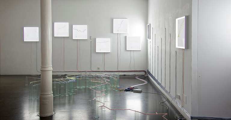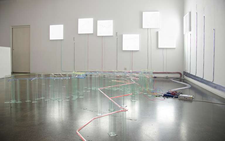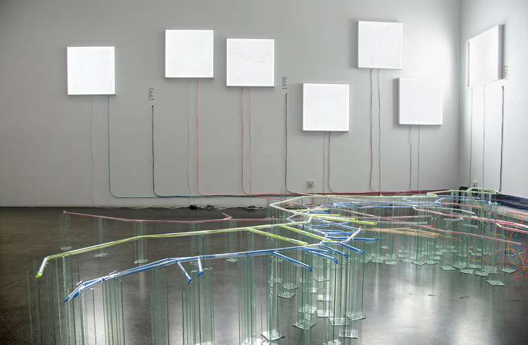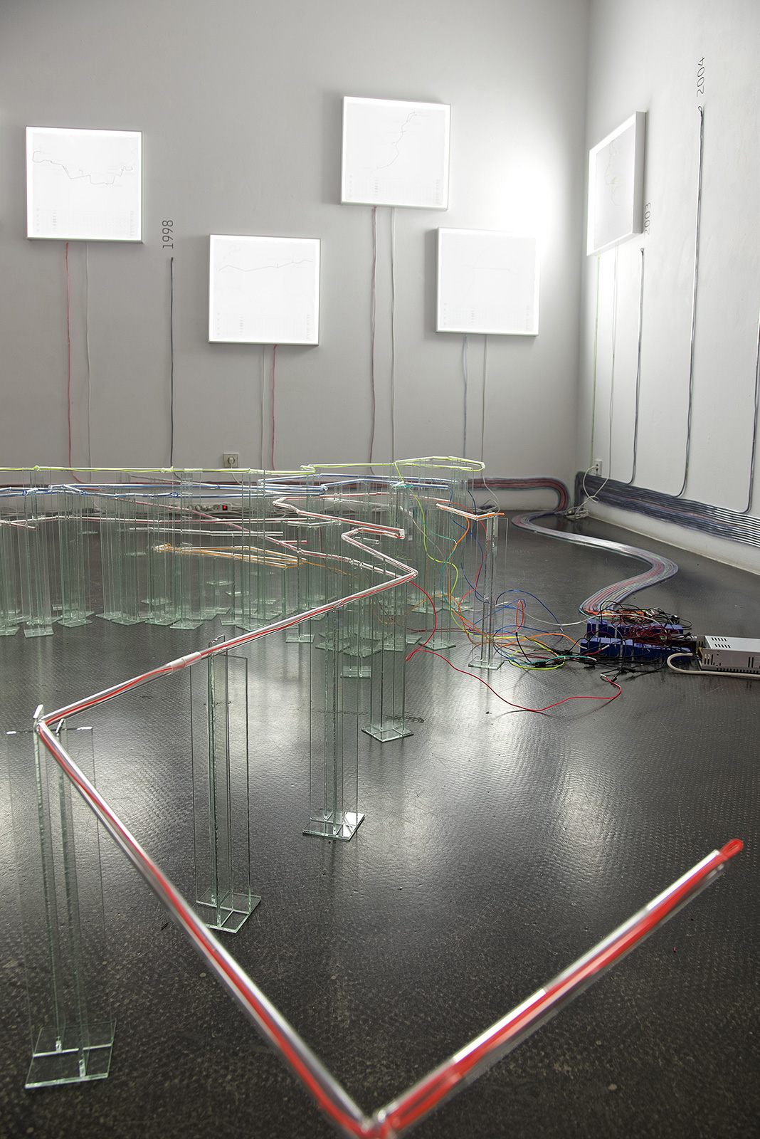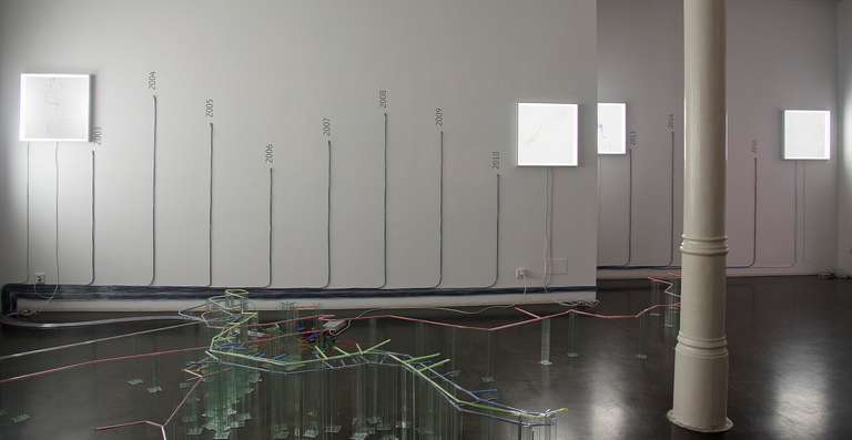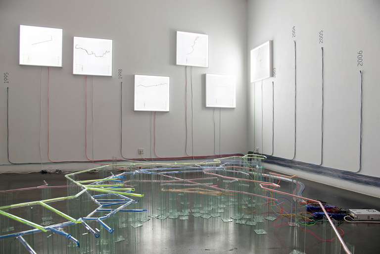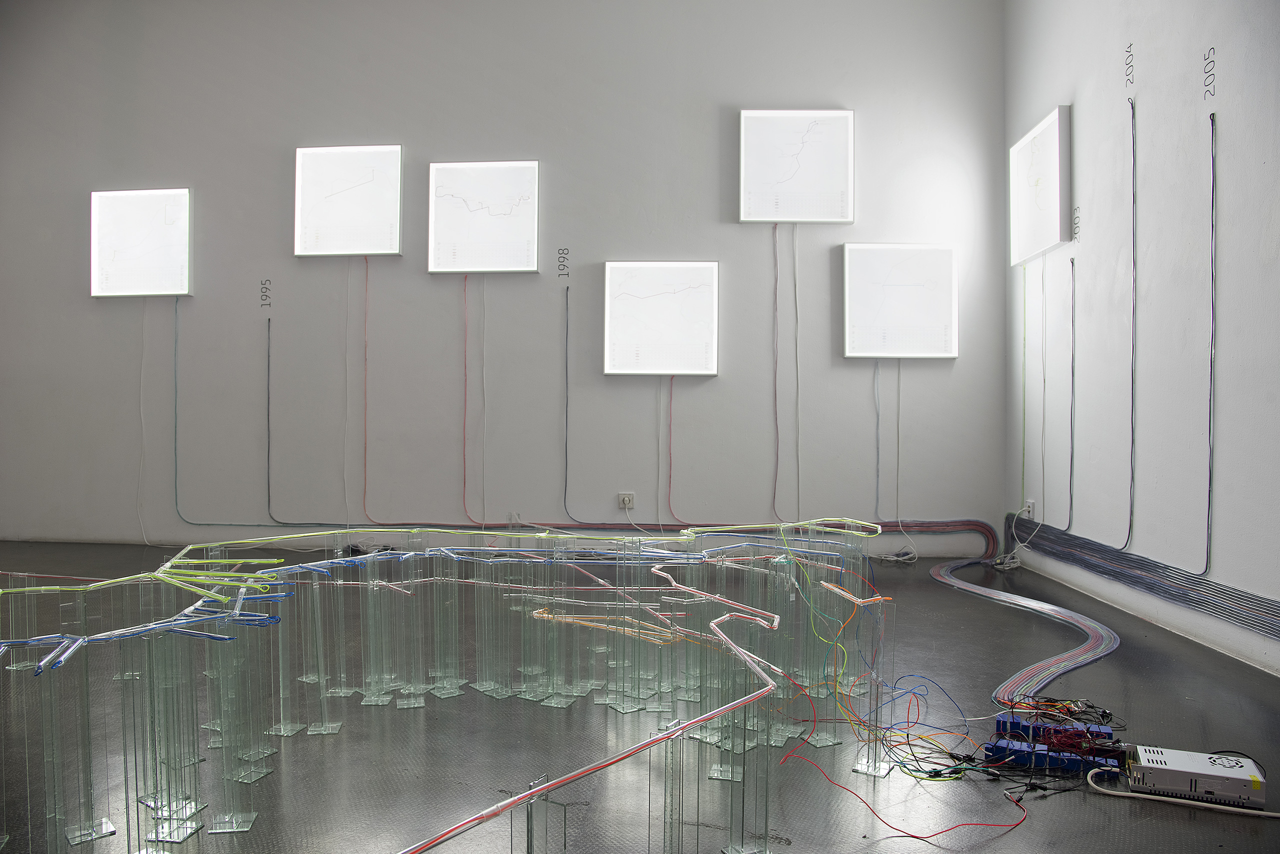 The exhibition space becomes a large installation of coloured electroluminescent cable tubes (according to their year of implantation) arranged horizontally and at different heights on the floor of the room, which three-dimensionally trace the underwater layout of the twenty-one submarine cables that connect our geography with the rest of the planet. All the cables implanted in the same year have a similar colour, for quick identification, and are constructed with a transparent glass tube through which a line of light circulates; a rhizome of coloured threads with a dynamic flow of intensity and fluctuation.