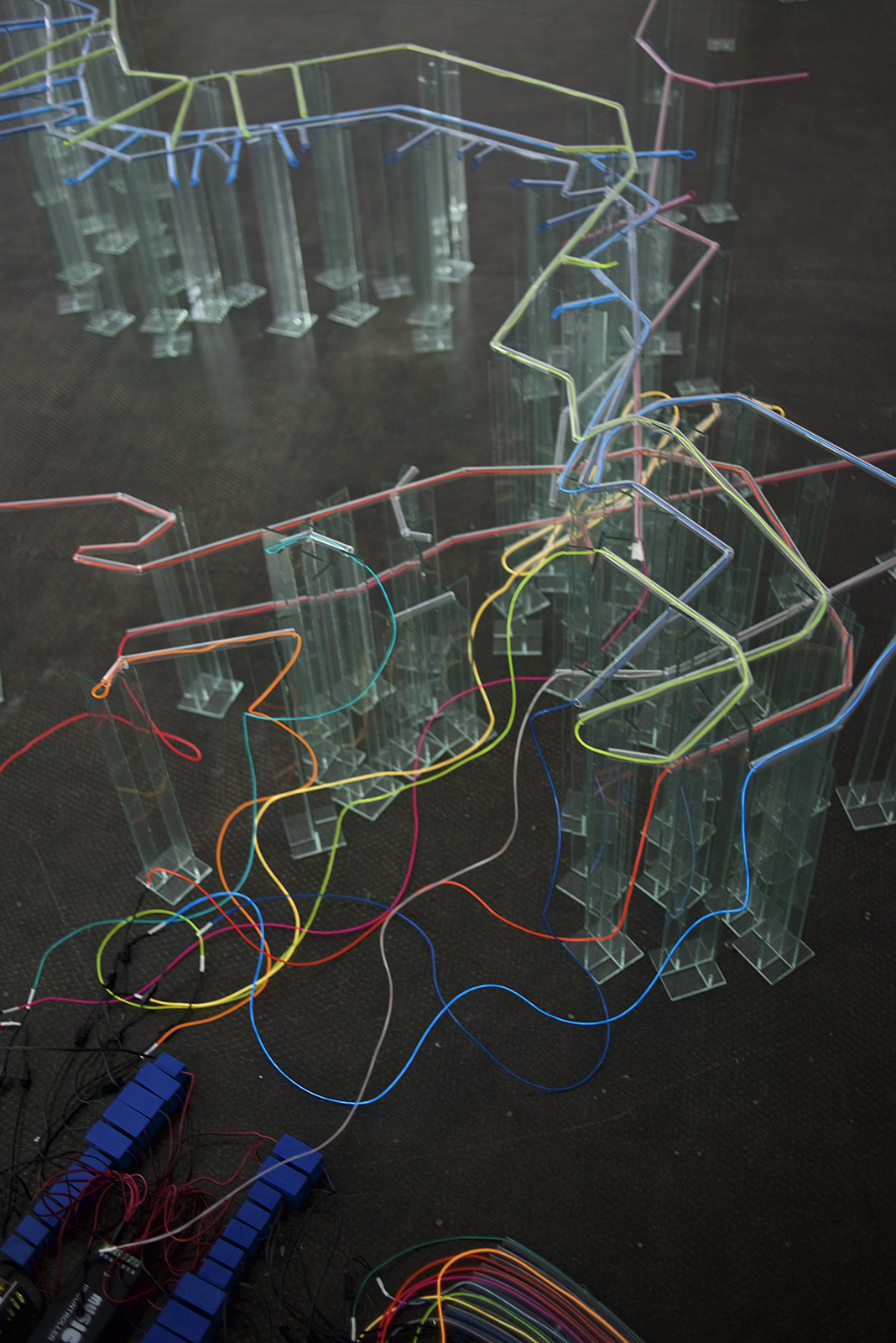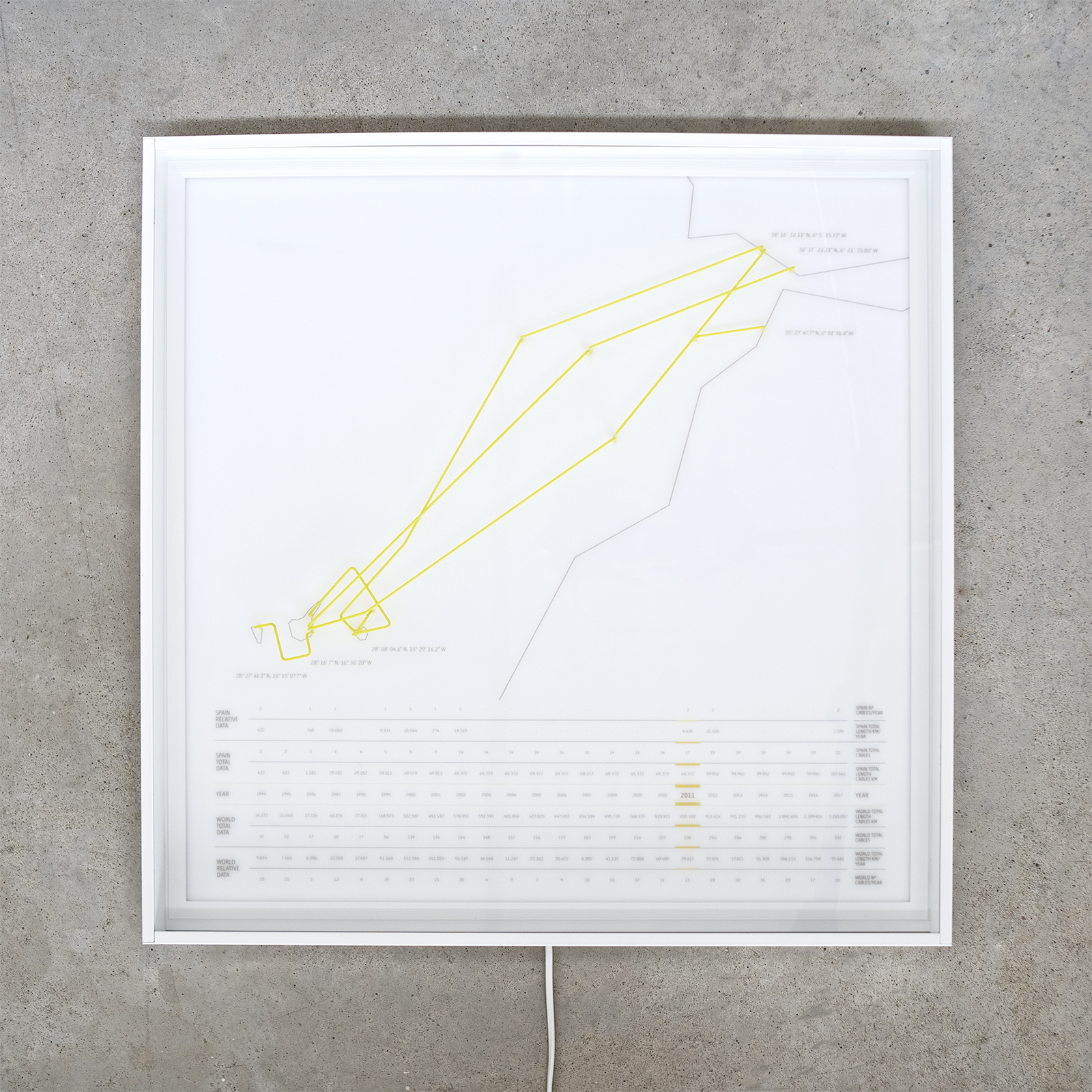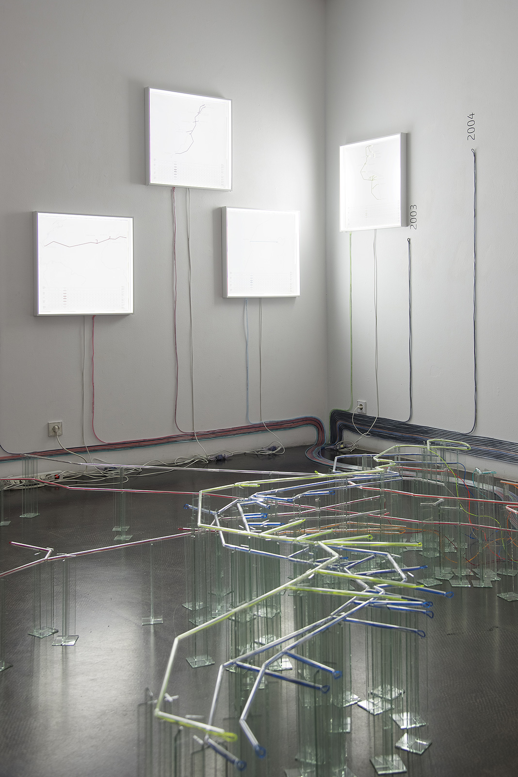 The exhibition space becomes a large installation of coloured electroluminescent cable tubes (according to their year of implantation) arranged horizontally and at different heights on the floor of the room, which three-dimensionally trace the underwater layout of the twenty-one submarine cables that connect our geography with the rest of the planet. All the cables implanted in the same year have a similar colour, for quick identification, and are constructed with a transparent glass tube through which a line of light circulates; a rhizome of coloured threads with a dynamic flow of intensity and fluctuation.