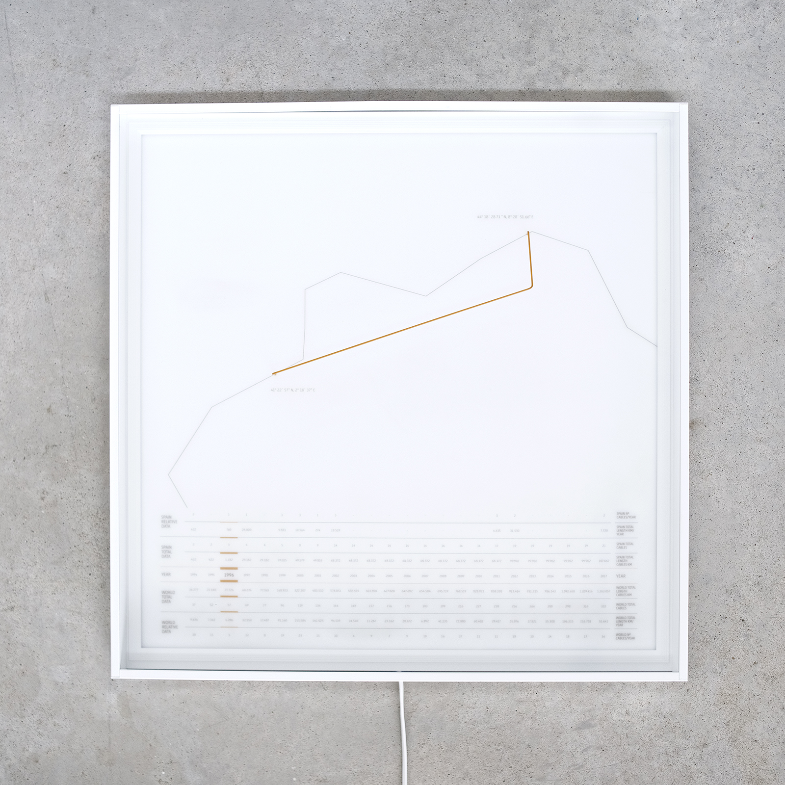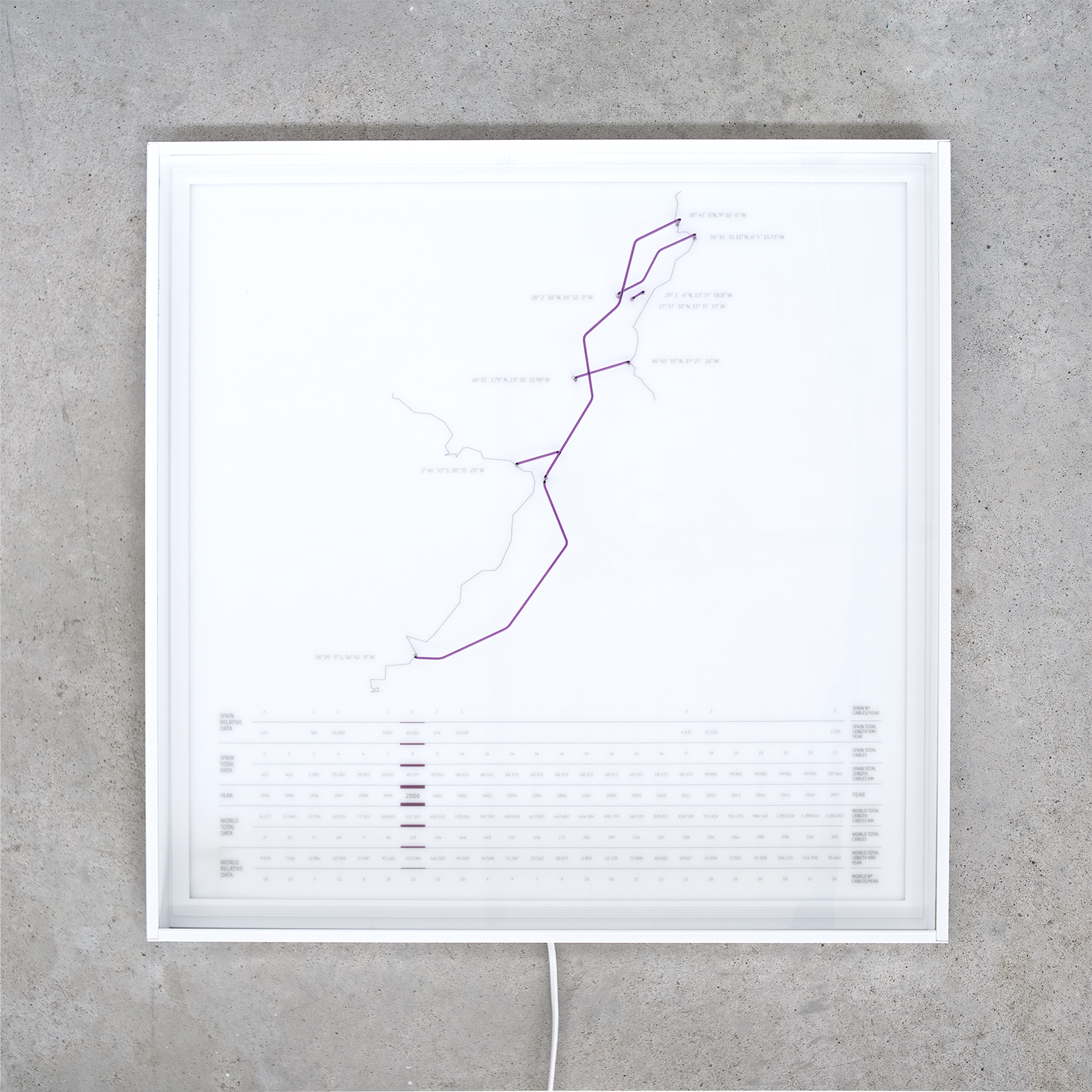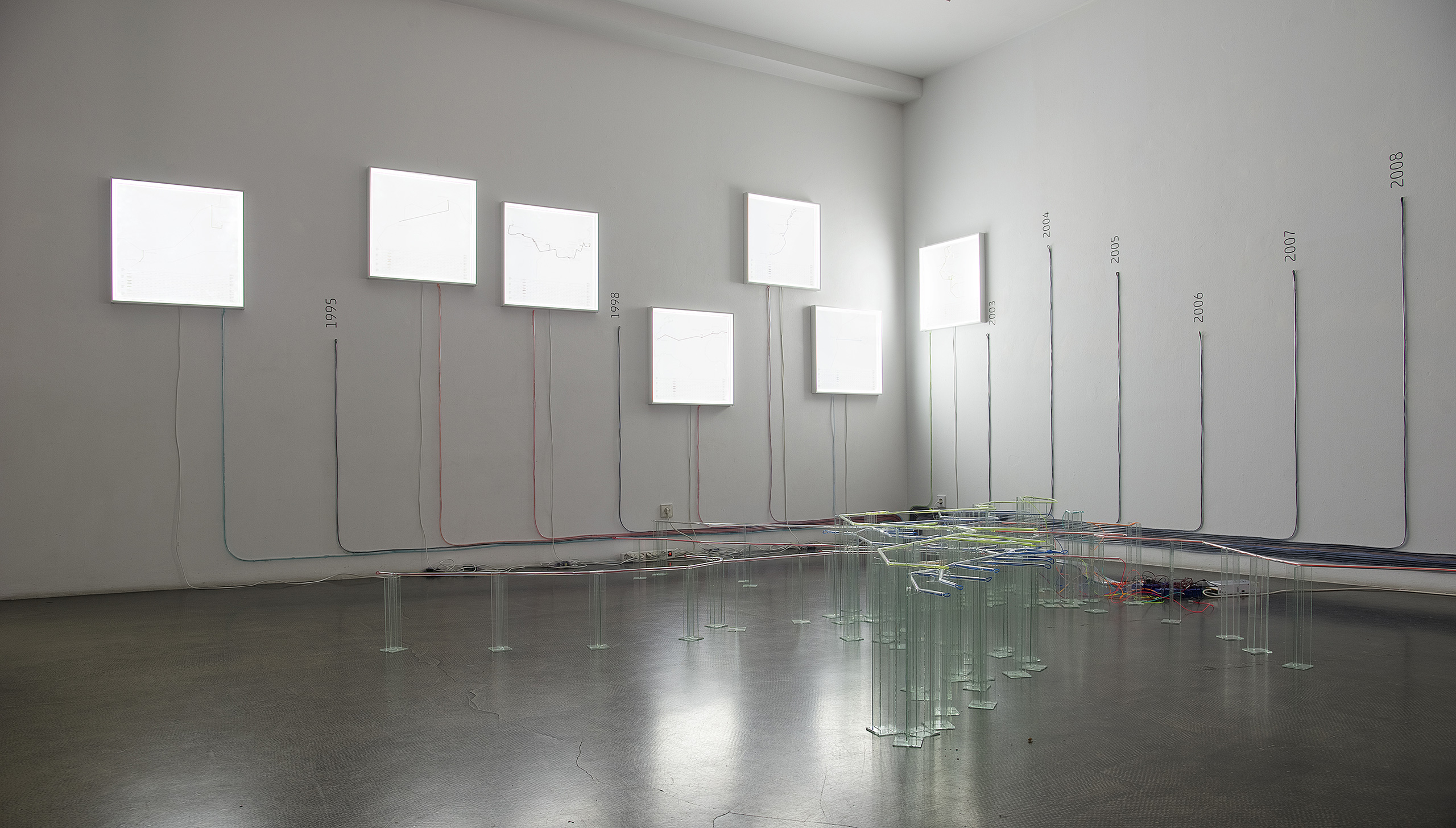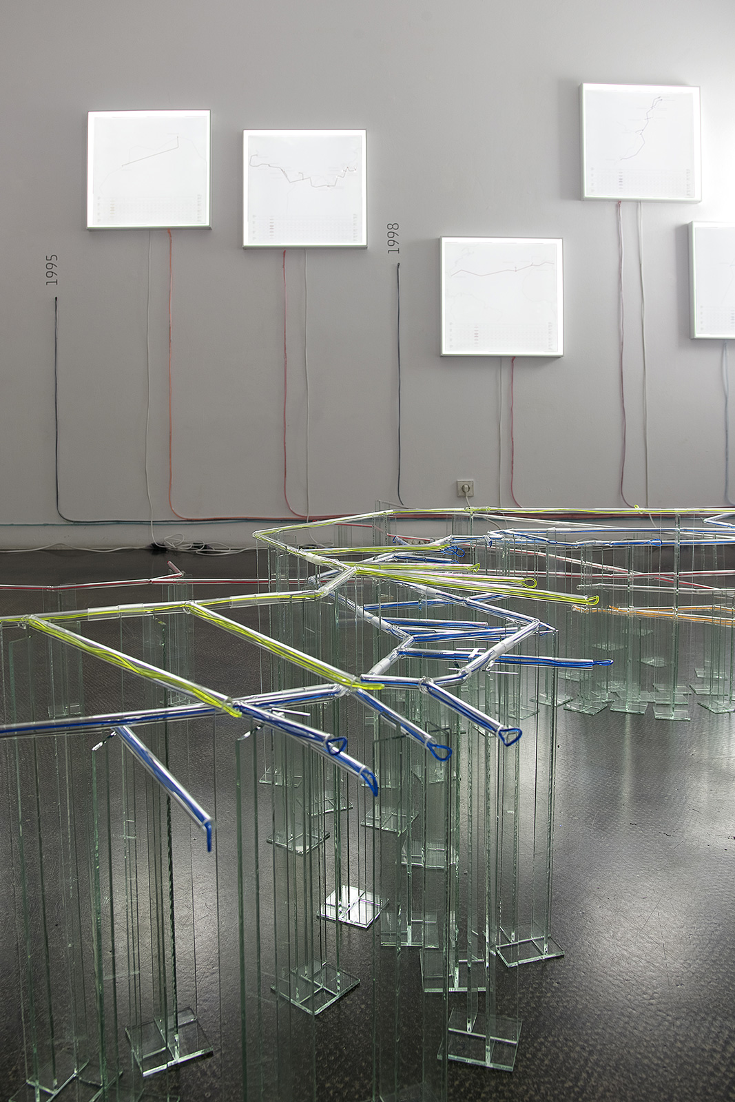 The exhibition space becomes a large installation of coloured electroluminescent cable tubes (according to their year of implantation) arranged horizontally and at different heights on the floor of the room, which three-dimensionally trace the underwater layout of the twenty-one submarine cables that connect our geography with the rest of the planet. All the cables implanted in the same year have a similar colour, for quick identification, and are constructed with a transparent glass tube through which a line of light circulates; a rhizome of coloured threads with a dynamic flow of intensity and fluctuation.