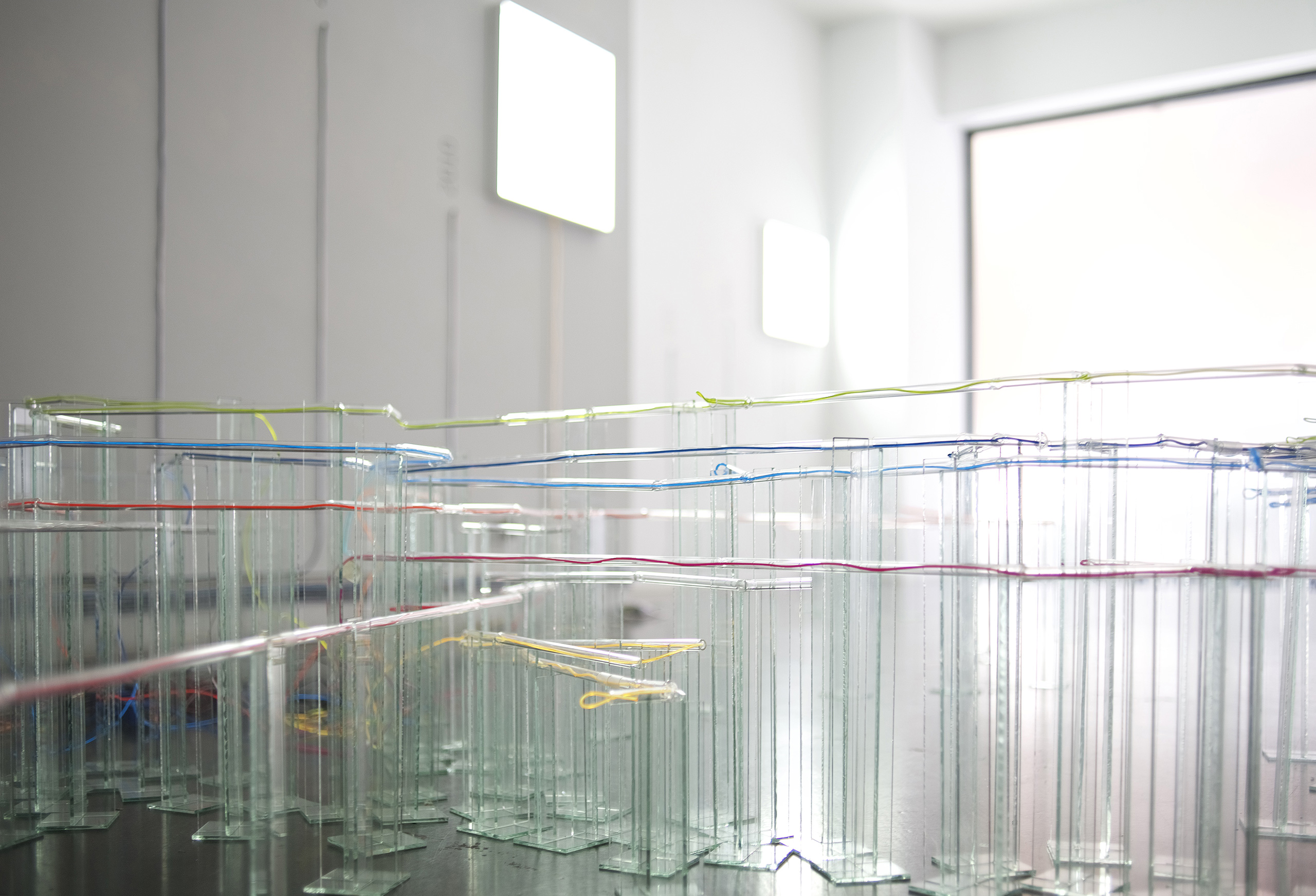 Floor installation: Multimedia sculptural installation made of borosilicate tube, float glass, coloured electroluminescent cable, sound, 600 x 275 x 50 cm (h)