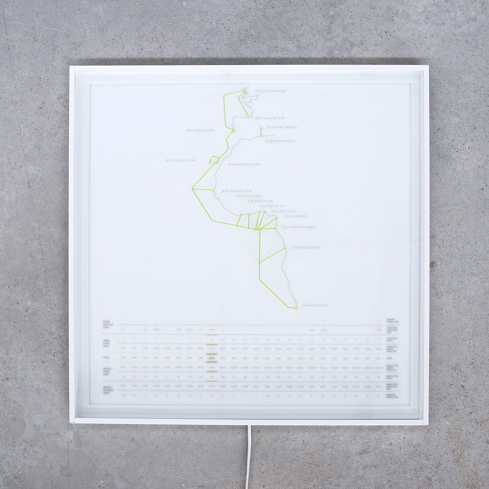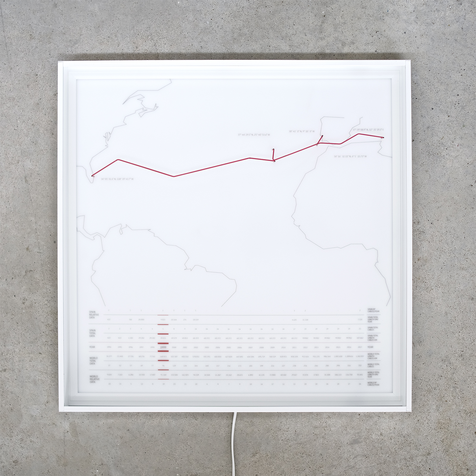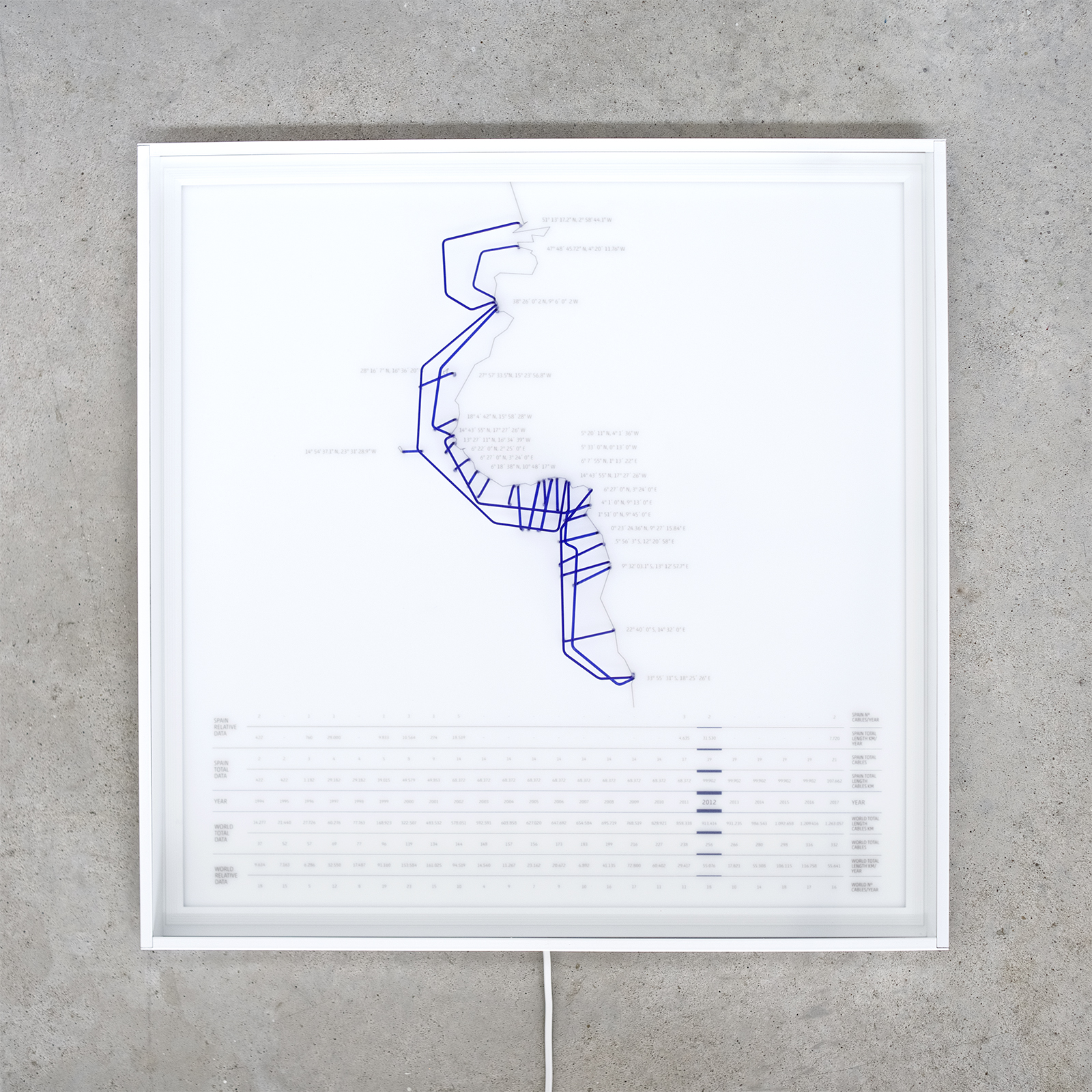 Liquid Mapping: Connected to..., represents the cartography of how Spain's geography is connected to the rest of the planet through submarine cabling, the information highways of the 21st century. Ninety-nine percent of Internet traffic circulates through a network of cables, invisible to our eyes, which weaves the seabed of the oceans and allows data to be transmitted in real time. Like a network of underwater arteries, this aquatic mapping, imperceptible to the naked eye, functions as the great information highways of the 21st century. These arteries are constructed of thin glass threads capable of transporting large packets of information.
